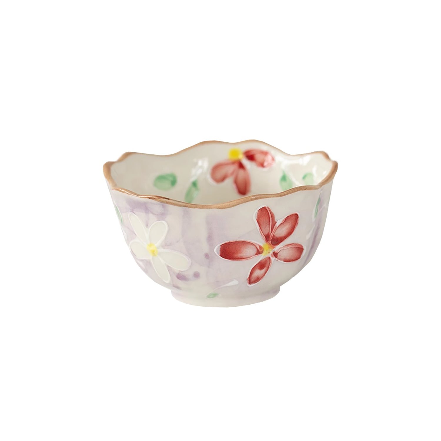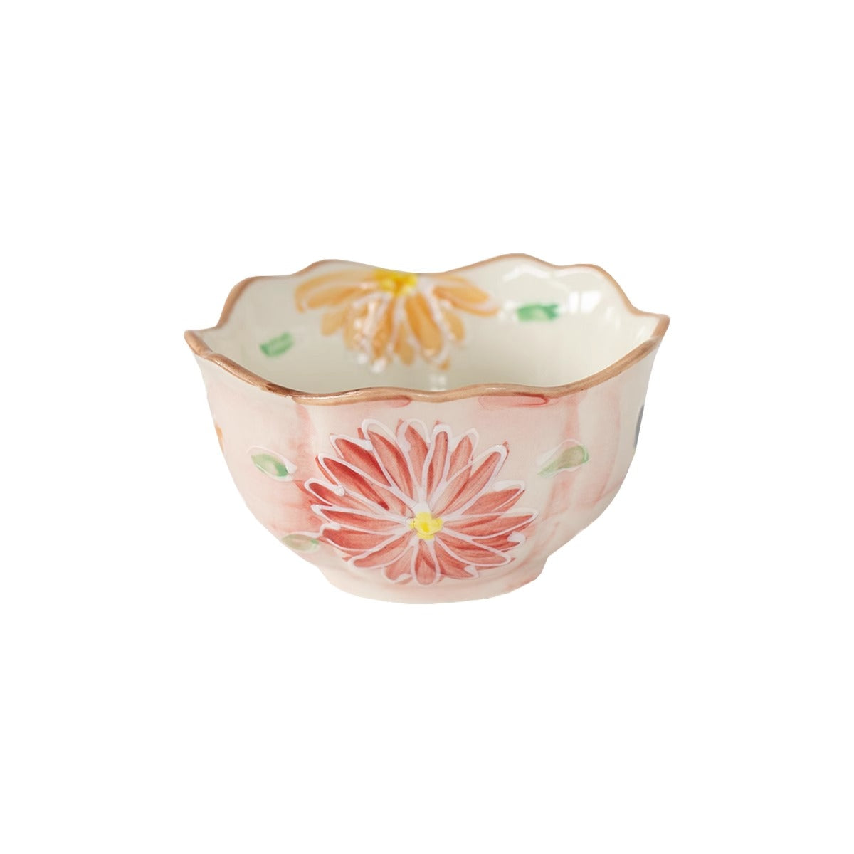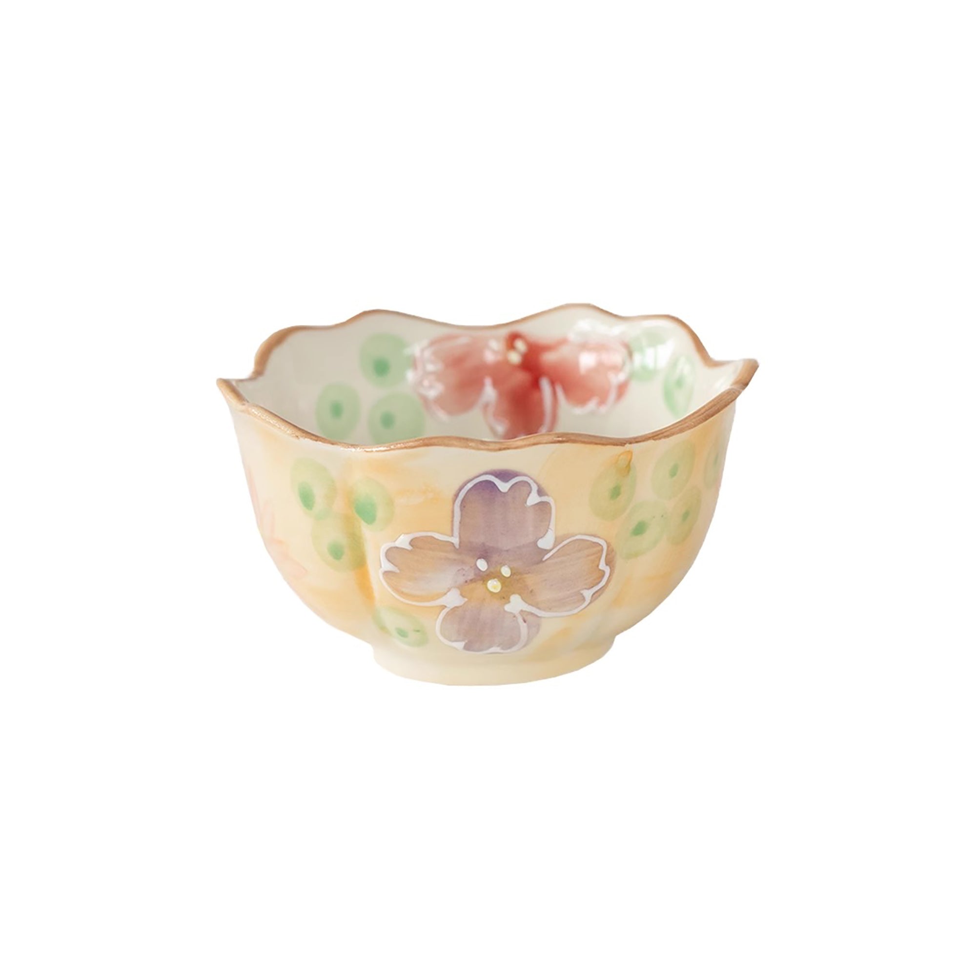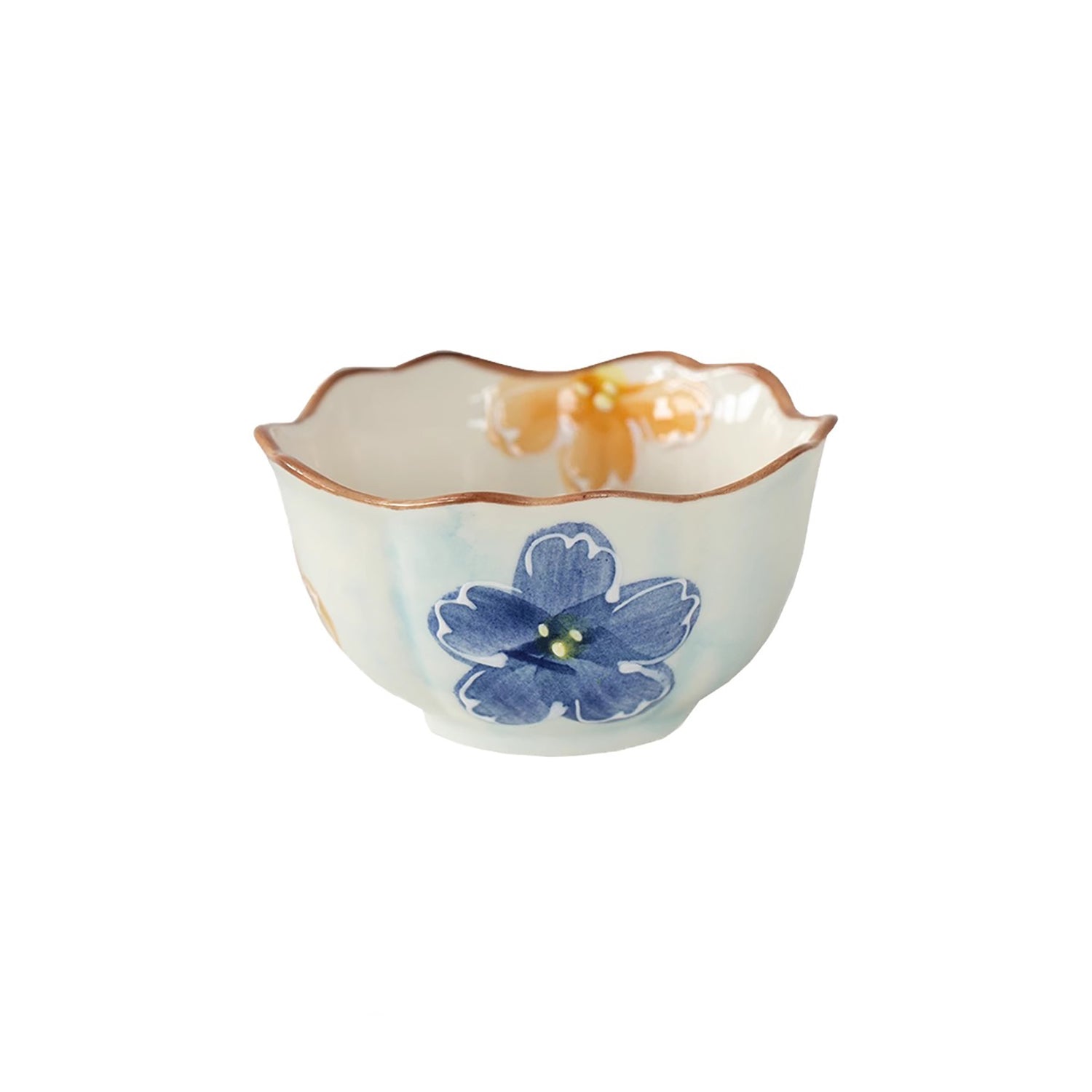 Ce petit bol en céramique, fabriqué à Jingdezhen selon la technique traditionnelle de glaçure sans plomb cuite à haute température, adopte une forme délicate de fleur avec des bords ondulés. L’intérieur et l’extérieur sont décorés de fleurs peintes à la main, apportant une touche printanière à votre table. Le bord brun souligne son charme vintage. Parfait pour servir des sauces, des fruits ou des amuse-bouches, ce bol est à la fois pratique et décoratif.