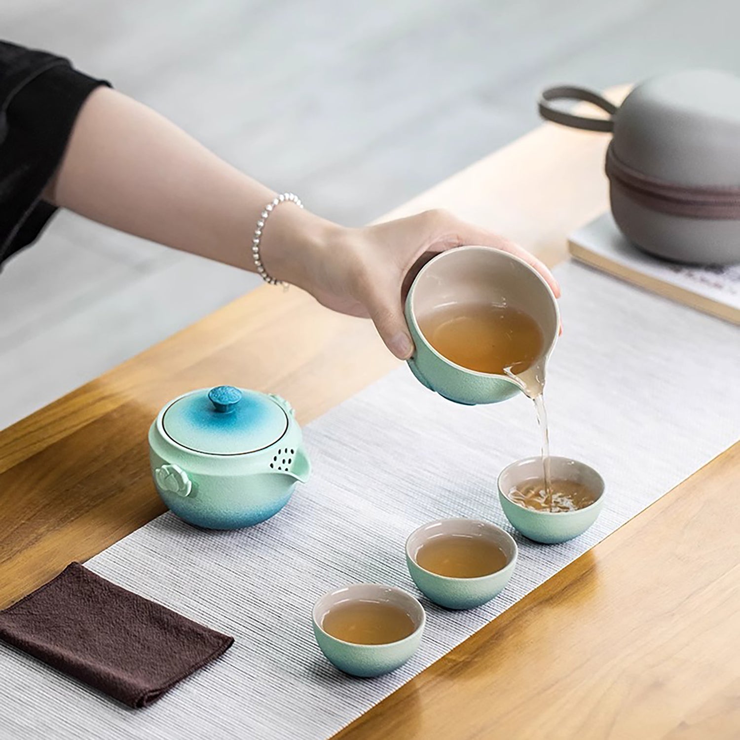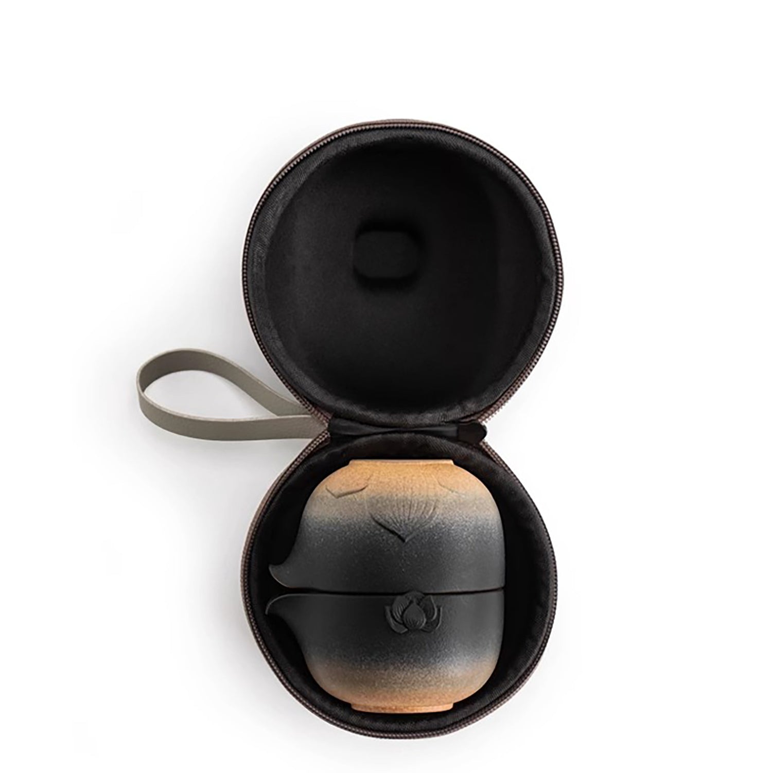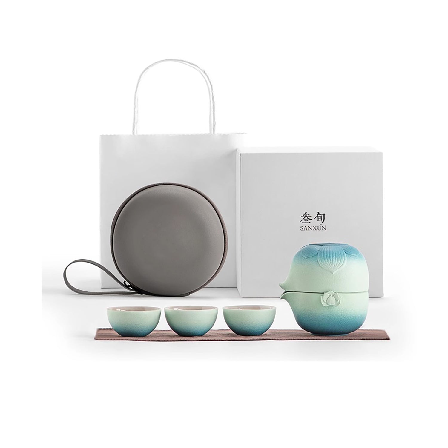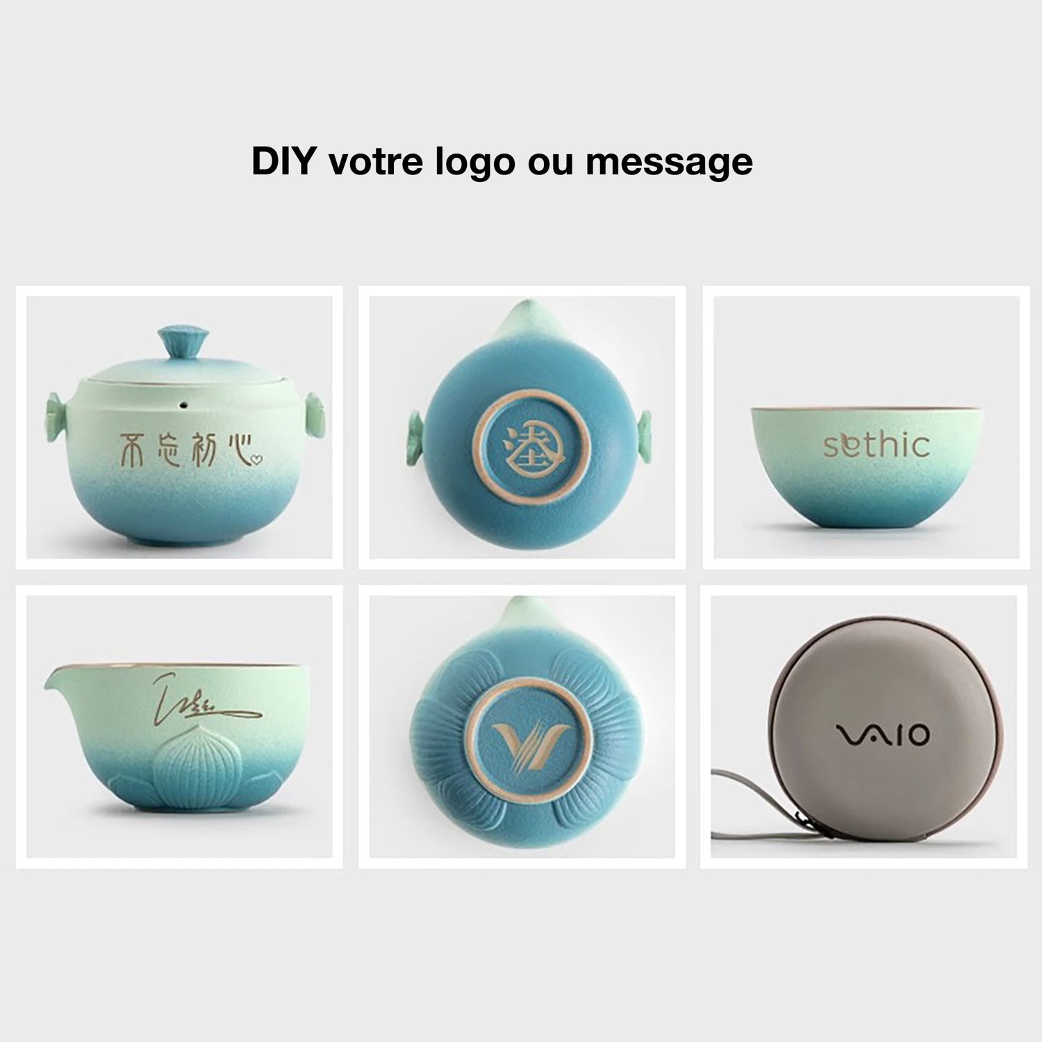 This Jingdezhen Gongfu Travel Tea Set is made of high-quality ceramic, with a lightweight and ergonomic teapot, perfectly designed to be held in one hand. The body of the cup is decorated with a hand-crafted gradient glaze, bringing a touch of rustic authenticity and a natural artistic feel. This compact all-in-one set includes a teapot and three cups, providing an ideal setup for enjoying tea anytime, anywhere. Personalize it by engraving your own logo or text. Delivered in an elegant box, it is perfect for personal use or as a gift.