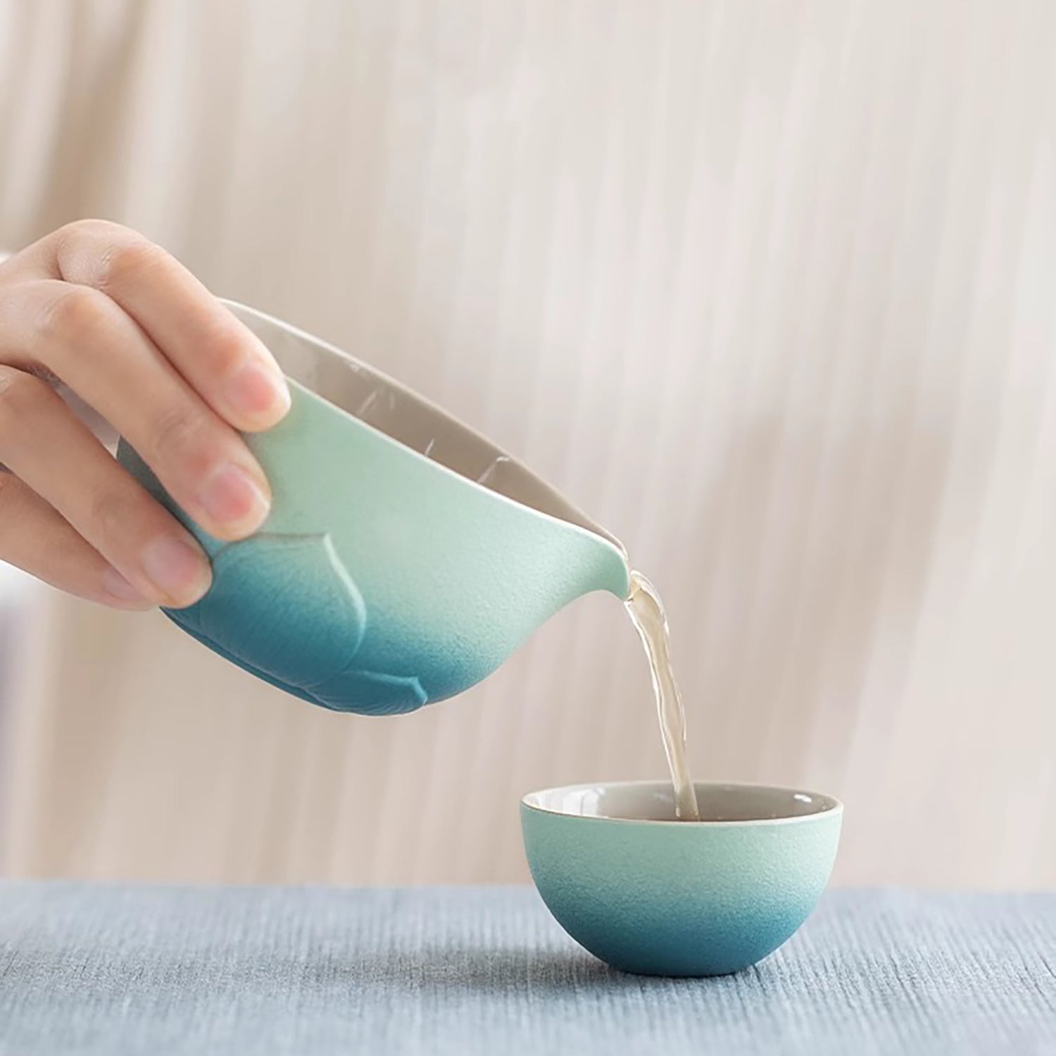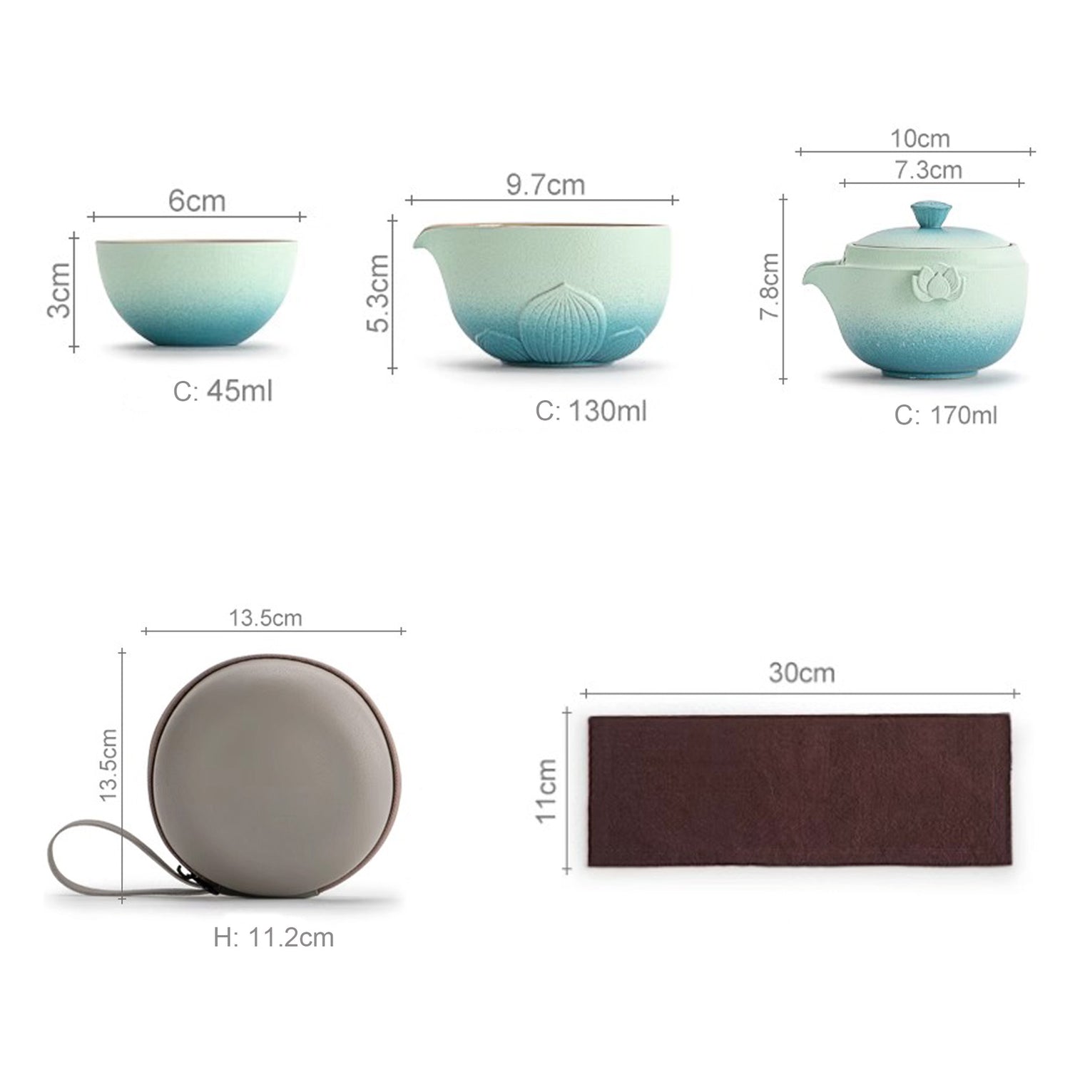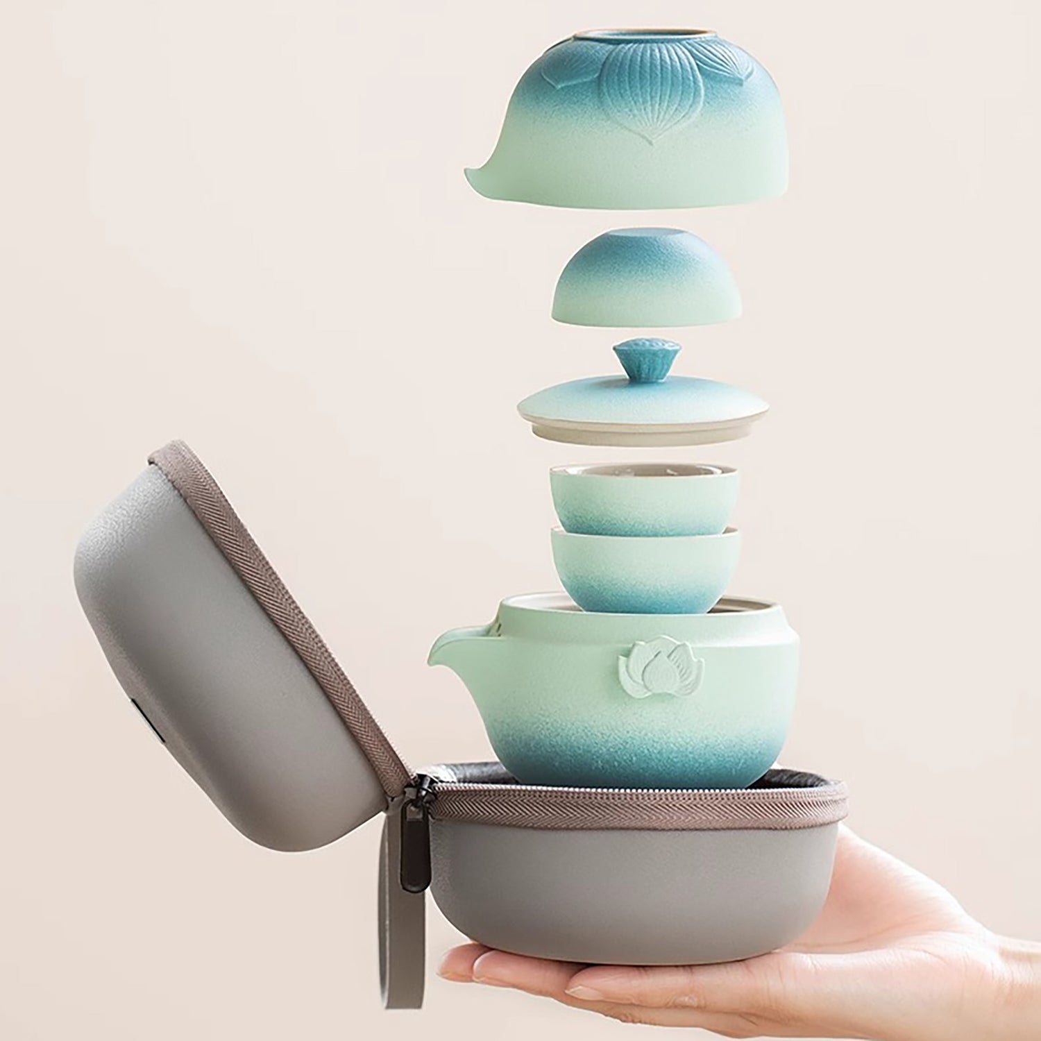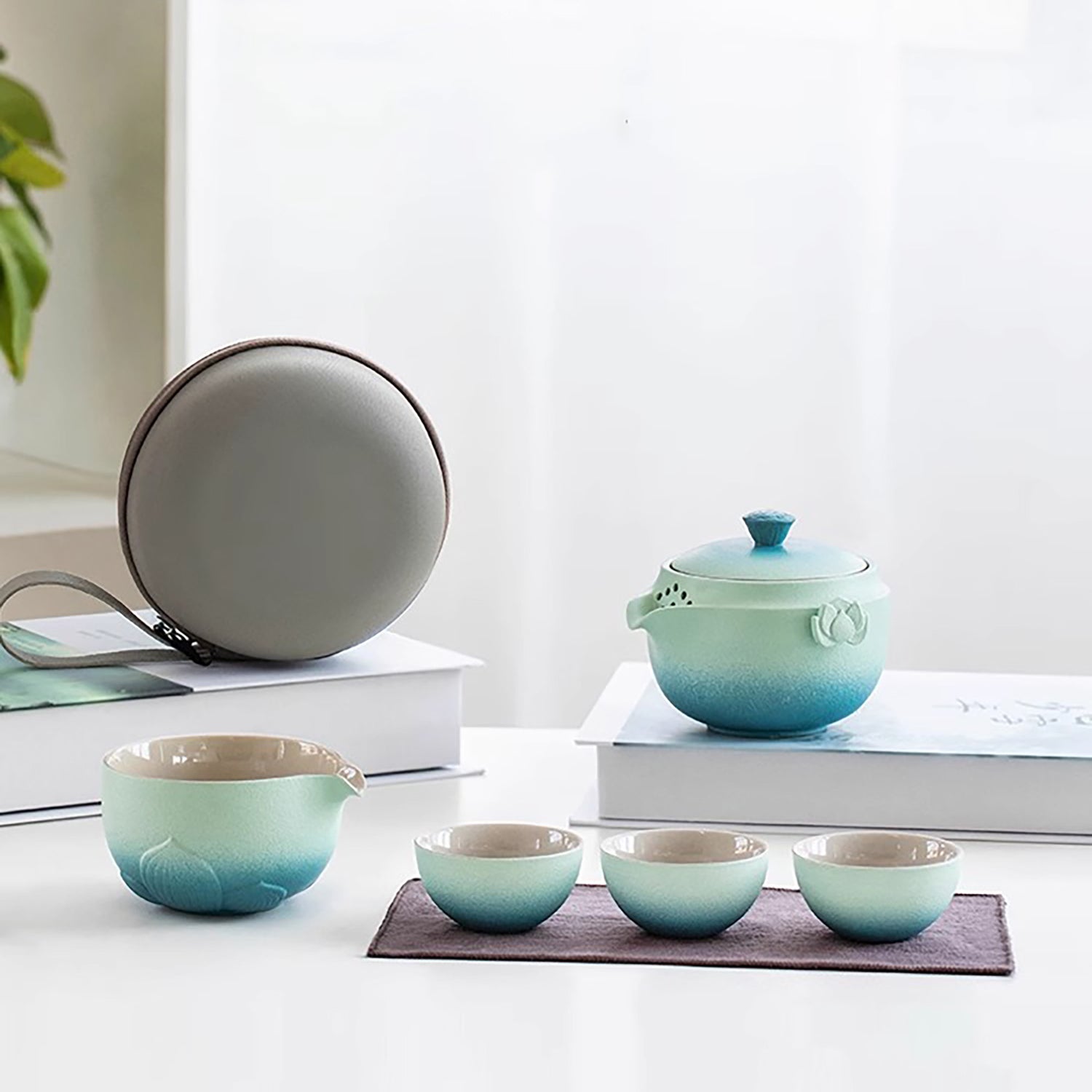 This Jingdezhen Gongfu Travel Tea Set is made of high-quality ceramic, with a lightweight and ergonomic teapot, perfectly designed to be held in one hand. The body of the cup is decorated with a hand-crafted gradient glaze, bringing a touch of rustic authenticity and a natural artistic feel. This compact all-in-one set includes a teapot and three cups, providing an ideal setup for enjoying tea anytime, anywhere. Personalize it by engraving your own logo or text. Delivered in an elegant box, it is perfect for personal use or as a gift.