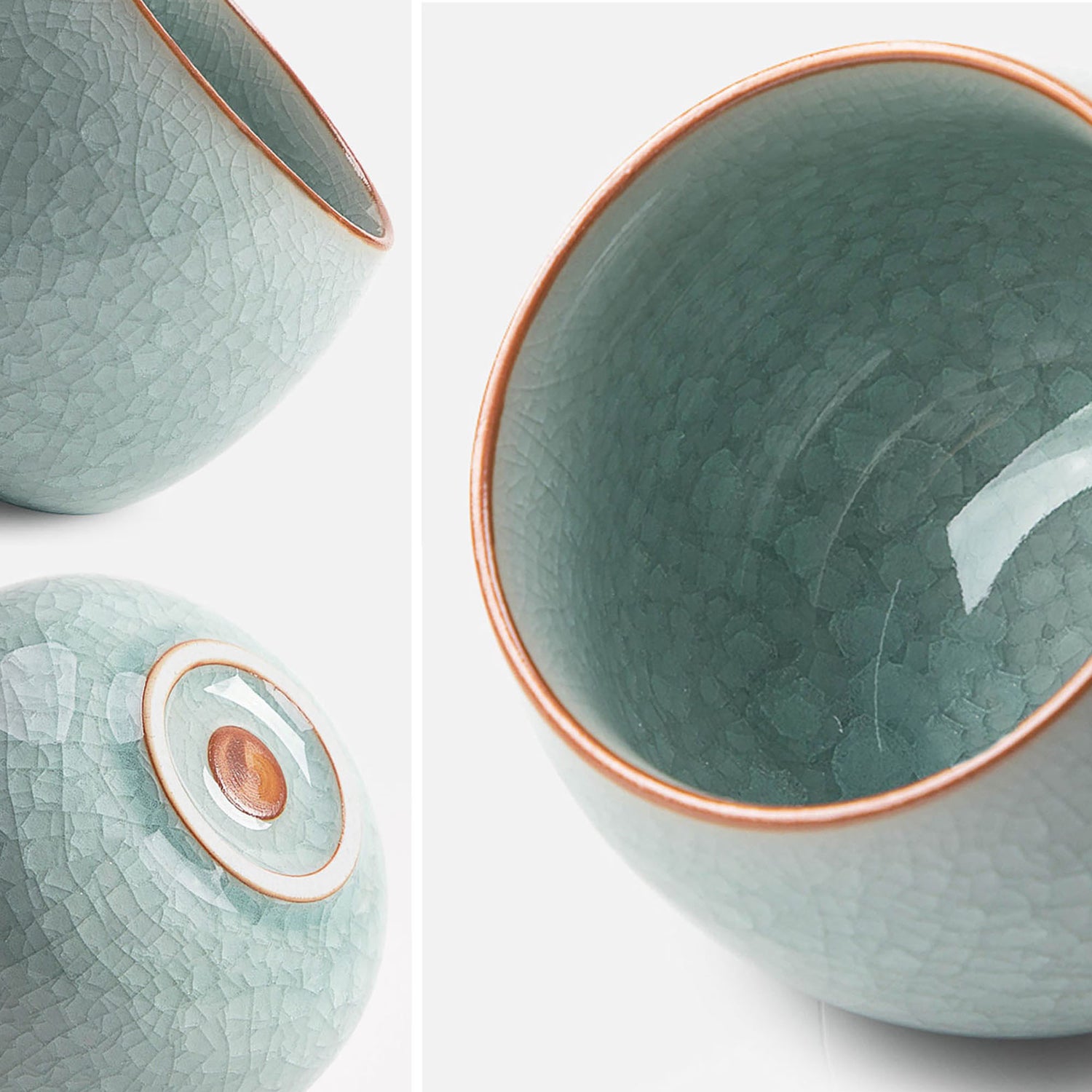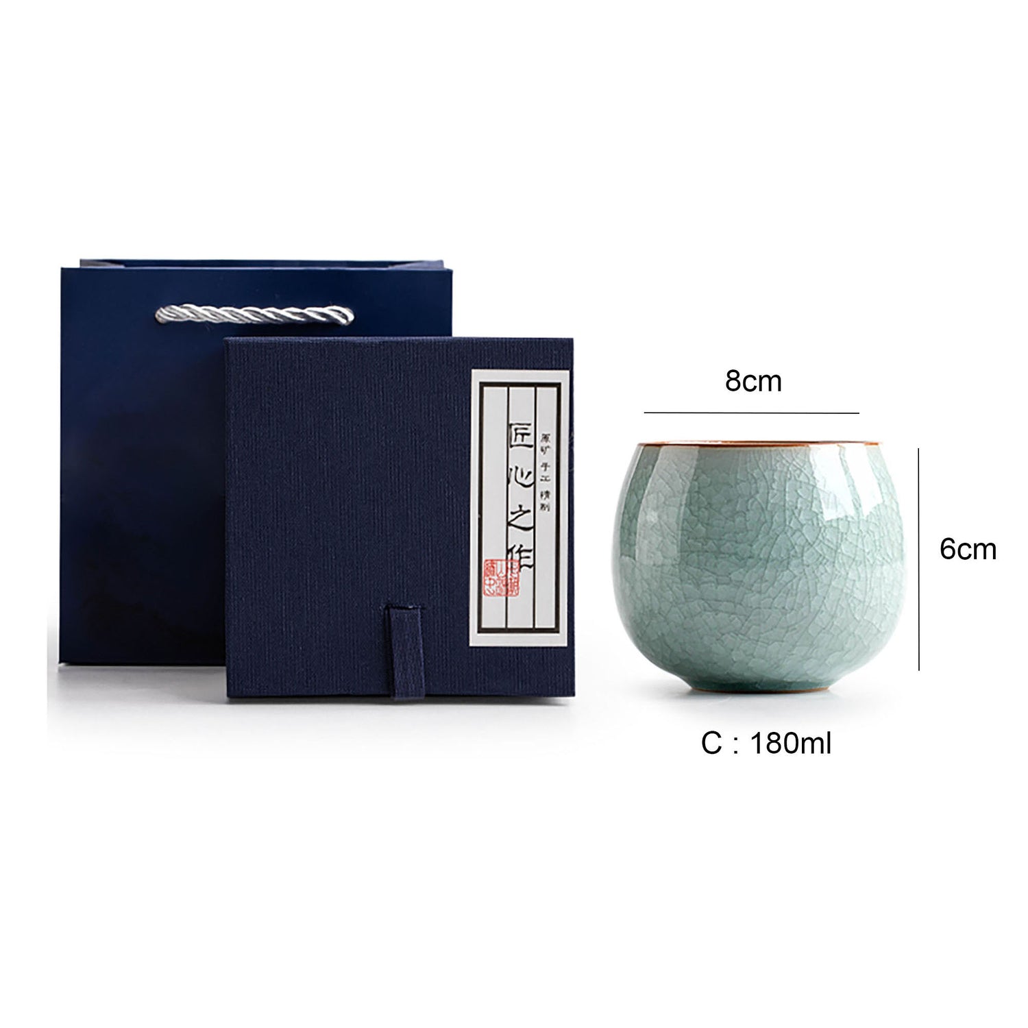 This celadon master teacup, handmade in Jingdezhen, uses the "crackle ice" glaze technique to preserve the authentic appearance of the celestial Ru celadon. The design is inspired by the four classic master cup shapes, offering a comfortable grip and refined aesthetics. Presented in an elegant box, it is perfect for personal use or as a distinguished gift, harmoniously combining tradition and refined taste.