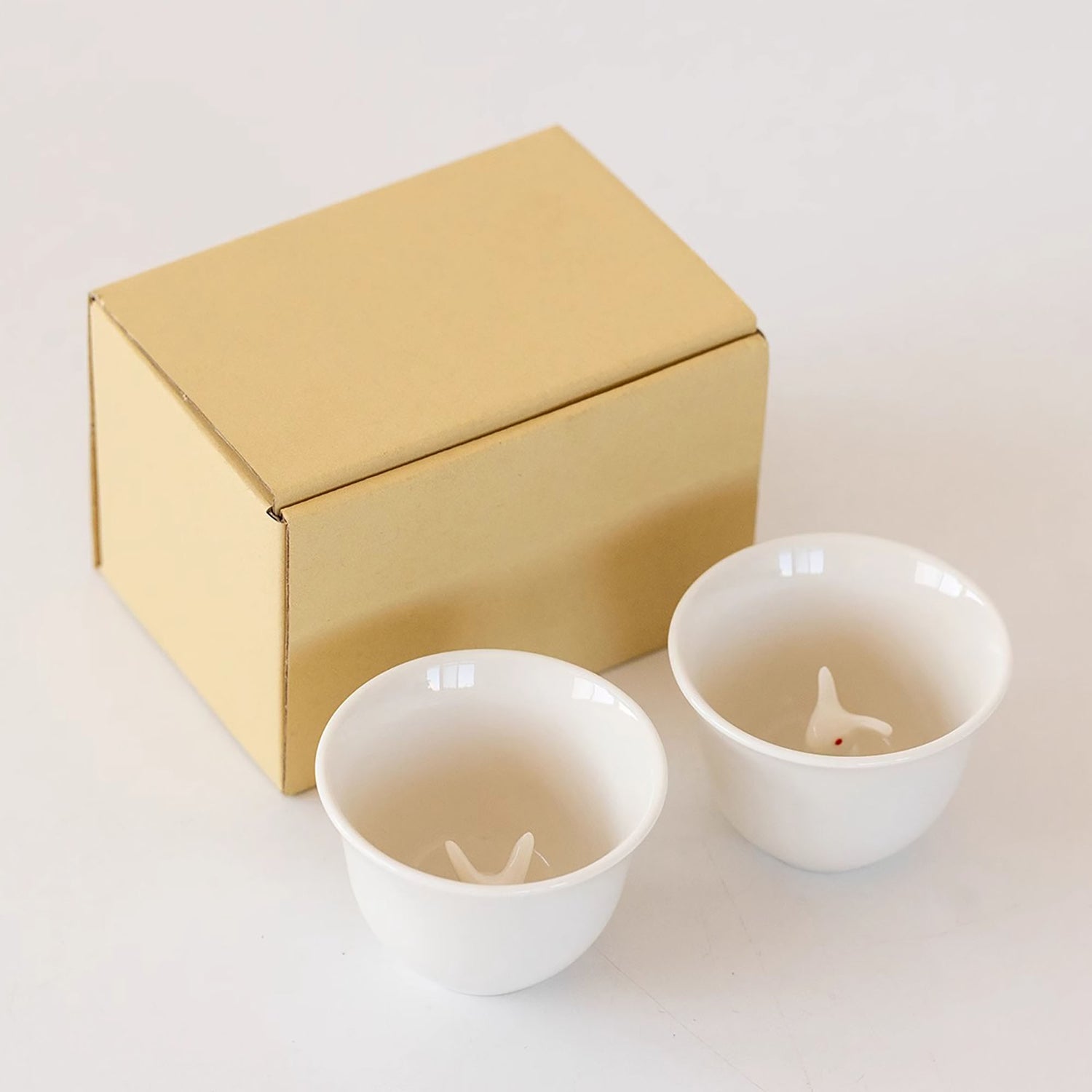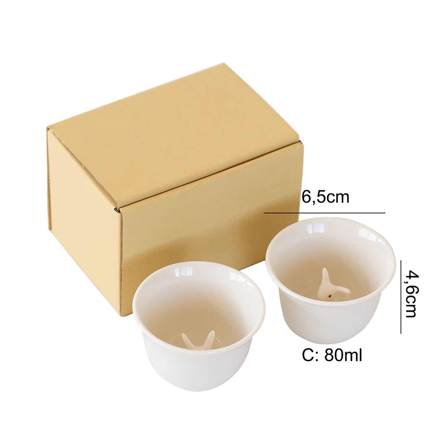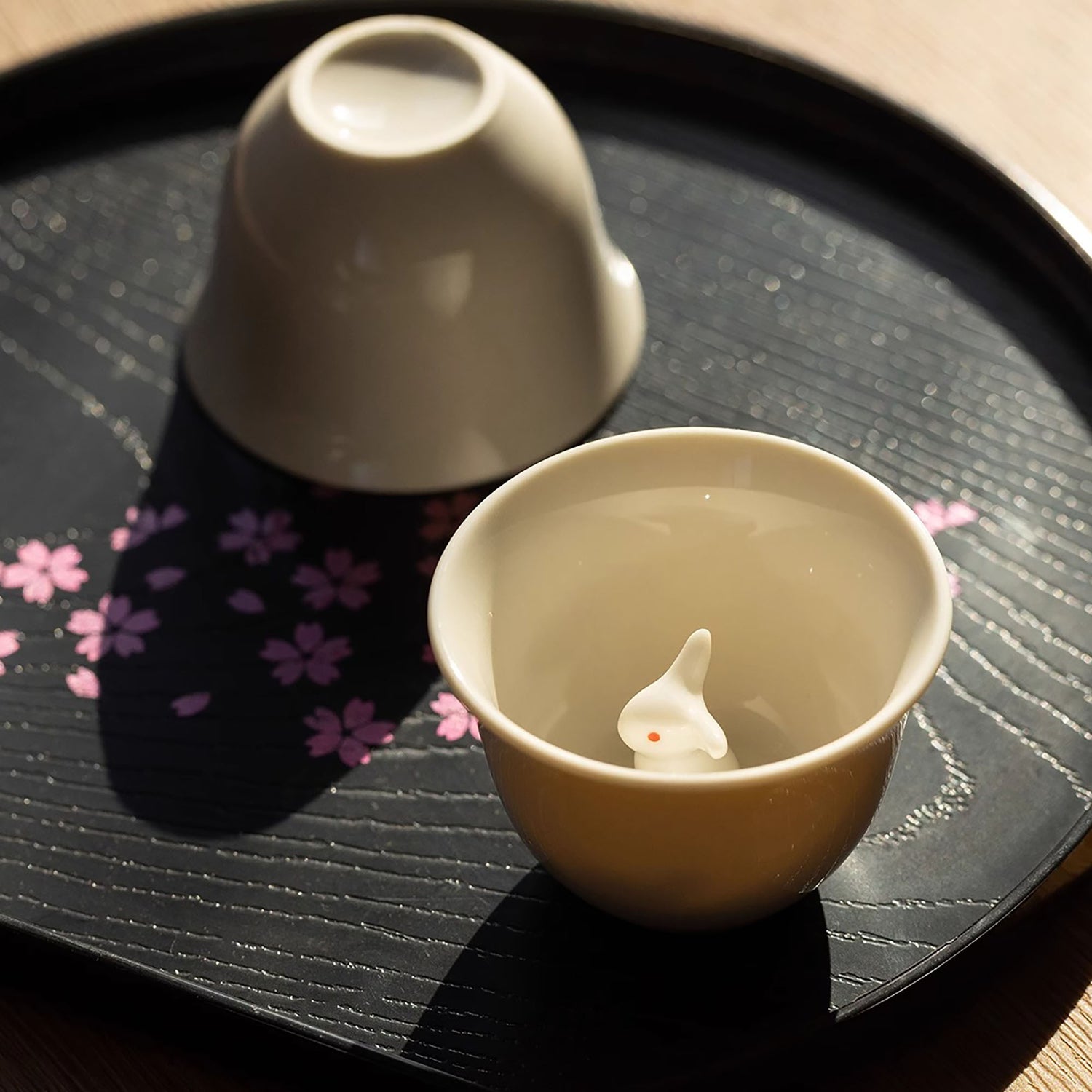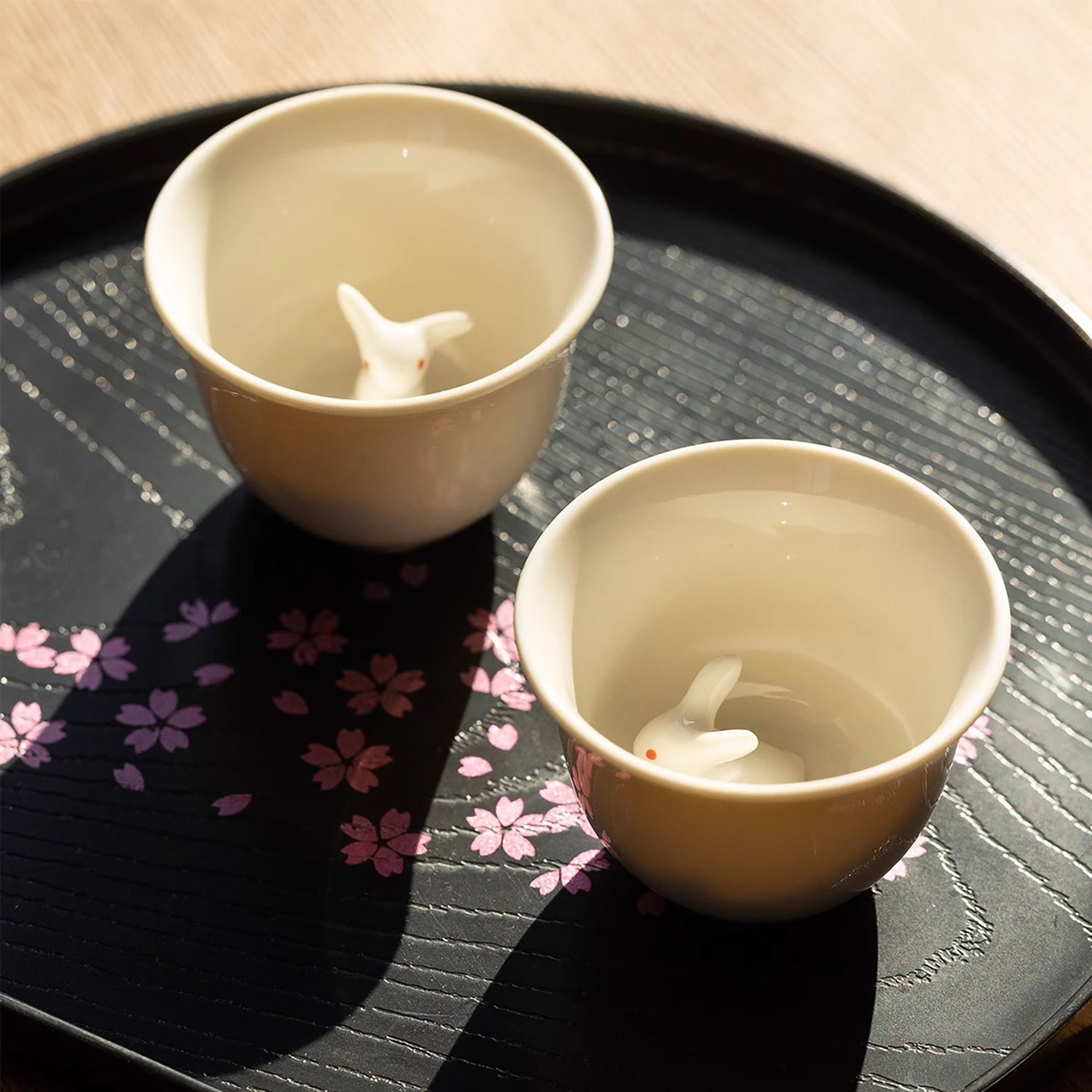 Discover these elegant white porcelain sake cups, from the Mino-yaki tradition, enhanced by a charming rabbit embossed inside each cup. Two adorable rabbit postures – standing and lying – add a playful and lively touch to your table.