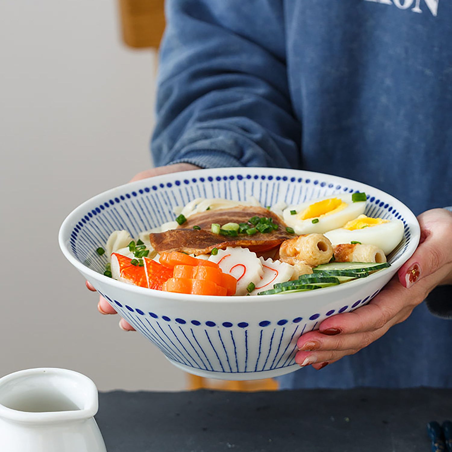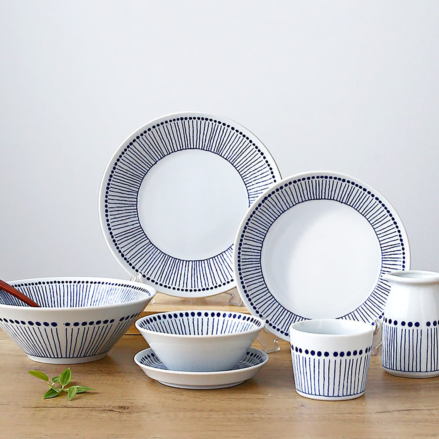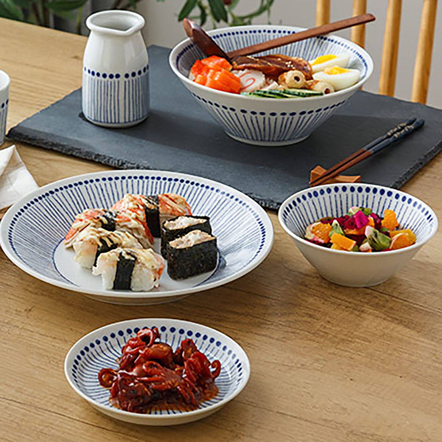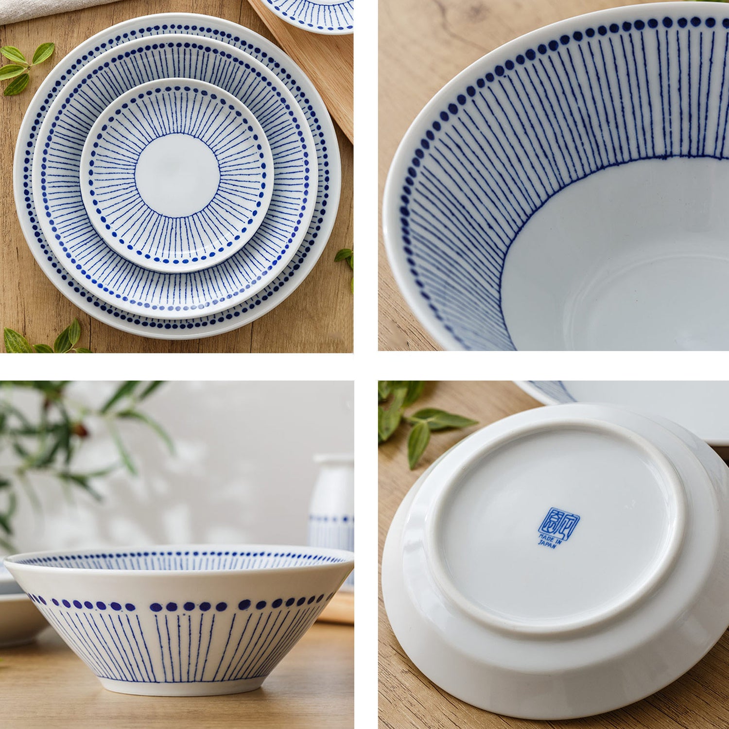 This handcrafted ceramic dinnerware set from Mino-yaki includes rice bowls, plates of different sizes and tea cups. Their minimalist hand-drawn watergrass pattern with shades of blue brings an authentic touch to your table, perfectly suited to traditional Japanese dishes. These practical and aesthetic pieces embody the charm of traditional Japanese craftsmanship, to make your meals even more pleasant and enriching.