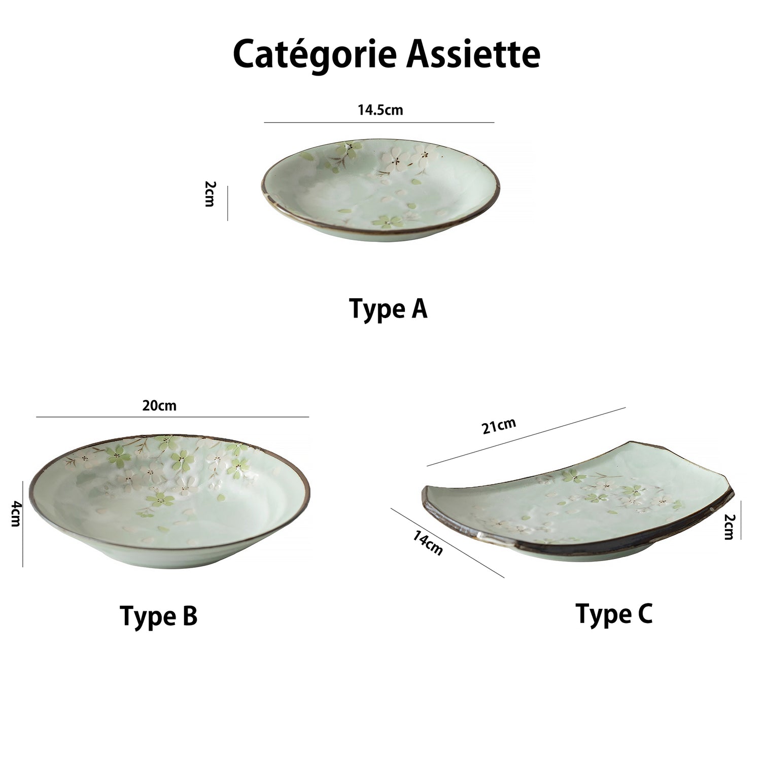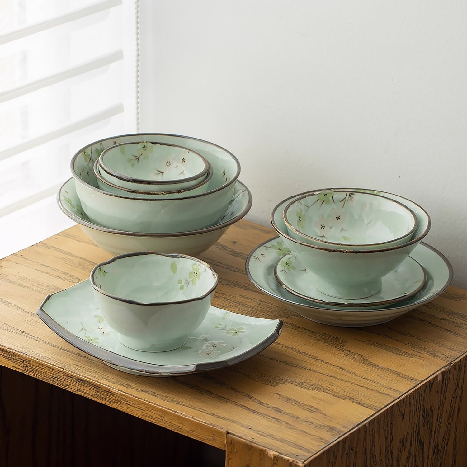 La vaisselle en céramique japonaise Minoyaki Sakura d’automne se distingue par ses nuances vert pâle et blanc, rehaussées de délicats motifs de fleurs de cerisier en relief. Chaque pièce reflète la douceur de l’automne japonais, mêlant raffinement artisanal et élégance naturelle. Réalisée selon les techniques traditionnelles du Minoyaki, cette collection apporte une touche poétique et apaisante à chaque repas.