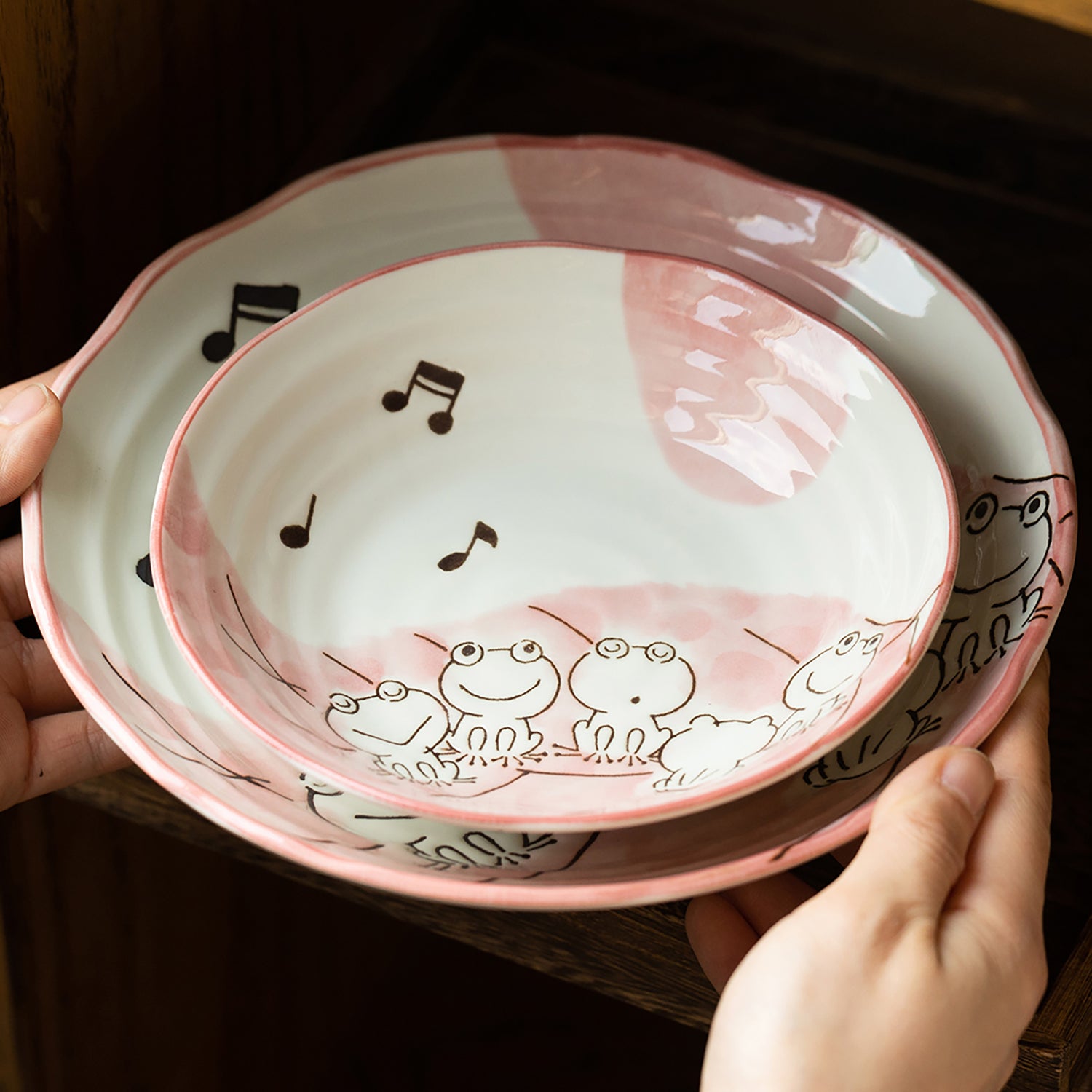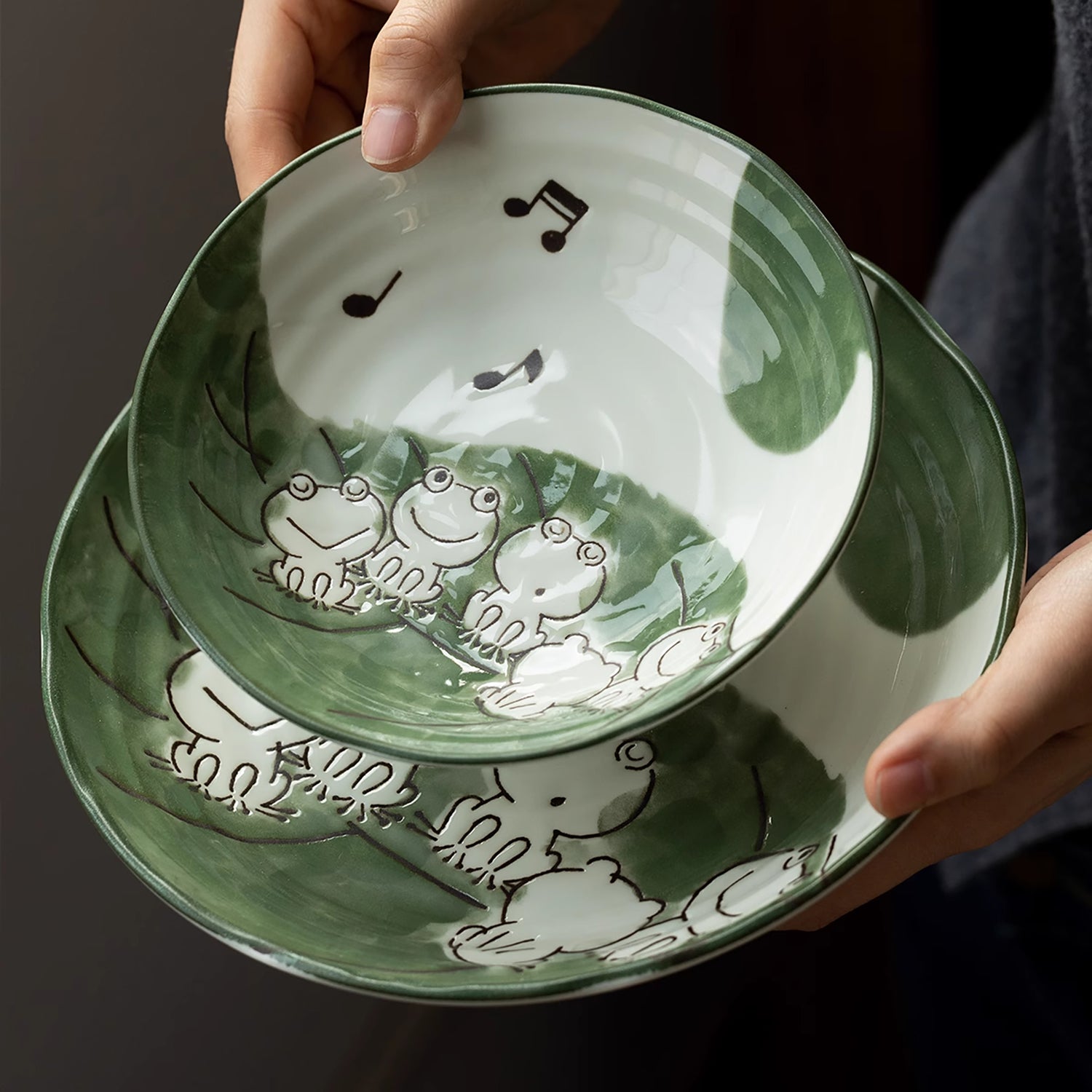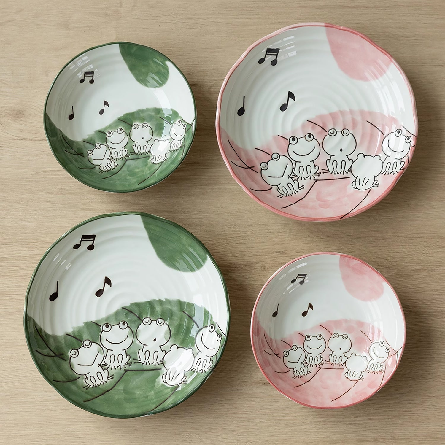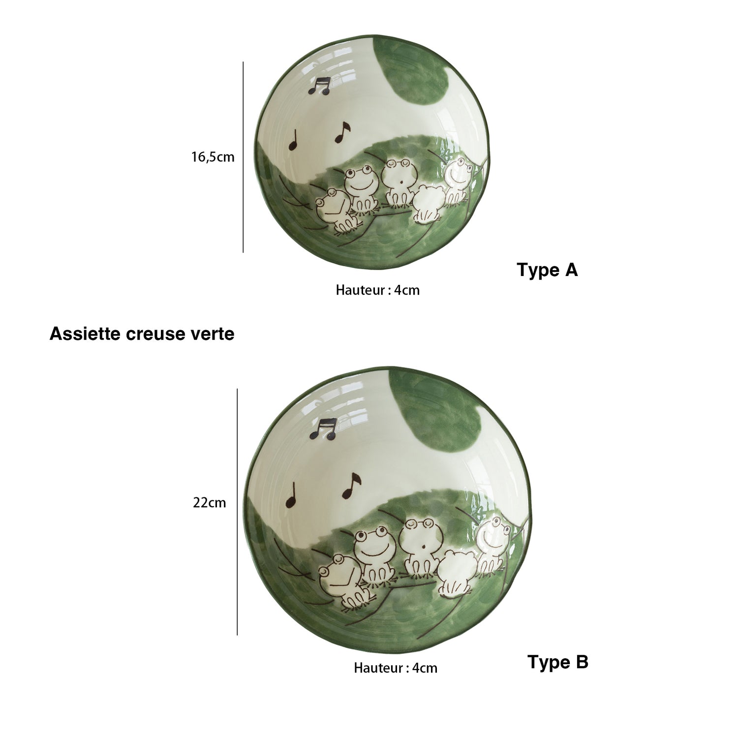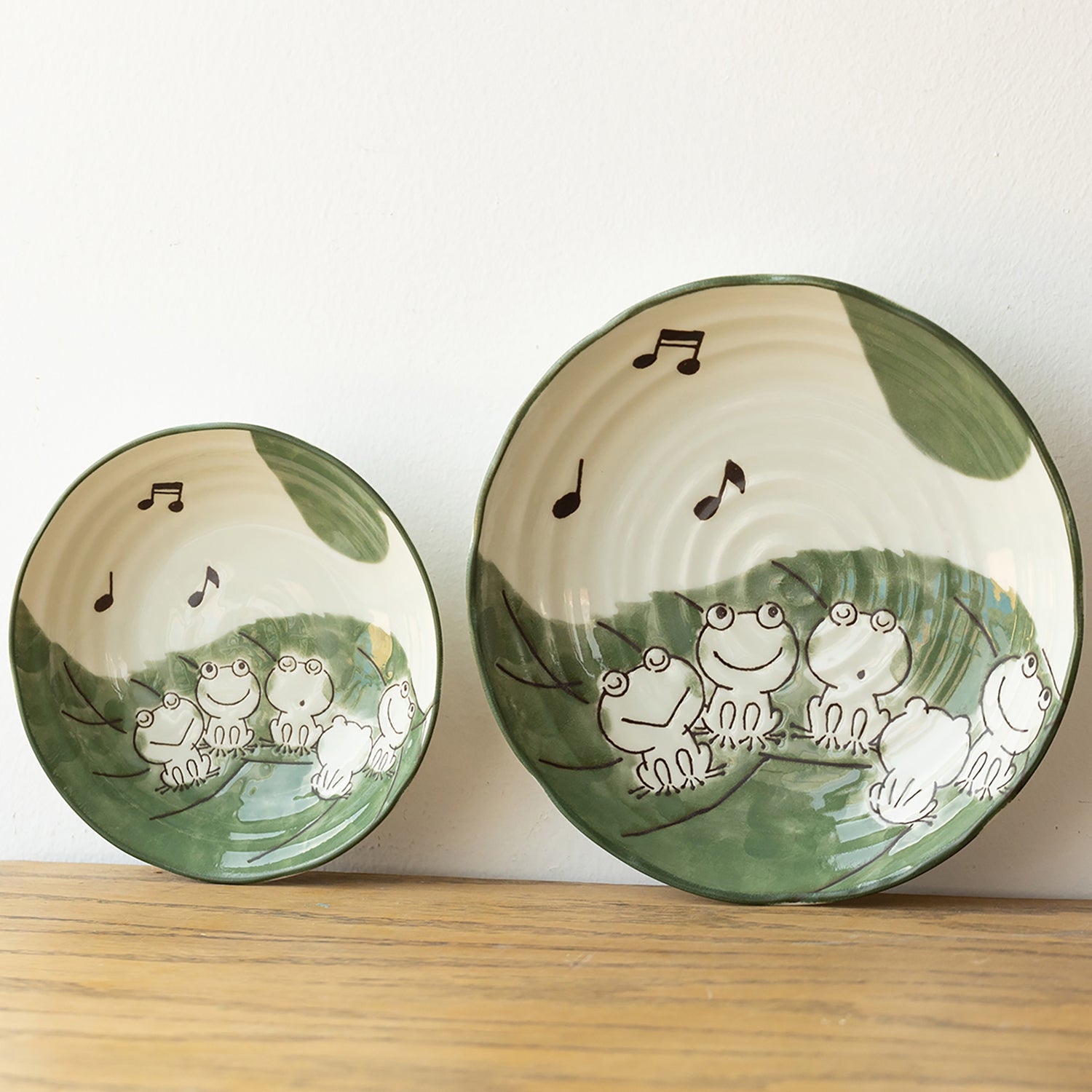 Cet adorable assiette creuse en céramique, fabriqué dans la région de Mino au Japon, présente deux motifs charmants de grenouille, ajoutant une touche ludique à l'ensemble du assiette. Chaque repas devient une expérience joyeuse en compagnie de ces deux adorables petits grenouilles, apportant une chaleur japonaise à votre table.
