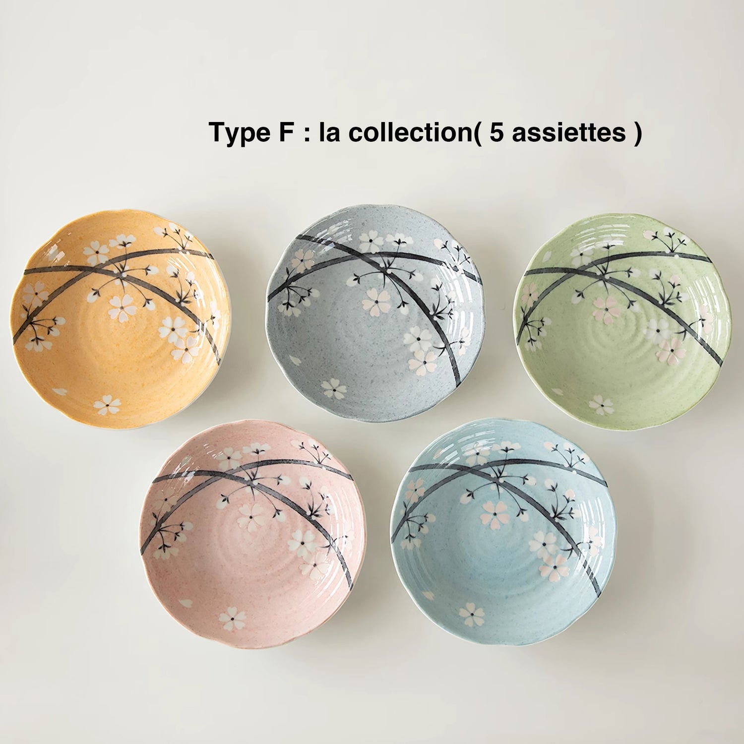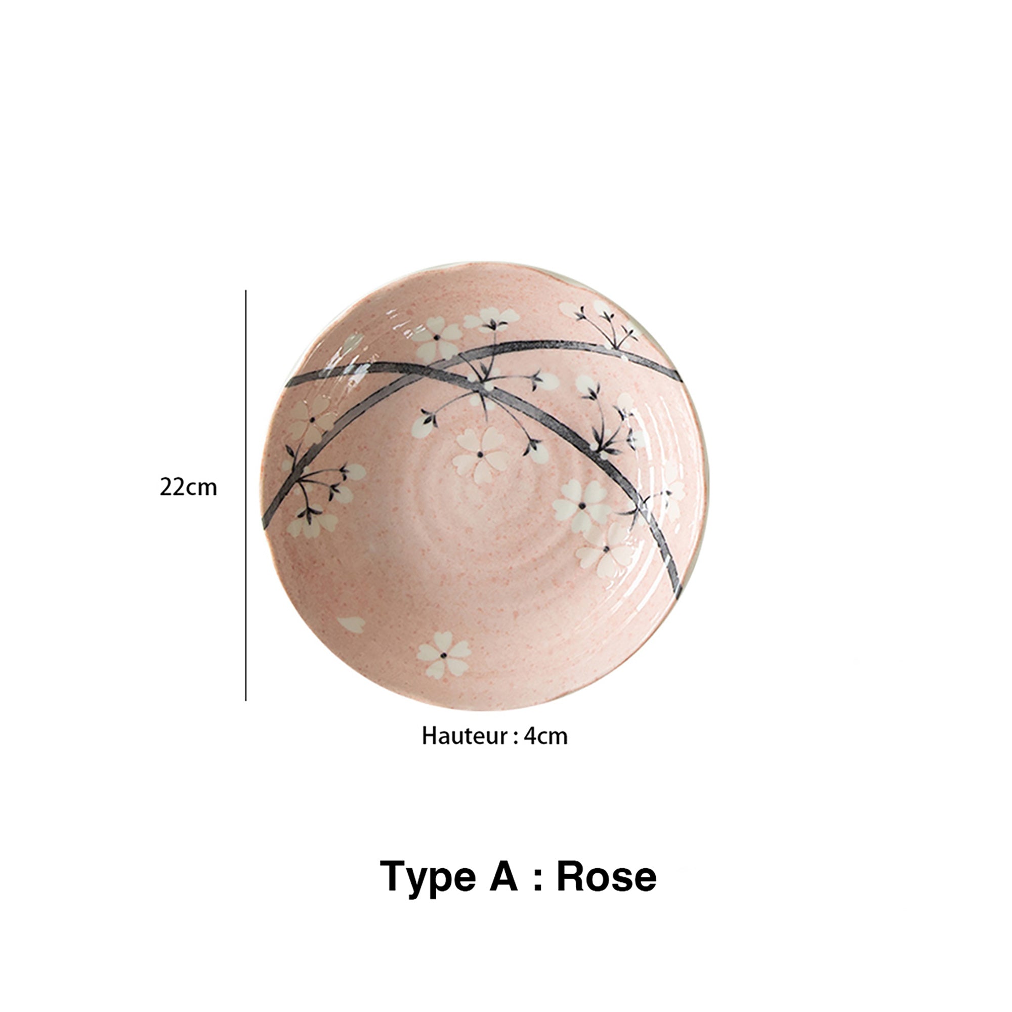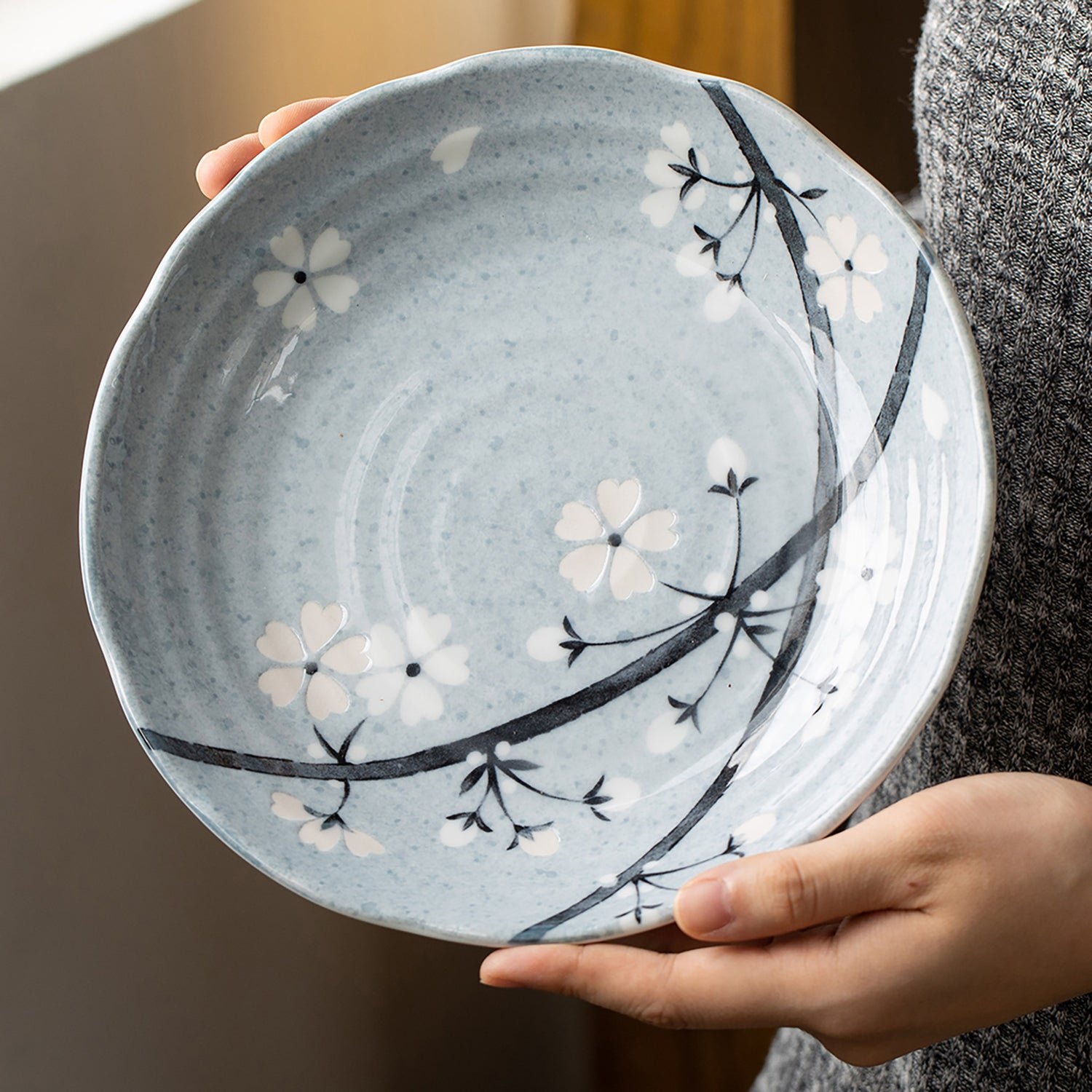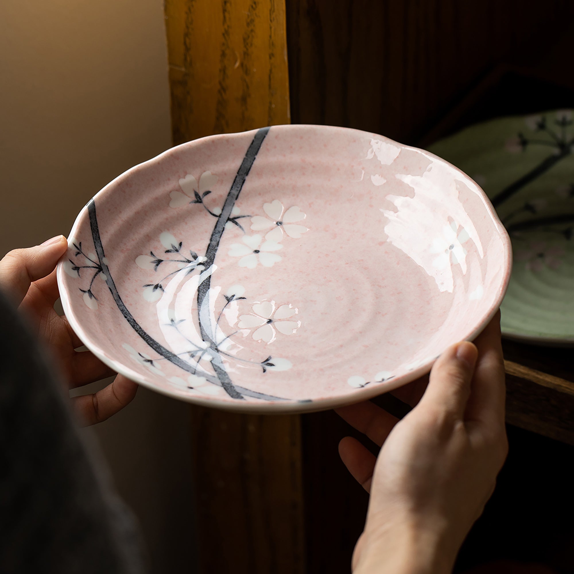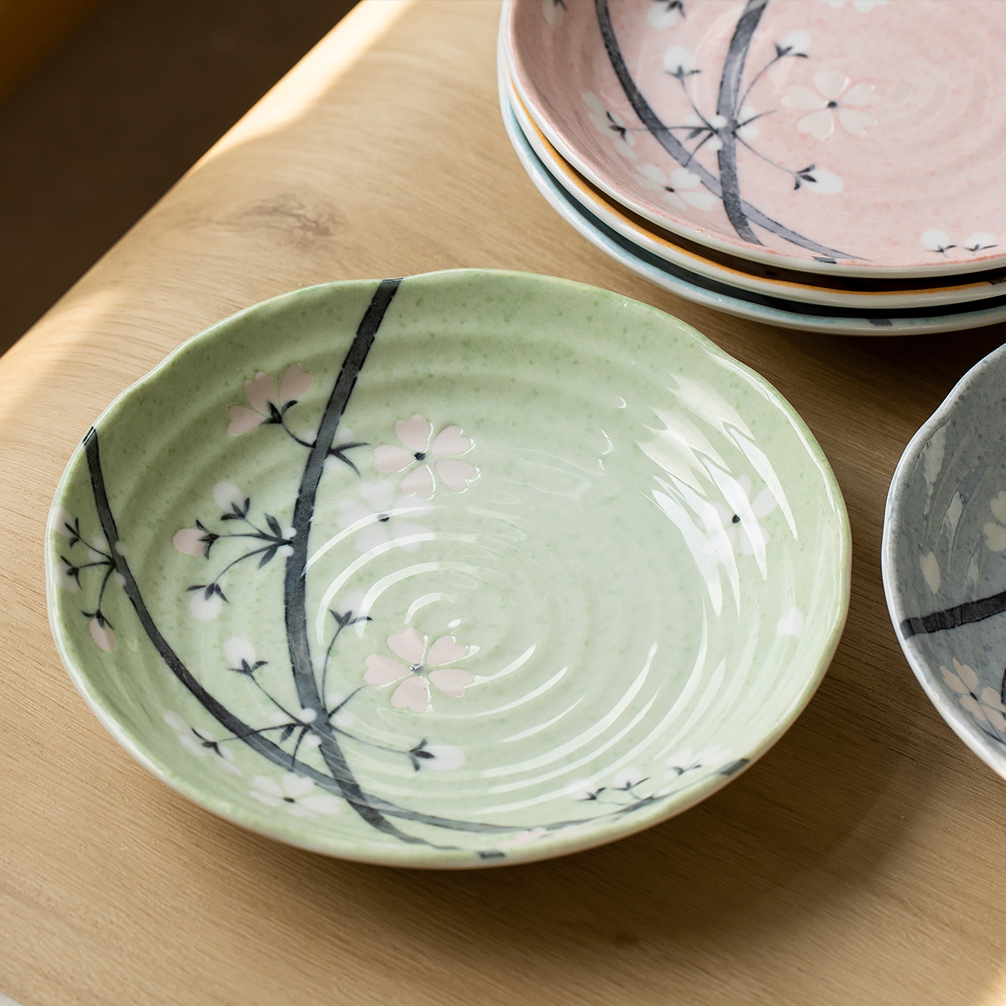 Cette assiette en céramique, fabriqué dans la région de Mino, est décoré de motifs colorés de cerisiers en fleurs. Il ajoute une ambiance romantique japonaise à votre table. Chaque motif de cerisier semble raconter une histoire de printemps, rendant vos repas chaleureux et agréables. Non seulement esthétique, ce plateau est également pratique, en faisant un élément indispensable pour votre table.