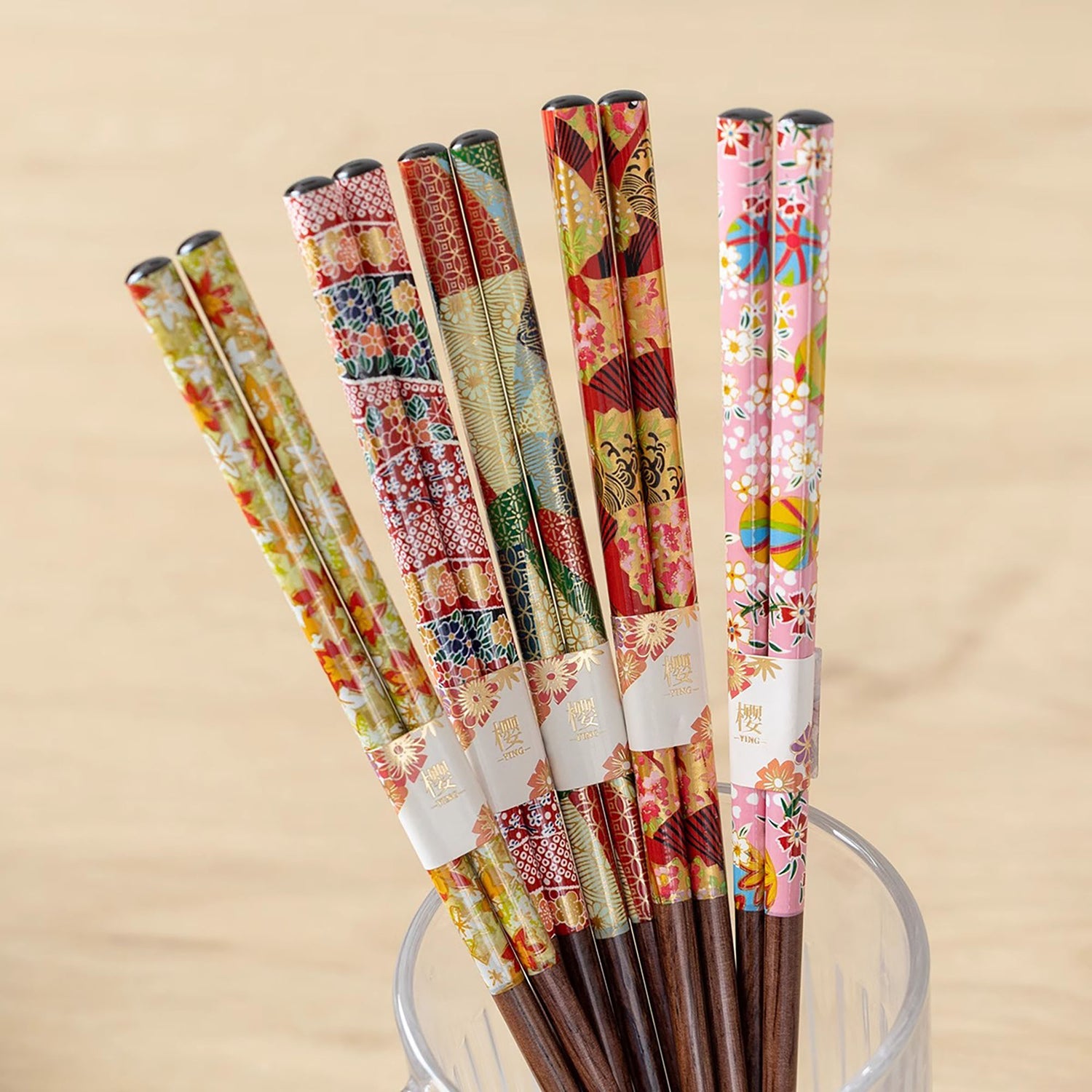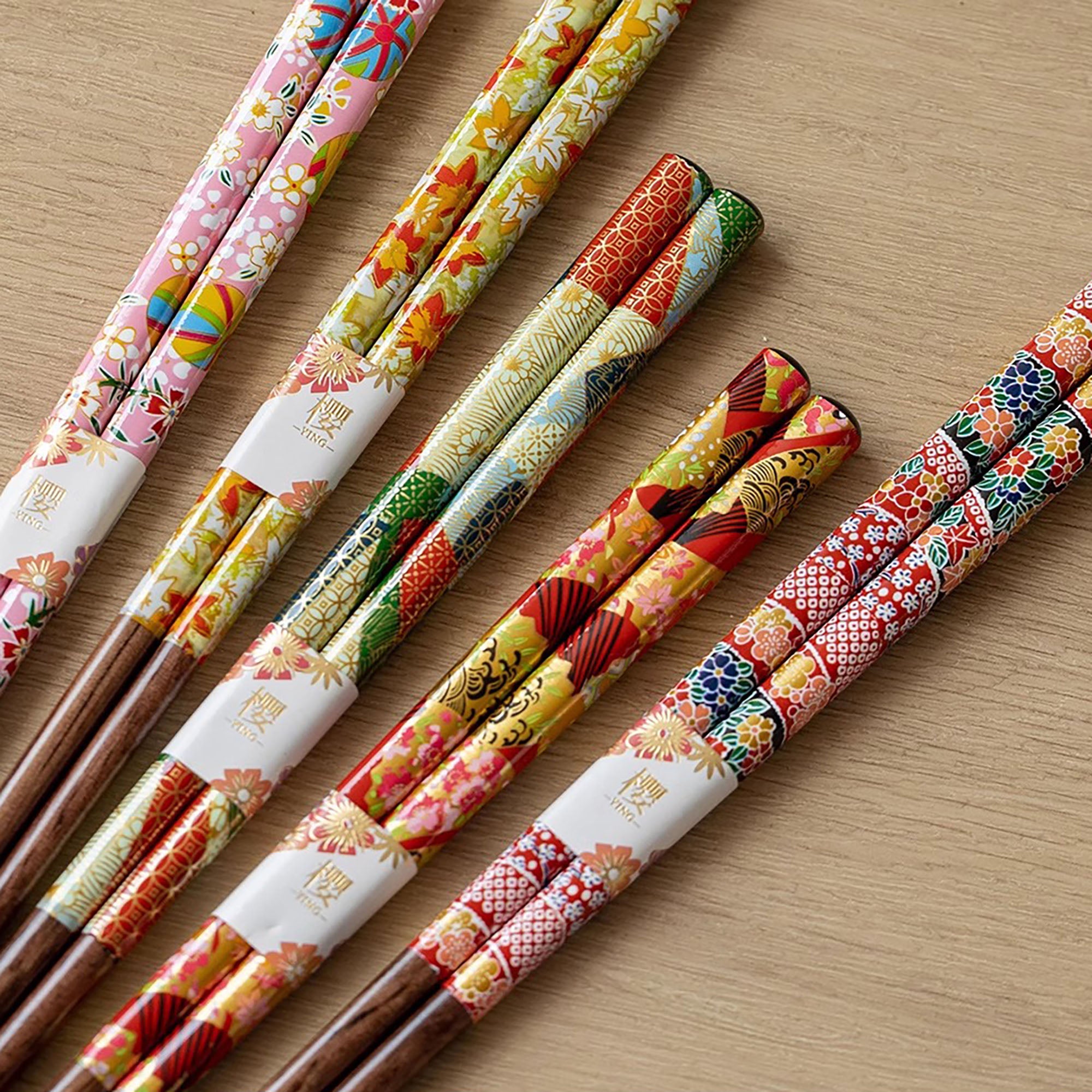 Découvrez les baguettes en bois massif fabriquées par Tanaka Hashiten, un artisan renommé au Japon. Ornées de motifs éclatants de fleurs de cerisier, elles évoquent une ambiance japonaise traditionnelle et raffinée.