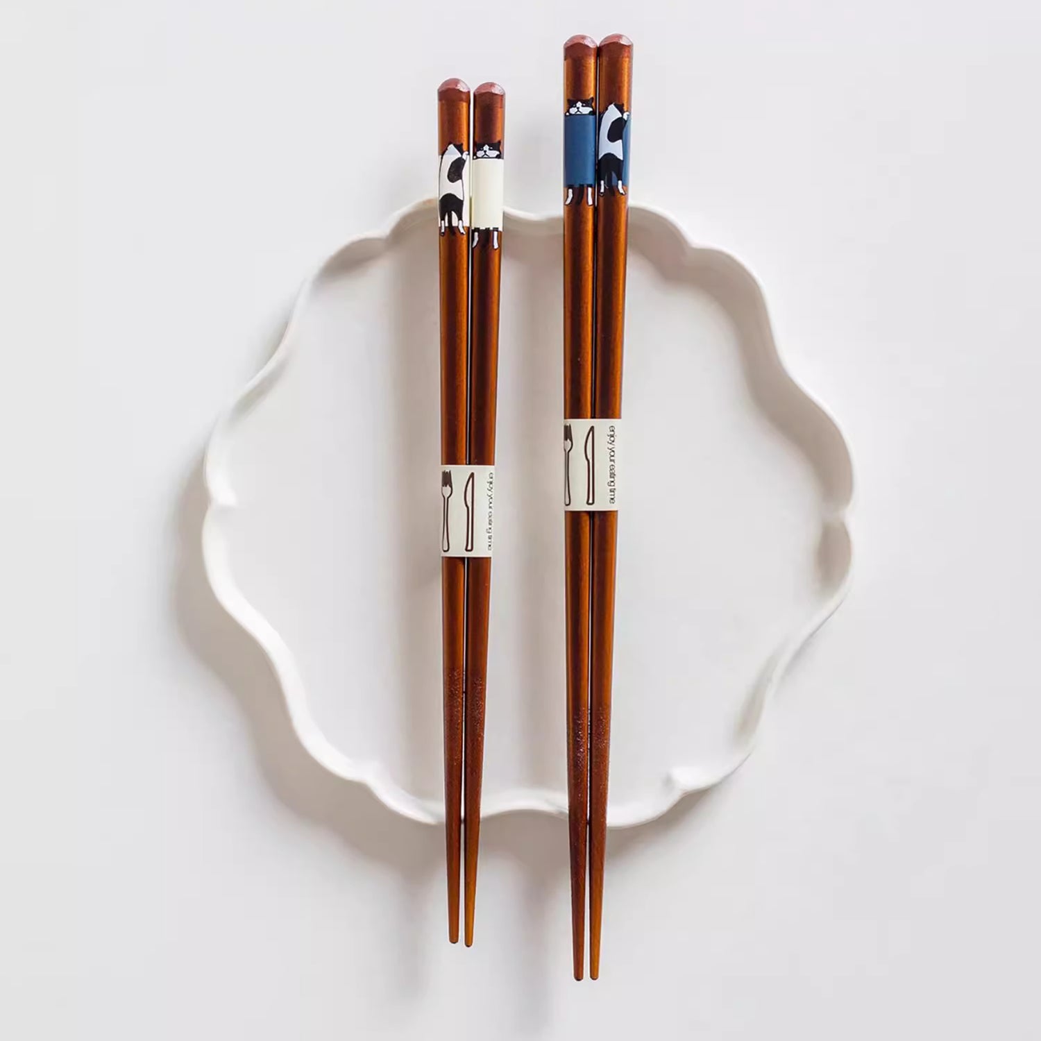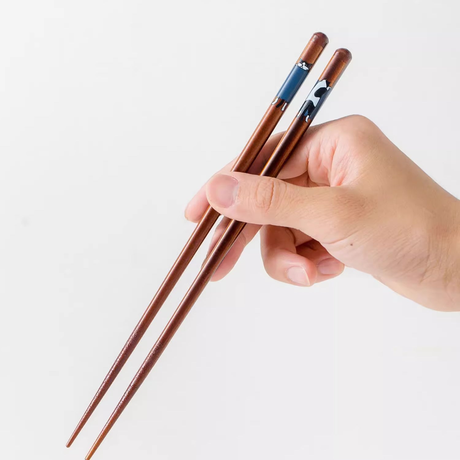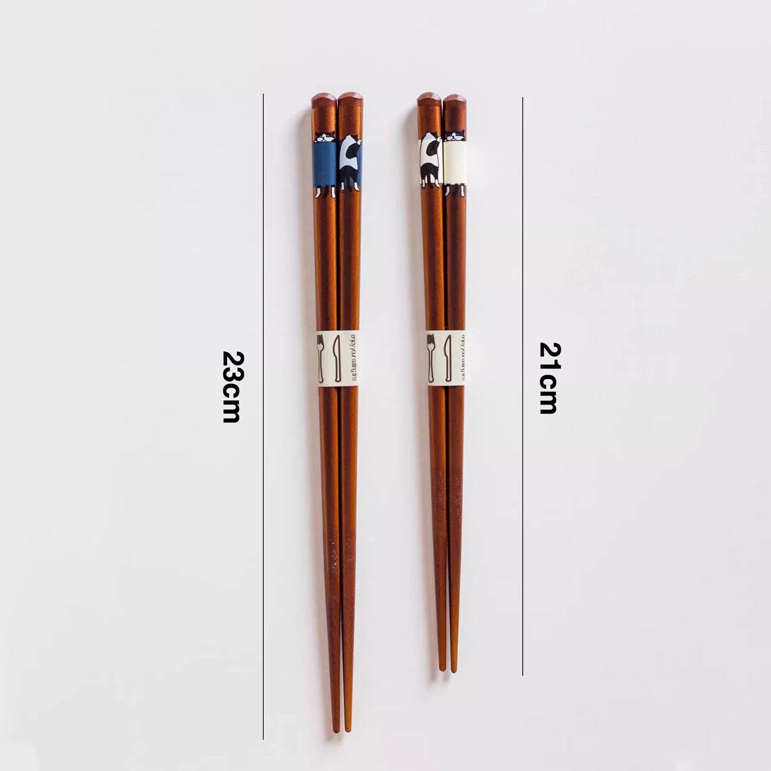 Ces baguettes en bois massif de kaku-no-ki sont fabriquées par SUNLIFE Japon et arborent un motif original de chats paresseux s’étirant sur le lit. Leur texture mate et leur extrémité affinée offrent une prise en main agréable et un usage pratique. Disponibles en bleu et blanc, elles forment un duo parfait pour les couples, ajoutant une touche d’élégance et de complicité à vos repas.