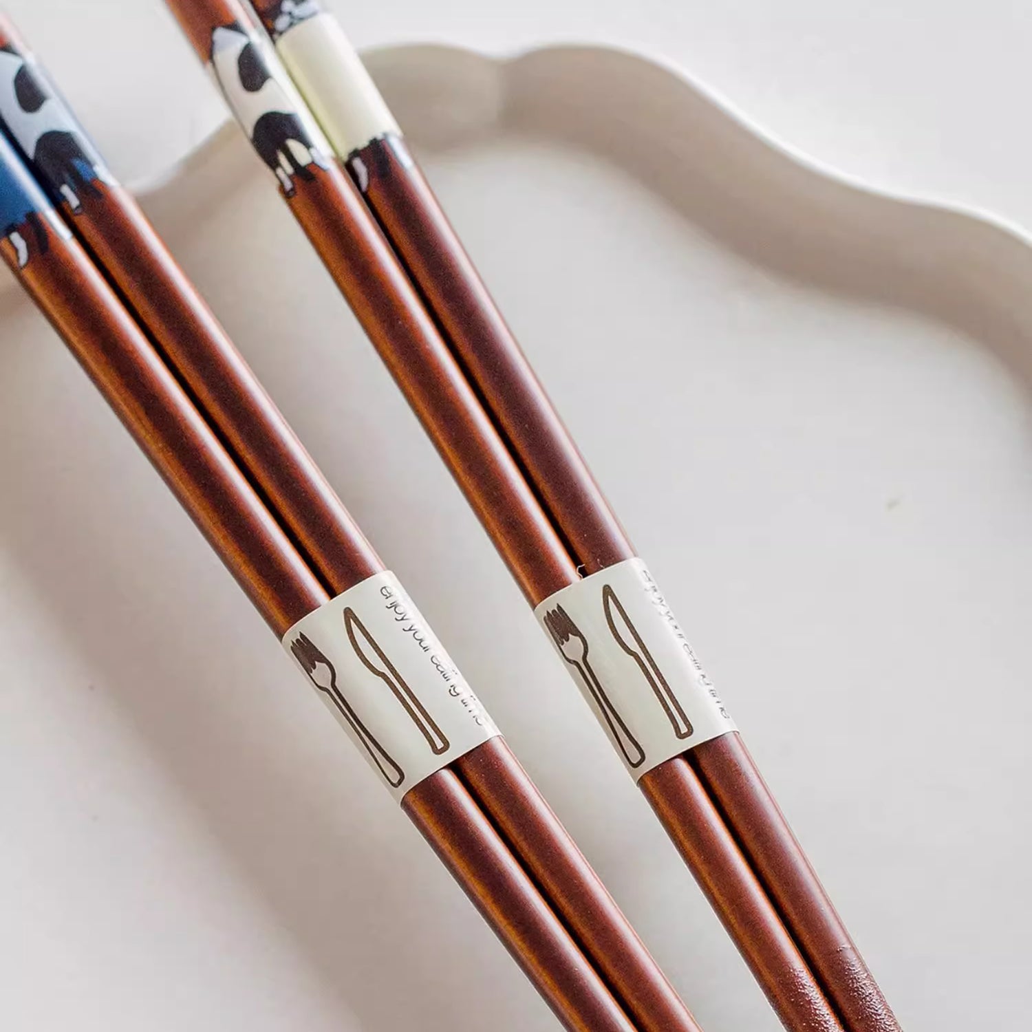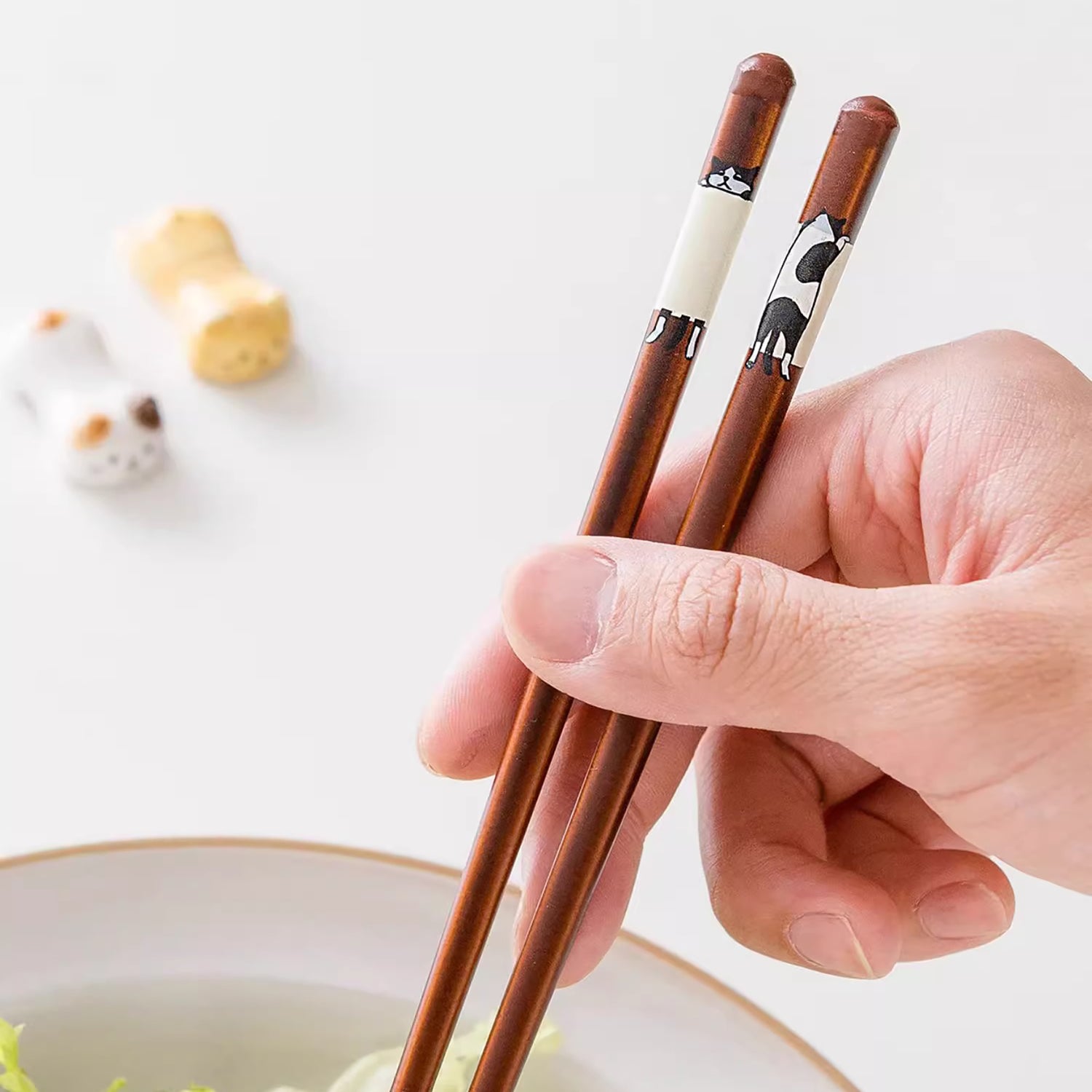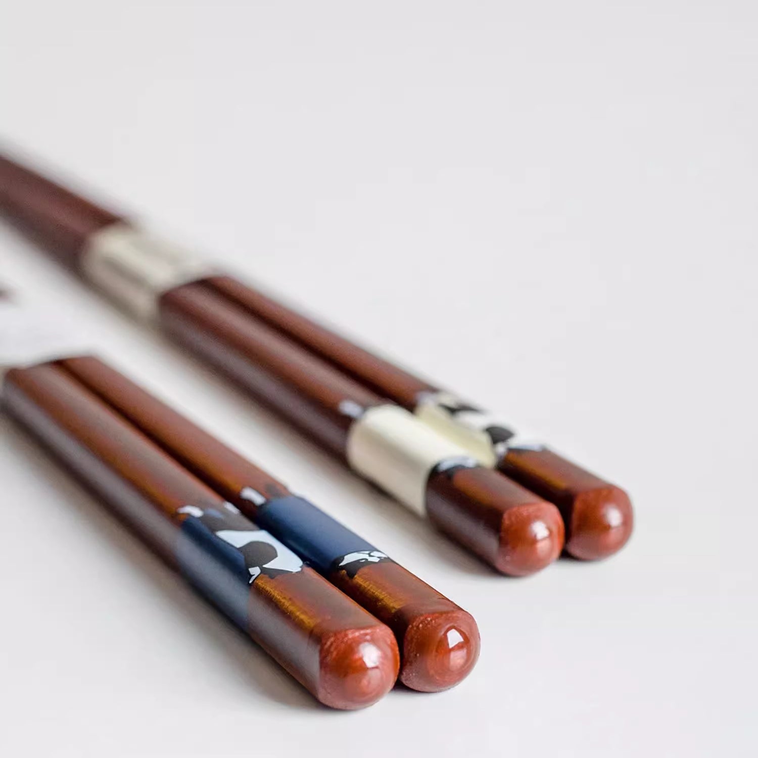 Ces baguettes en bois massif de kaku-no-ki sont fabriquées par SUNLIFE Japon et arborent un motif original de chats paresseux s’étirant sur le lit. Leur texture mate et leur extrémité affinée offrent une prise en main agréable et un usage pratique. Disponibles en bleu et blanc, elles forment un duo parfait pour les couples, ajoutant une touche d’élégance et de complicité à vos repas.