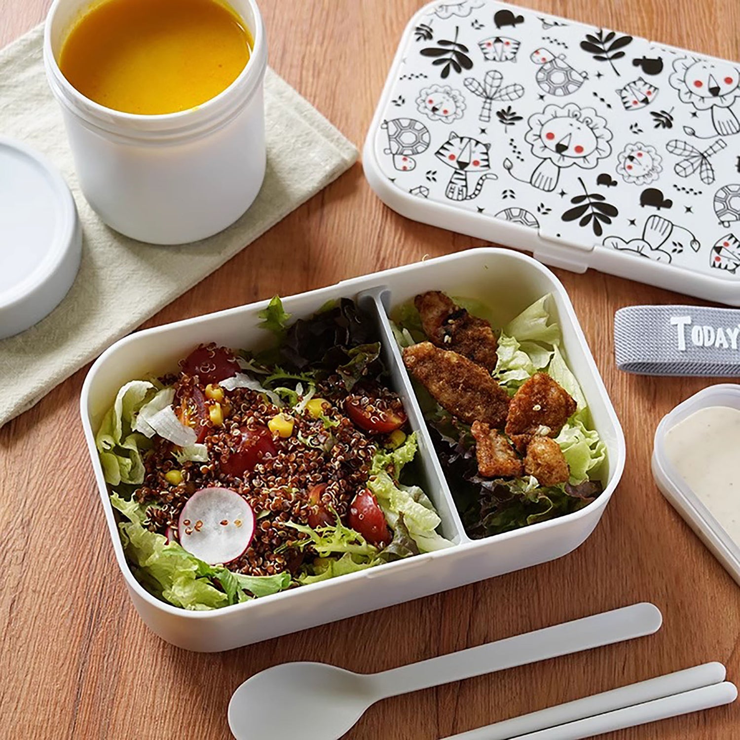 Ce bento japonais arbore des illustrations amusantes et une capacité de 1L. Équipé d’une cloison amovible, il s’adapte parfaitement à vos repas variés. Le couvercle, doté d’un joint en silicone, garantit une étanchéité optimale, évitant tout risque de fuite, même pour les plats en sauce. Un compartiment intégré contient des couverts assortis pour un usage quotidien pratique. Résistant à la chaleur, il peut être chauffé au micro-ondes grâce à sa valve d’aération (temps de chauffe conseillé : moins de 2 minutes). Fabriqué en PP, il offre une texture douce et est facile à nettoyer. Idéal pour vos repas ou pique-niques avec une élégance japonaise unique. Parfait pour un usage personnel ou comme cadeau.