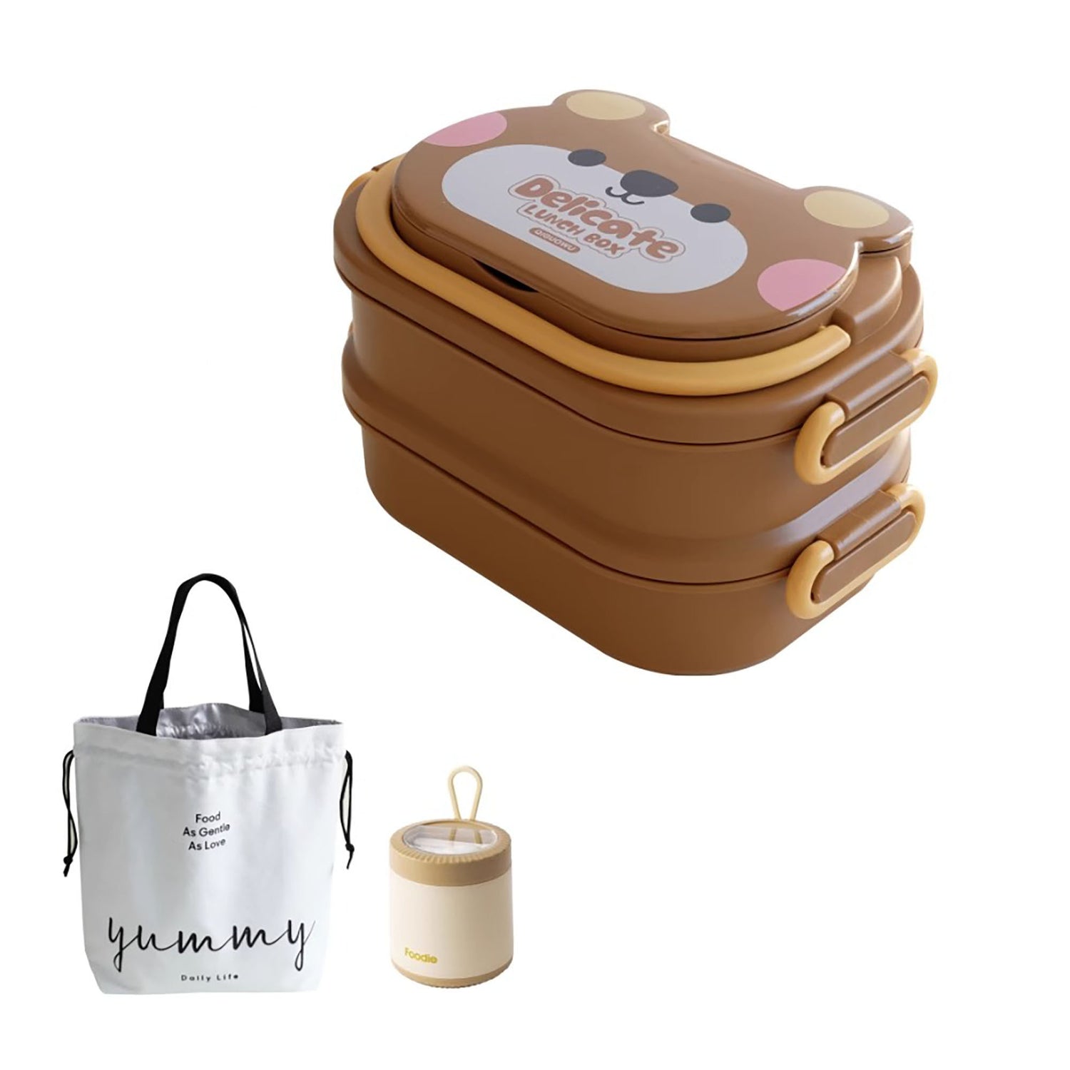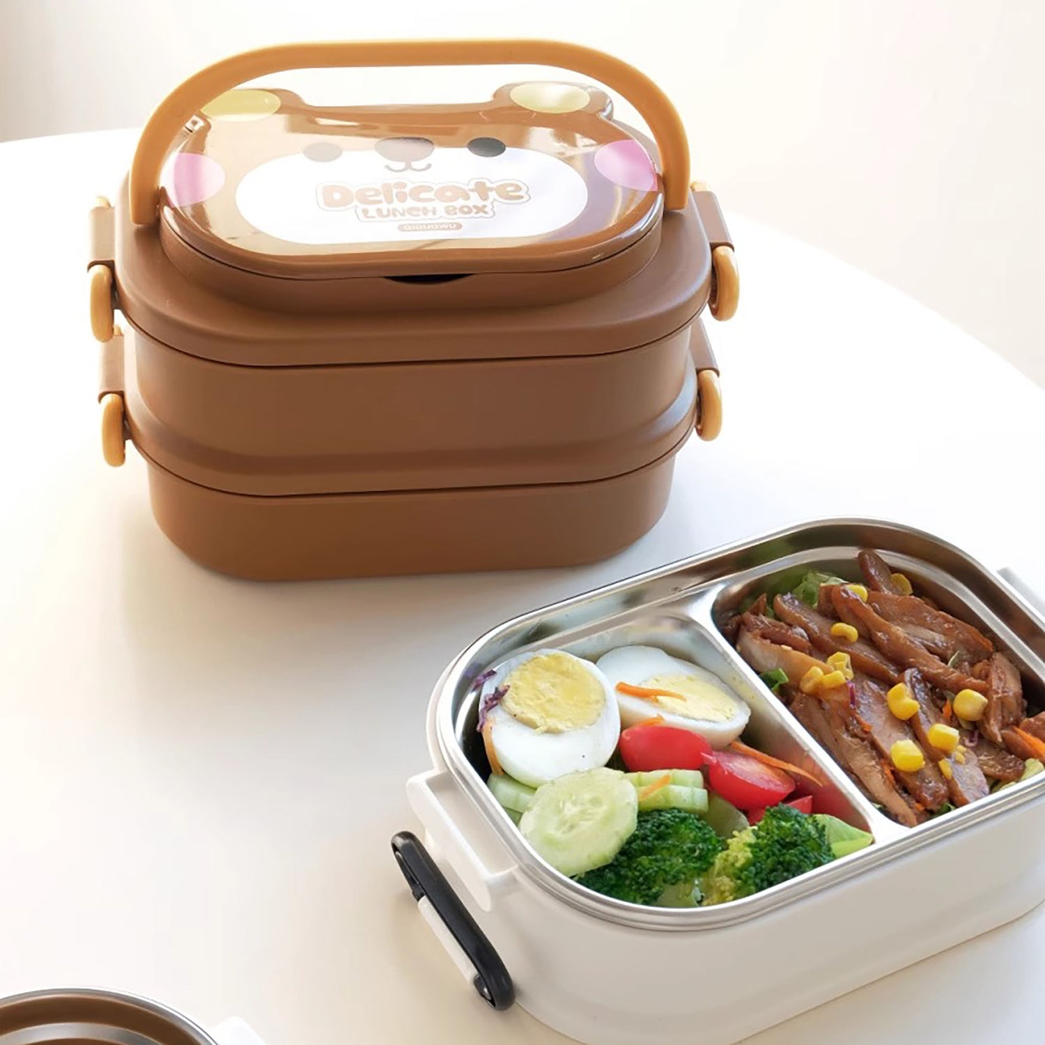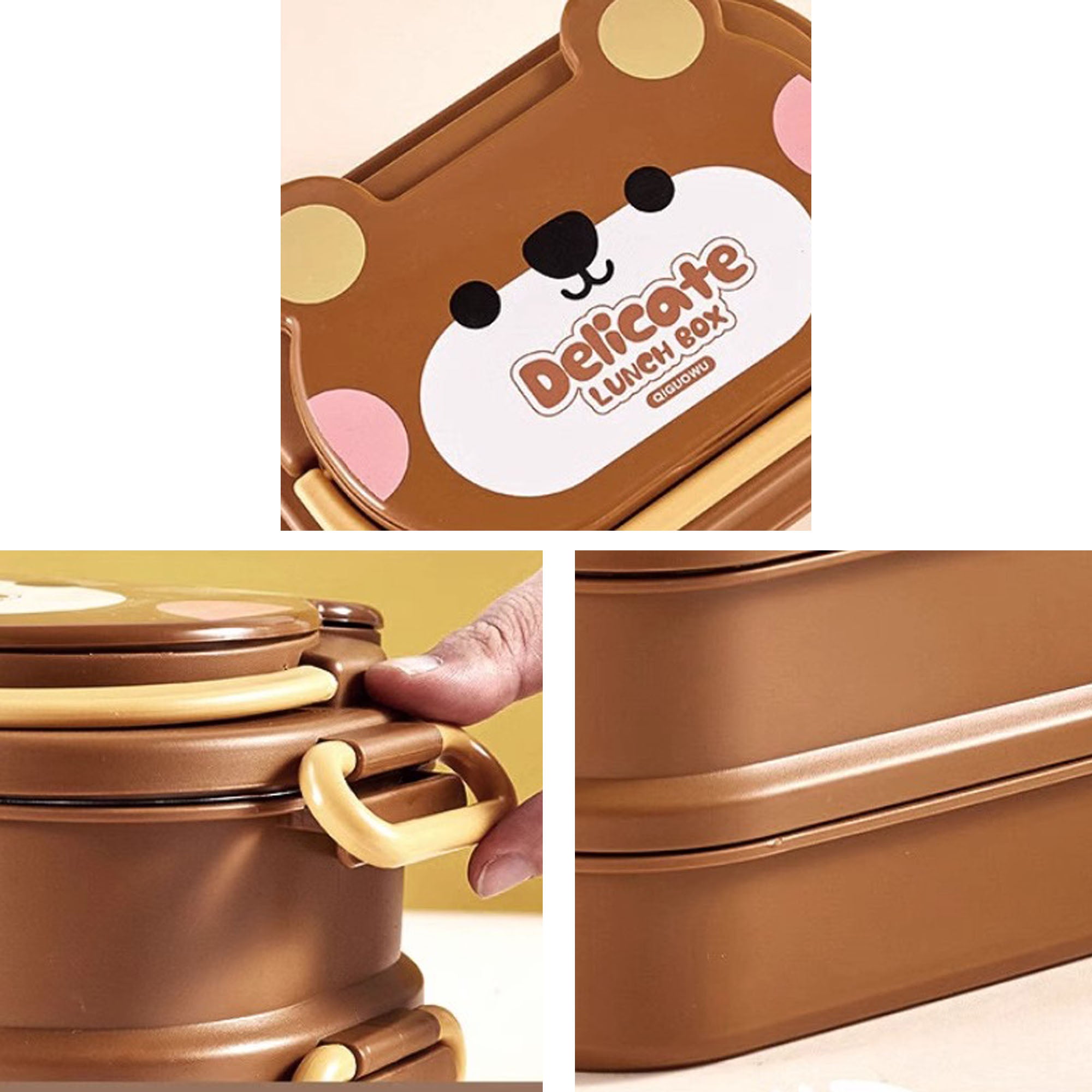 Cette boîte à bento arbore un charmant motif d'ours, rendant les repas des enfants plus amusants. Son couvercle à clips avec joint d'étanchéité assure une fermeture hermétique, et le nettoyage est simple grâce aux composants amovibles. Le design à double couche offre une grande capacité et peut s'adapter à vos besoins en mode simple ou double couche. Avec une doublure en acier inoxydable 304, elle est hygiénique, facile à nettoyer et compatible avec le micro-ondes (chauffage sans couvercle recommandé pendant moins de 2 minutes). Équipée de compartiments et d'un espace pour les couverts, elle est idéale pour les déplacements. Combinez-la avec une boîte à soupe portable et un sac isotherme assortis pour un déjeuner ou un pique-nique complet et élégant. Parfaite pour un usage personnel ou comme cadeau.