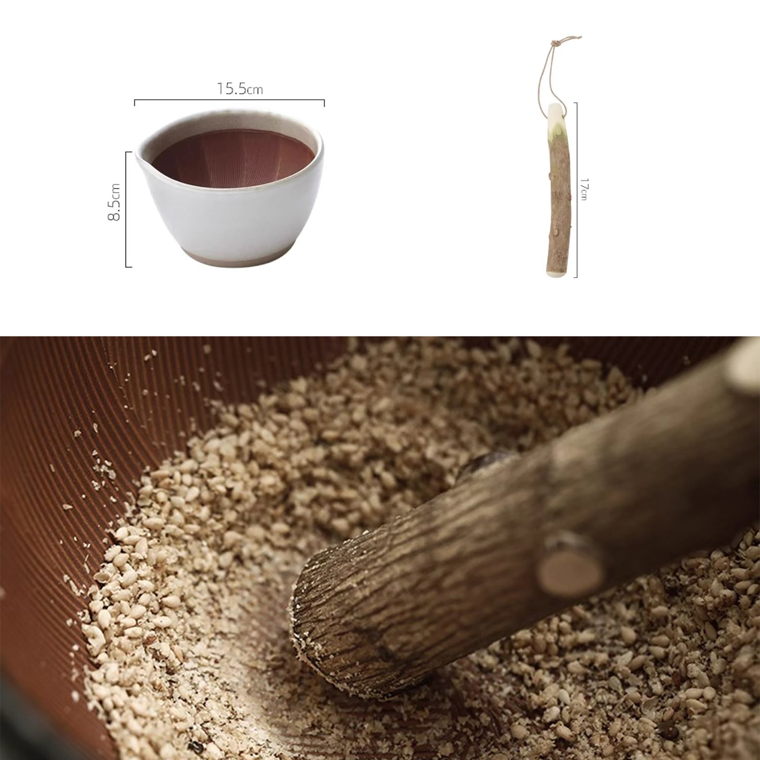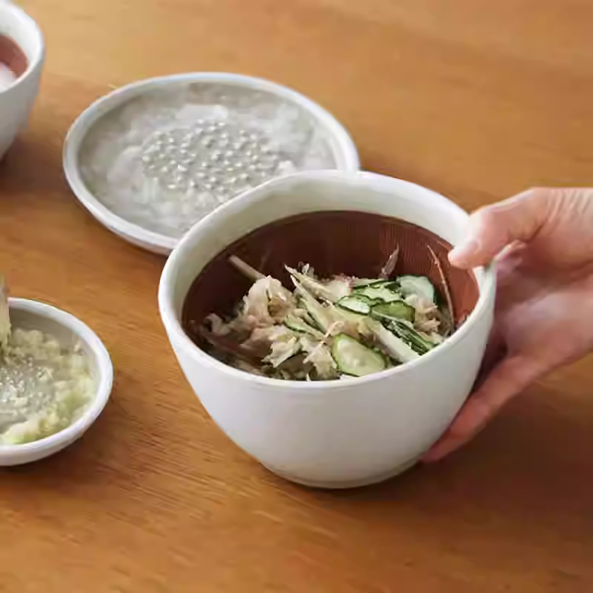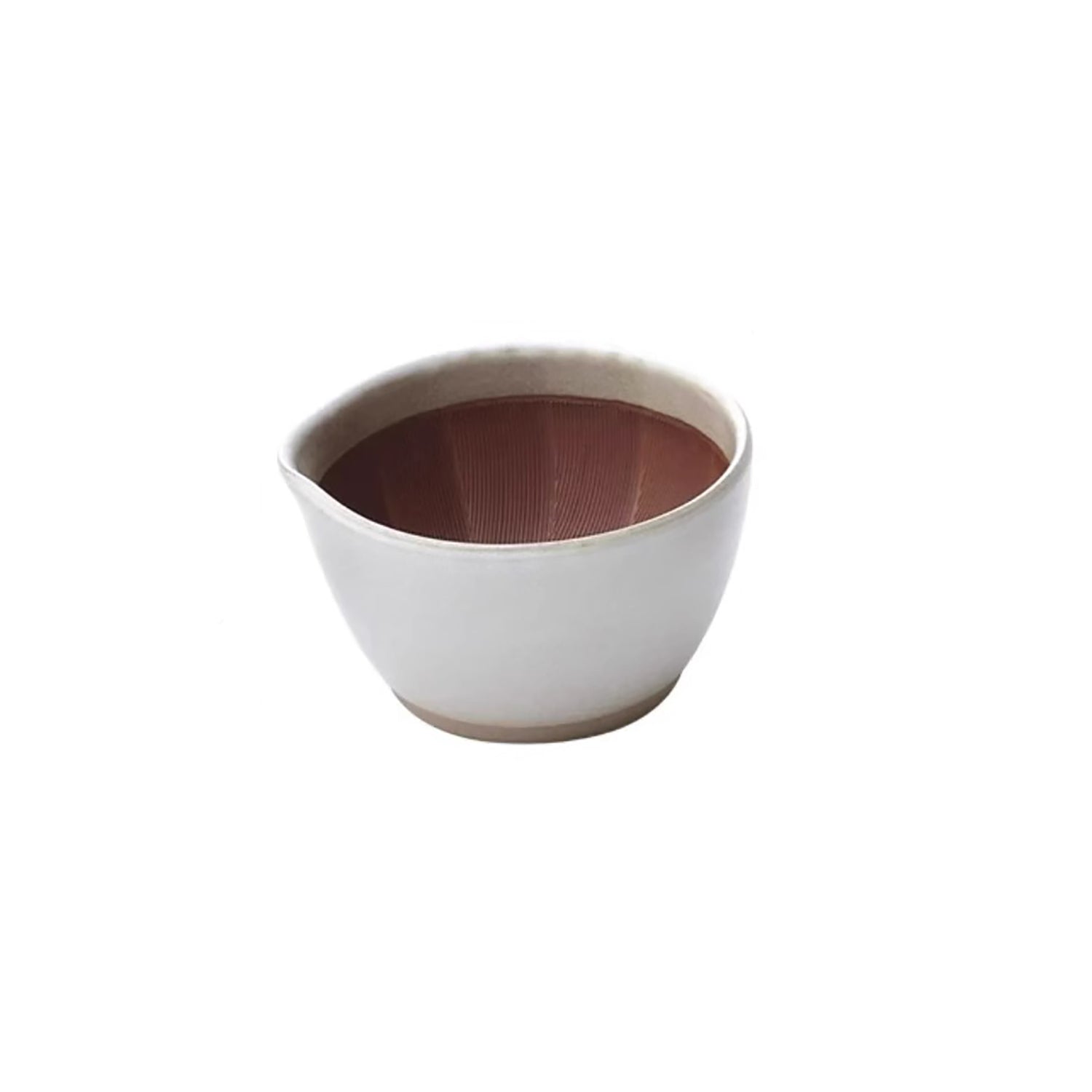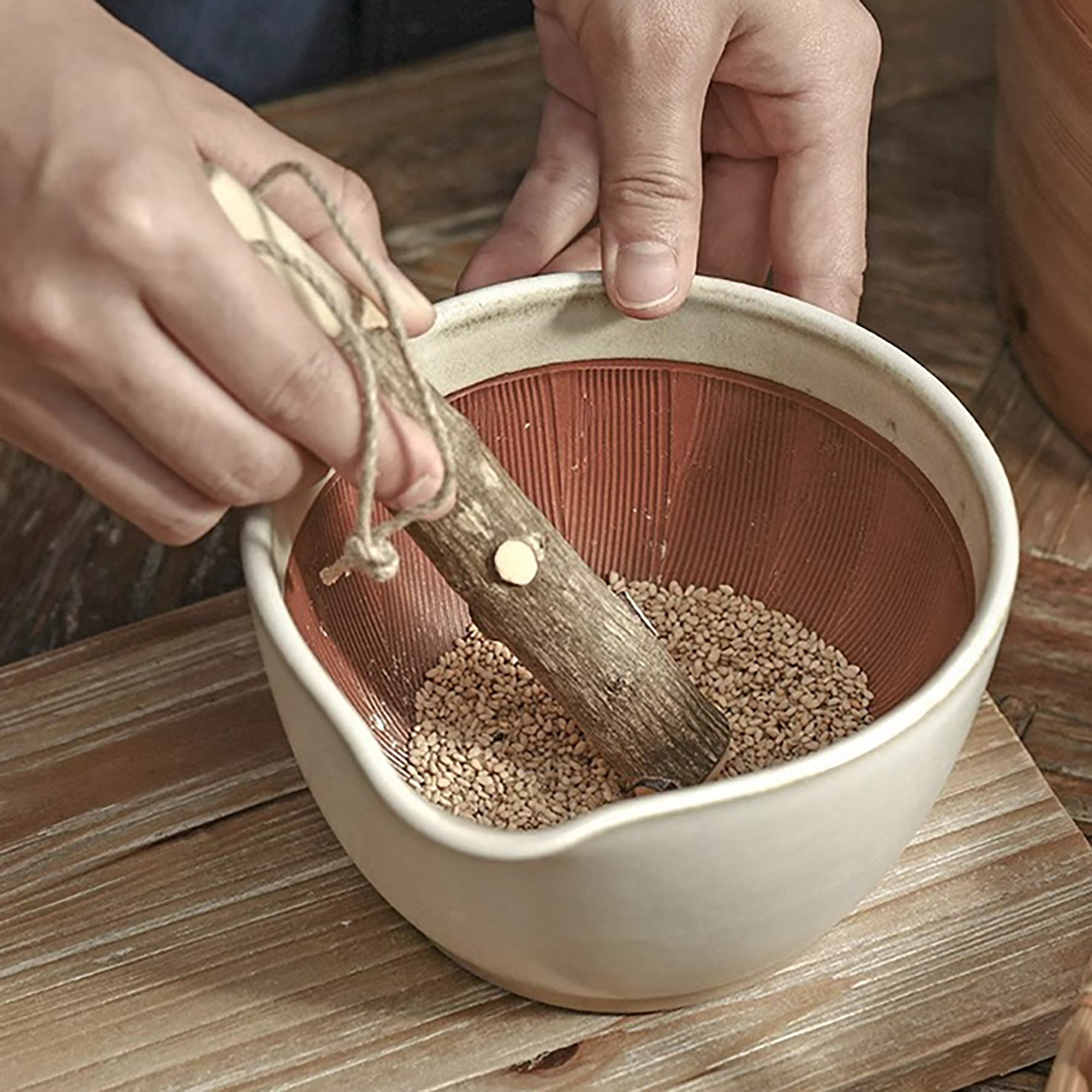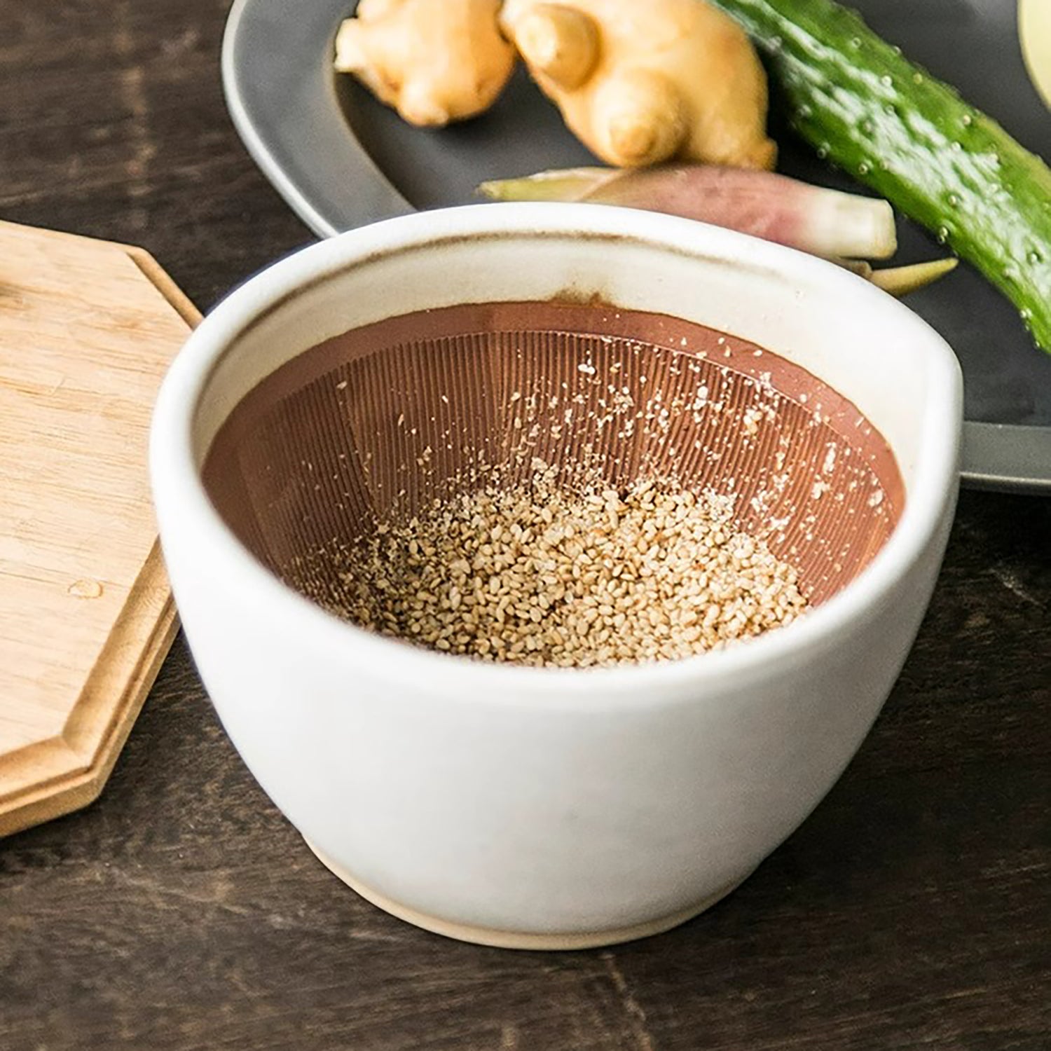 Ce bol à moudre artisanal de Motoshige est fabriqué en céramique émaillée selon la technique japonaise du sous-glaçure à haute température. L’intérieur sculpté à la main de rainures pointues permet de broyer efficacement des graines de sésame, des arachides, du radis ou du wasabi, pour des préparations fraîches et savoureuses.