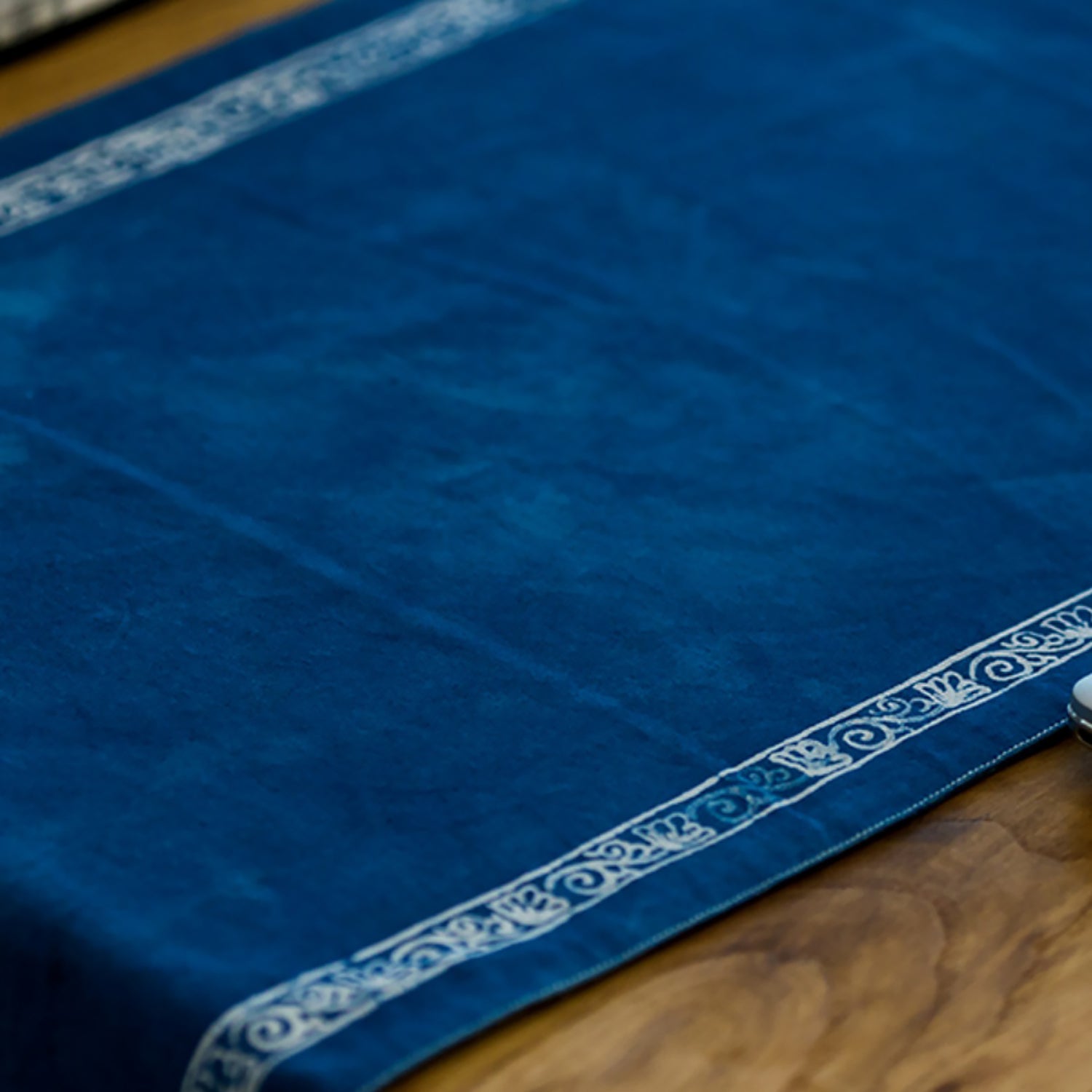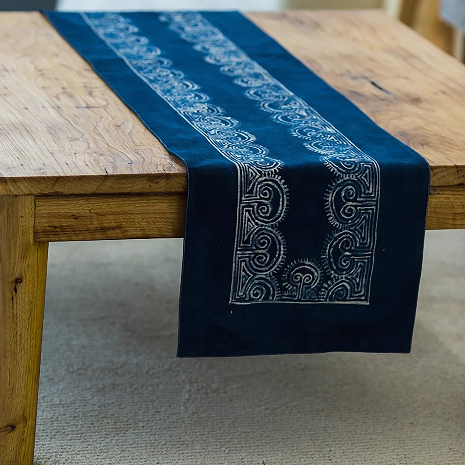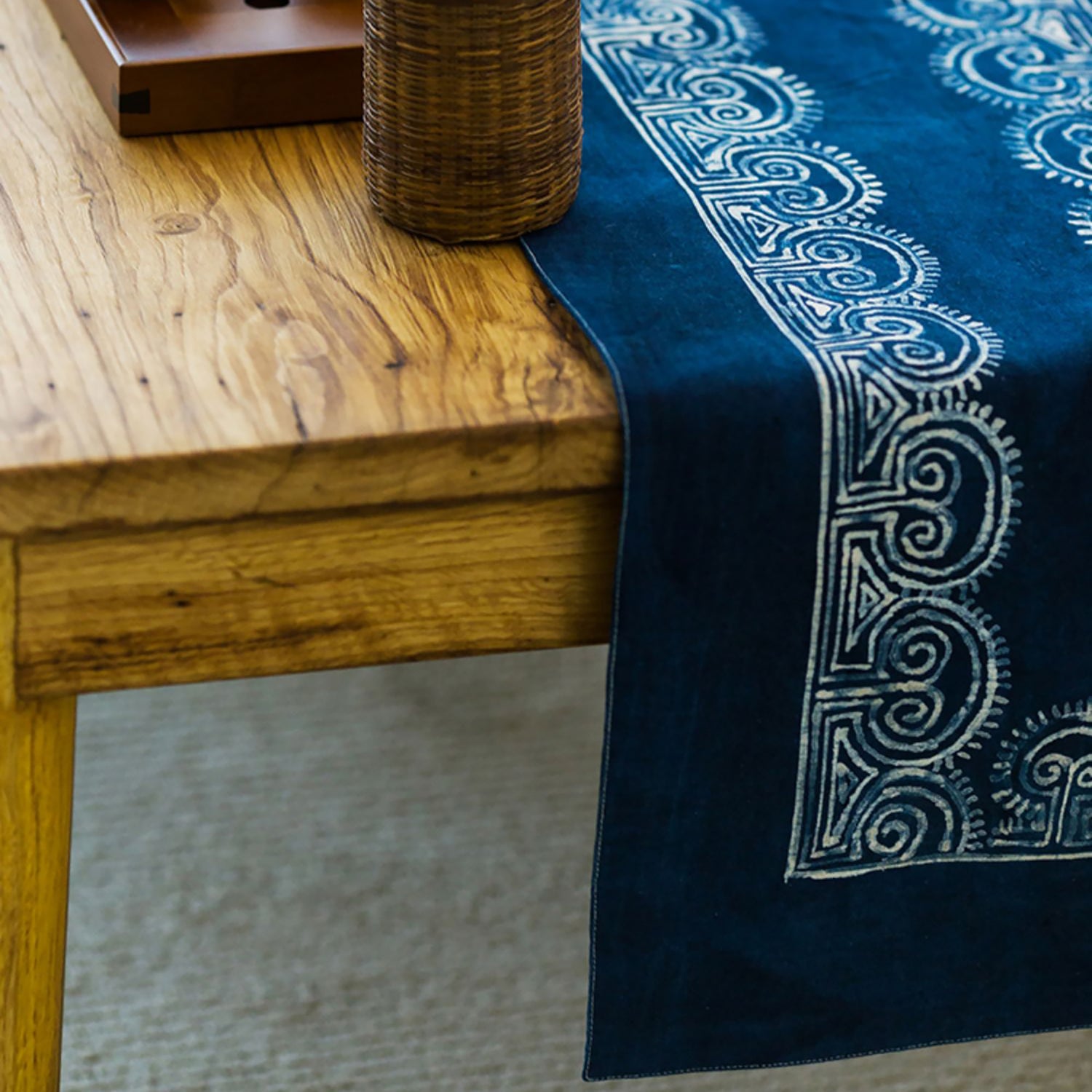Ce chemin de table artisanal est confectionné par des artisans Yi du Yunnan, selon les techniques traditionnelles du batik et de la teinture indigo. Il présente deux motifs emblématiques de la culture Yi : la spirale, symbole du cycle de la vie, et le soleil, porteur de lumière et de chaleur. Fabriqué en coton et lin naturels, il est composé de deux couches cousues ensemble – une face foncée, une face plus claire – offrant une utilisation réversible et adaptable à différentes ambiances. Élégant, symbolique et polyvalent, ce tissu peut être utilisé sur une table, un meuble d’entrée ou un espace spirituel. Disponible en dimensions personnalisées sur demande.