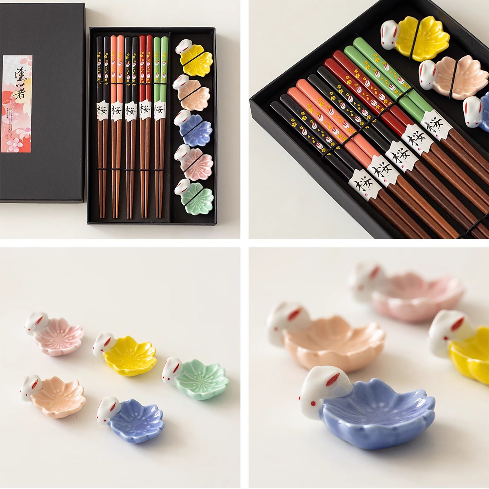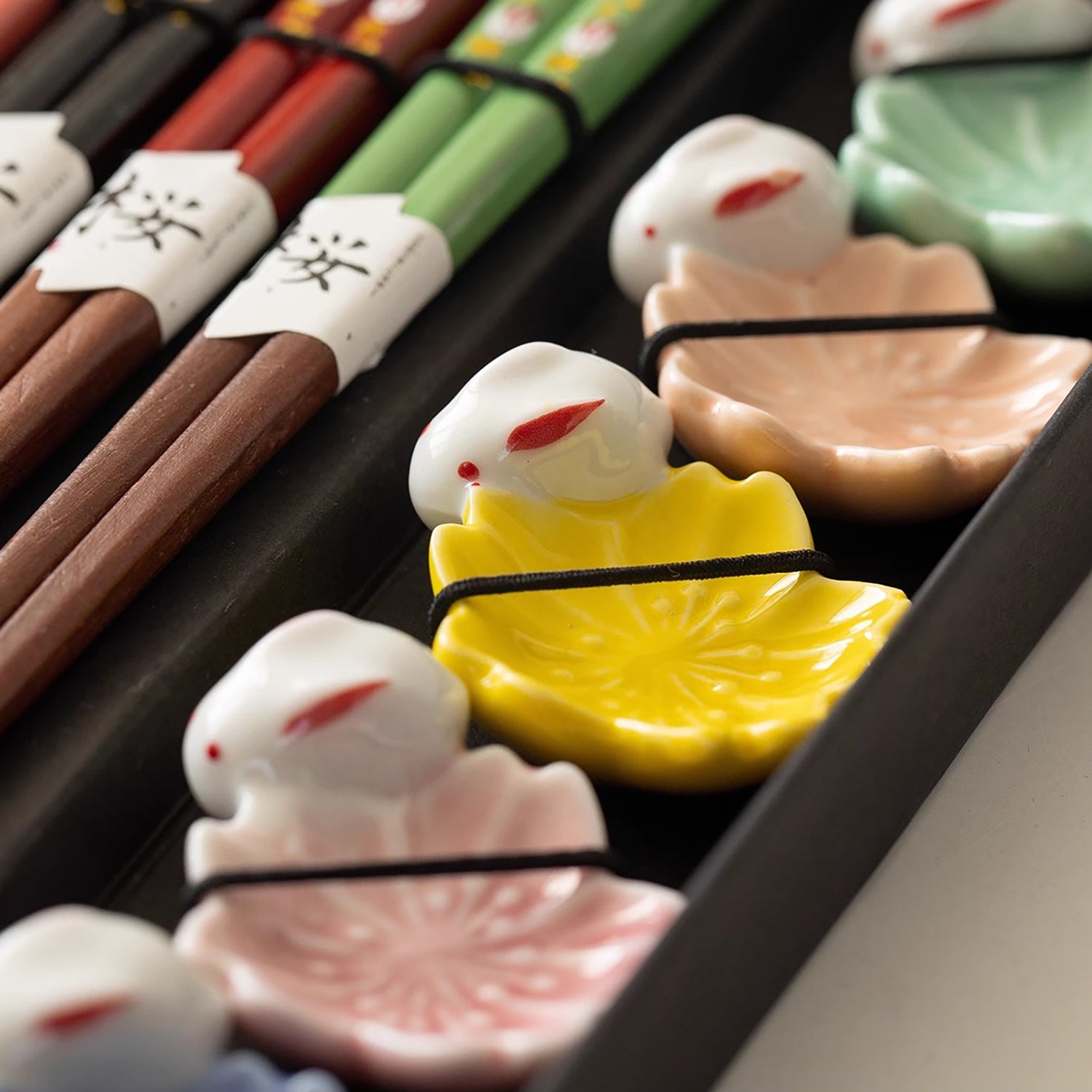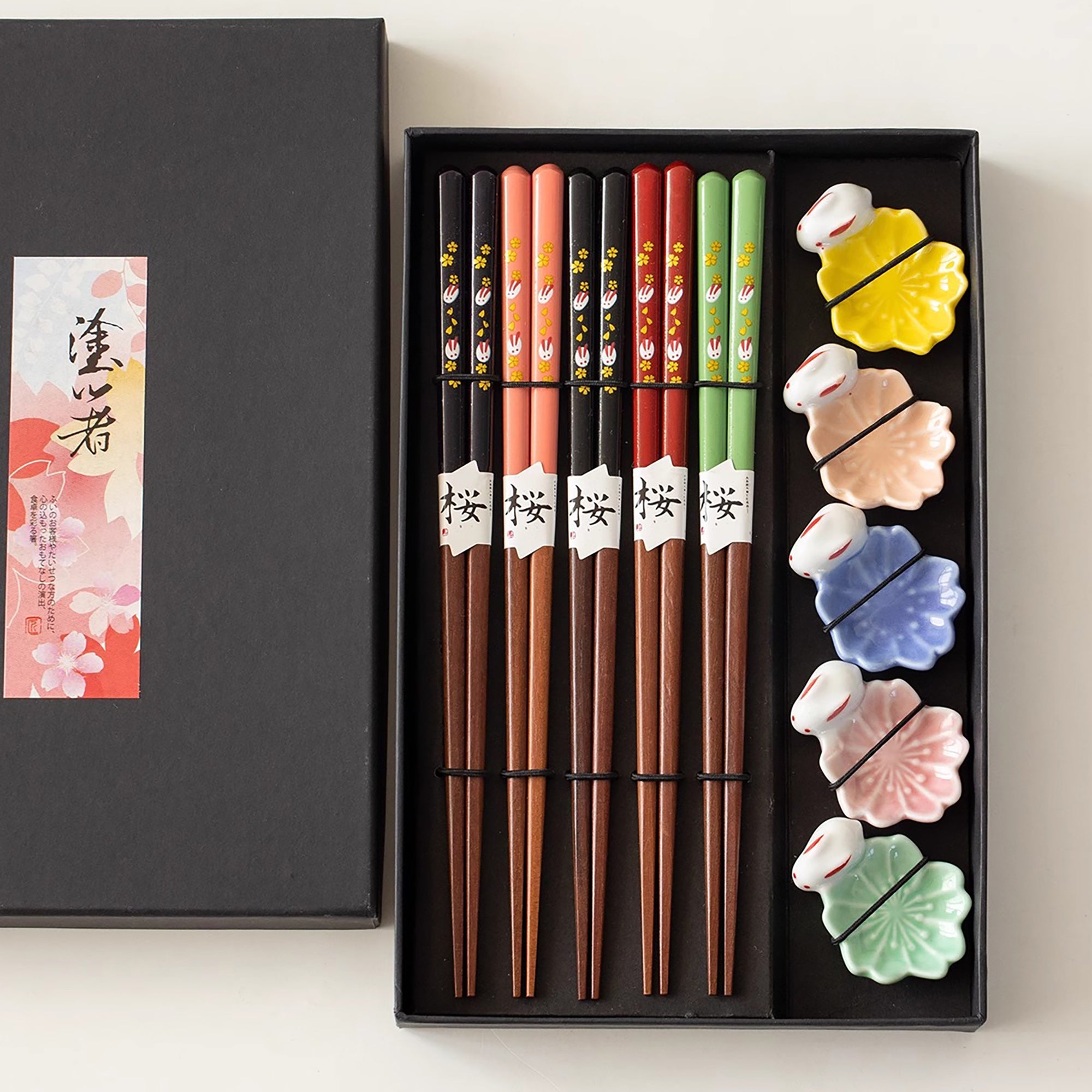 Ce coffret de baguettes en bois naturel de la marque japonaise Tanaka Hashiki est conçu avec des matériaux de qualité, offrant une texture douce et agréable. Orné de motifs charmants de sakura et de petits lapins, il dégage une ambiance japonaise romantique. Accompagné de repose-baguettes assortis en forme de lapin, il est à la fois esthétique et fonctionnel. L’ensemble comprend 5 paires de baguettes de différentes couleurs, parfaites pour un usage familial ou comme cadeau raffiné à offrir à vos proches.