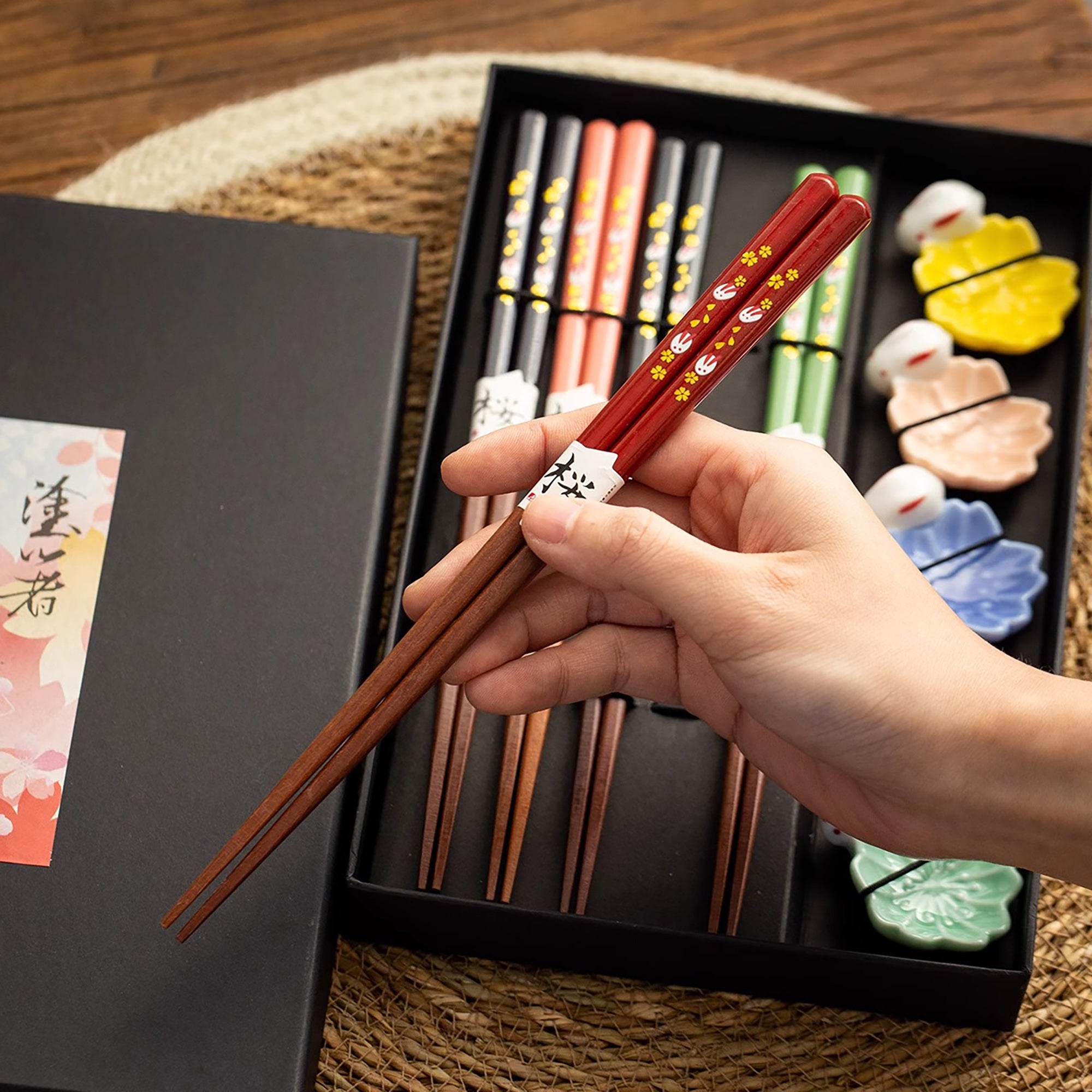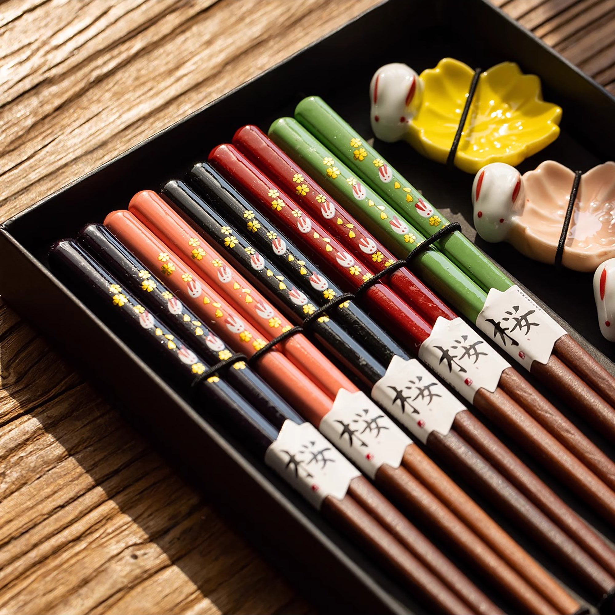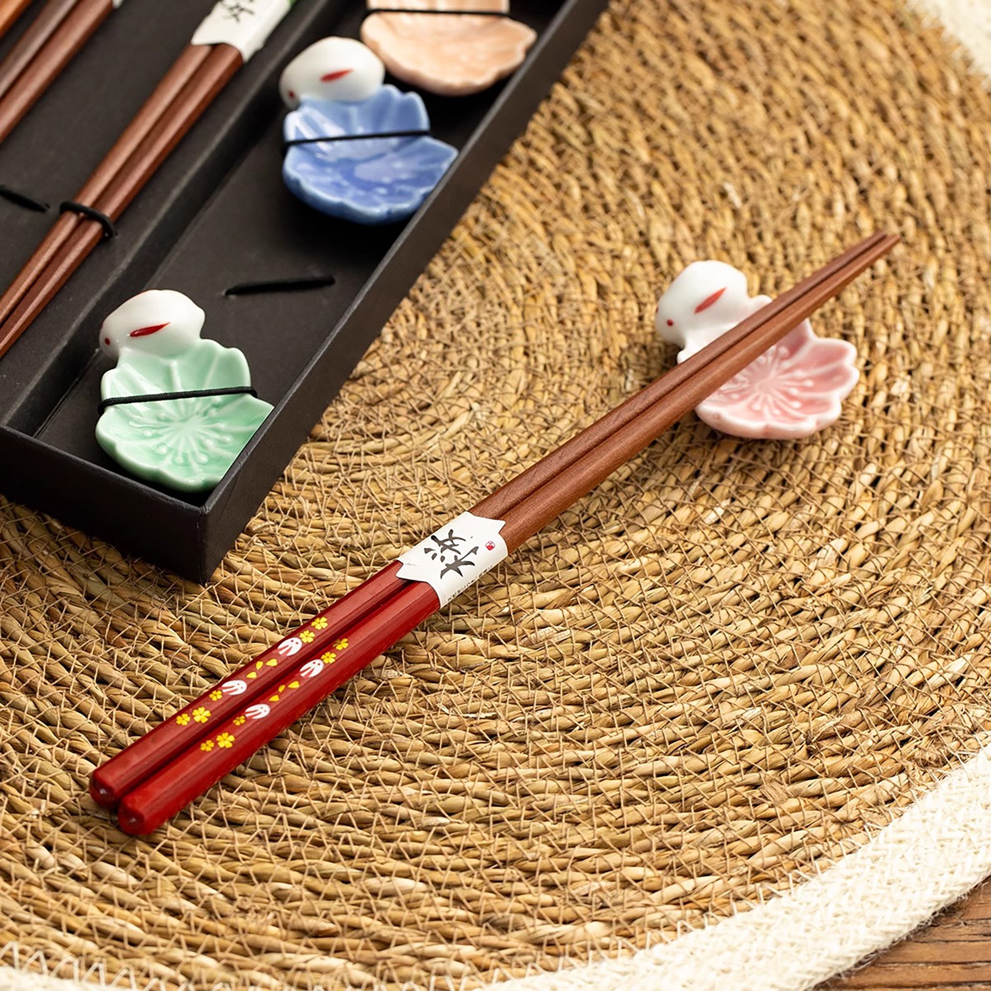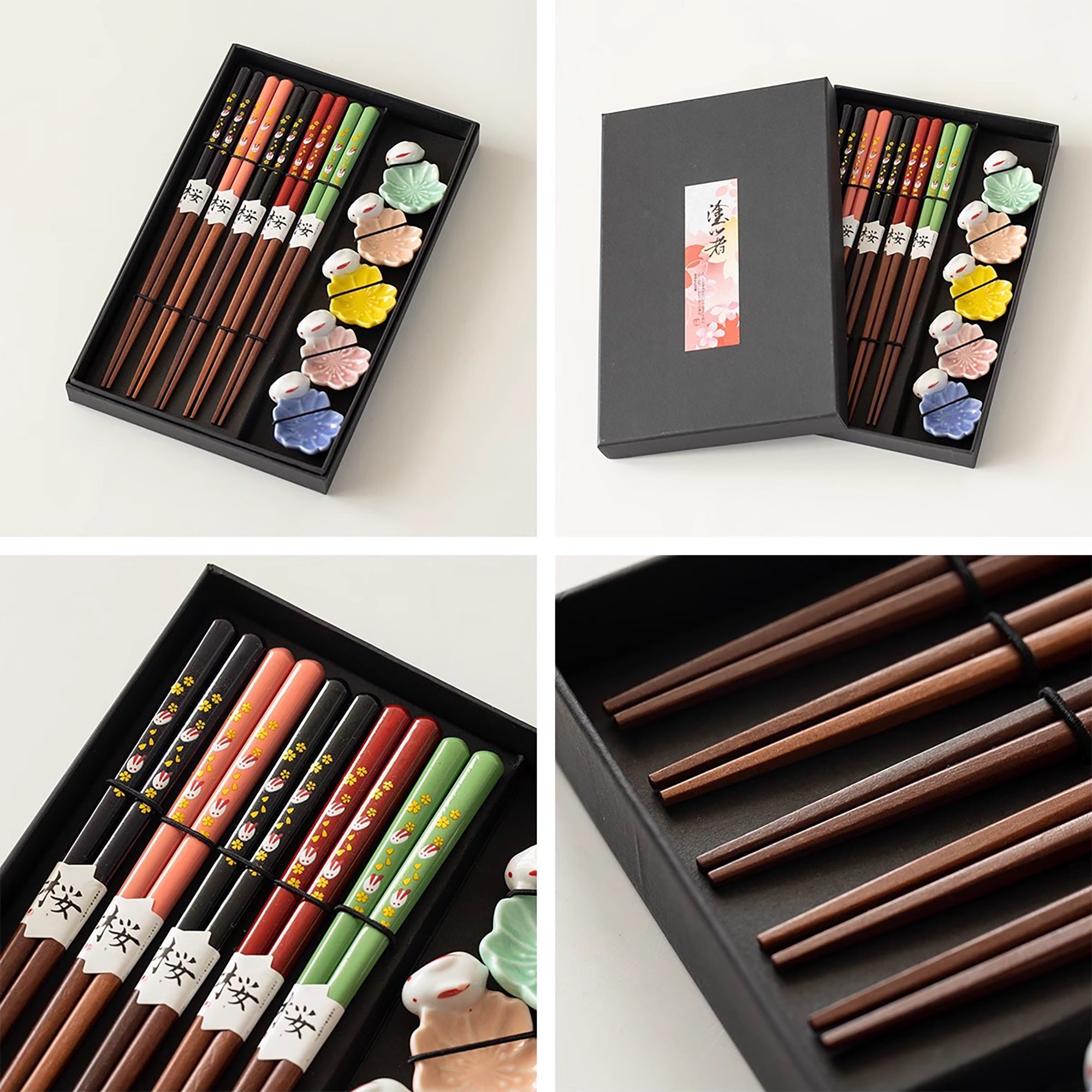 Coffret de 5 baguettes en bois naturel Tanaka avec repose-baguettes