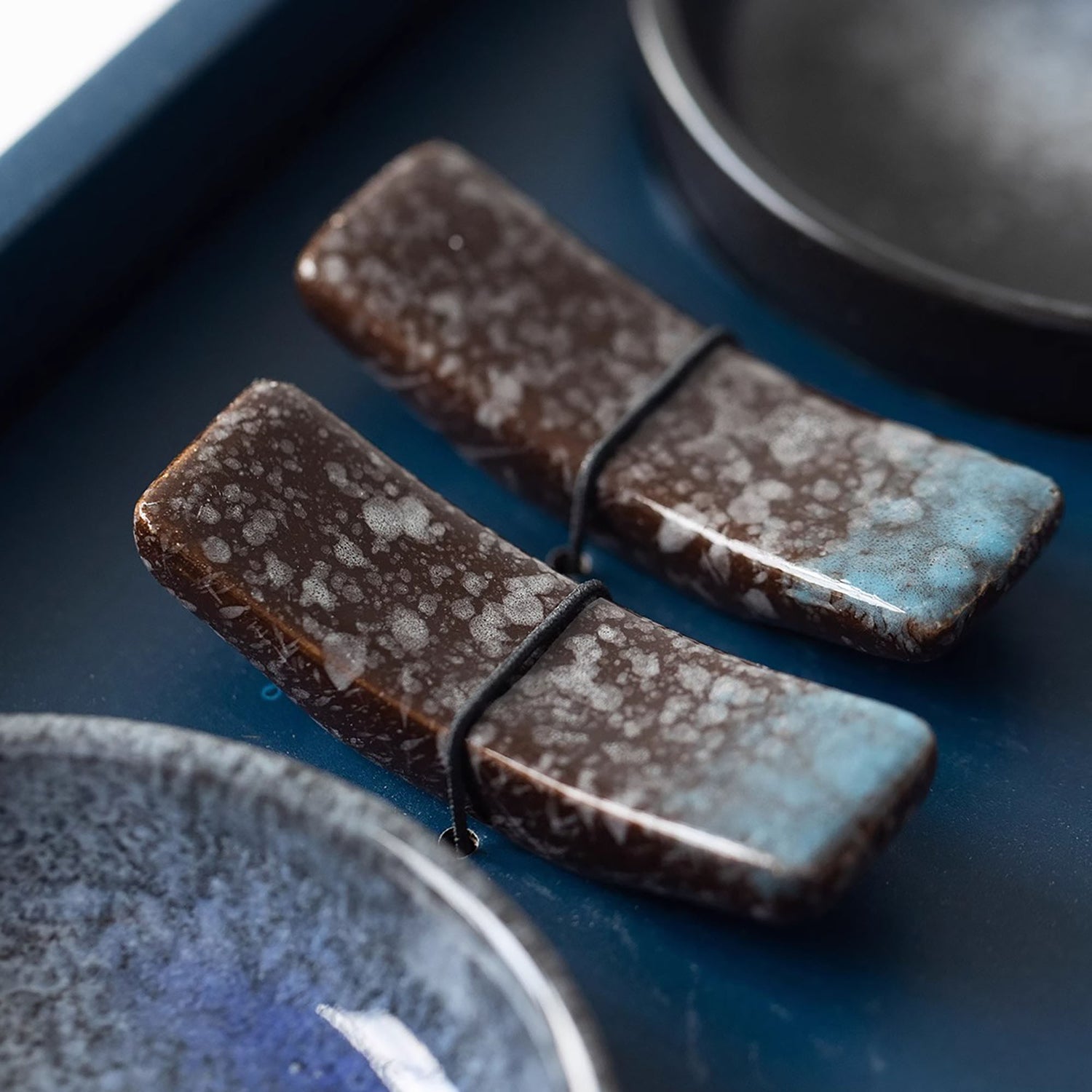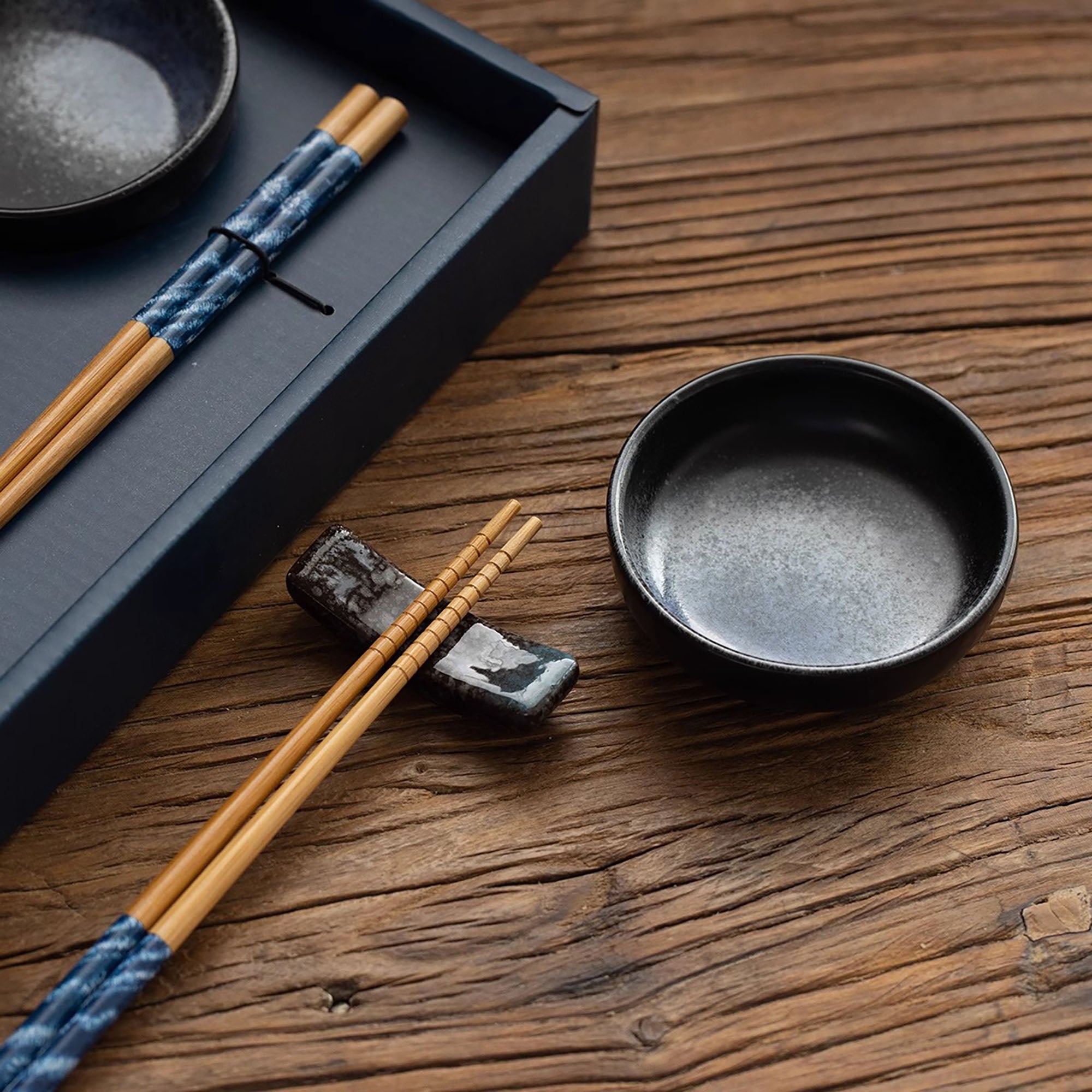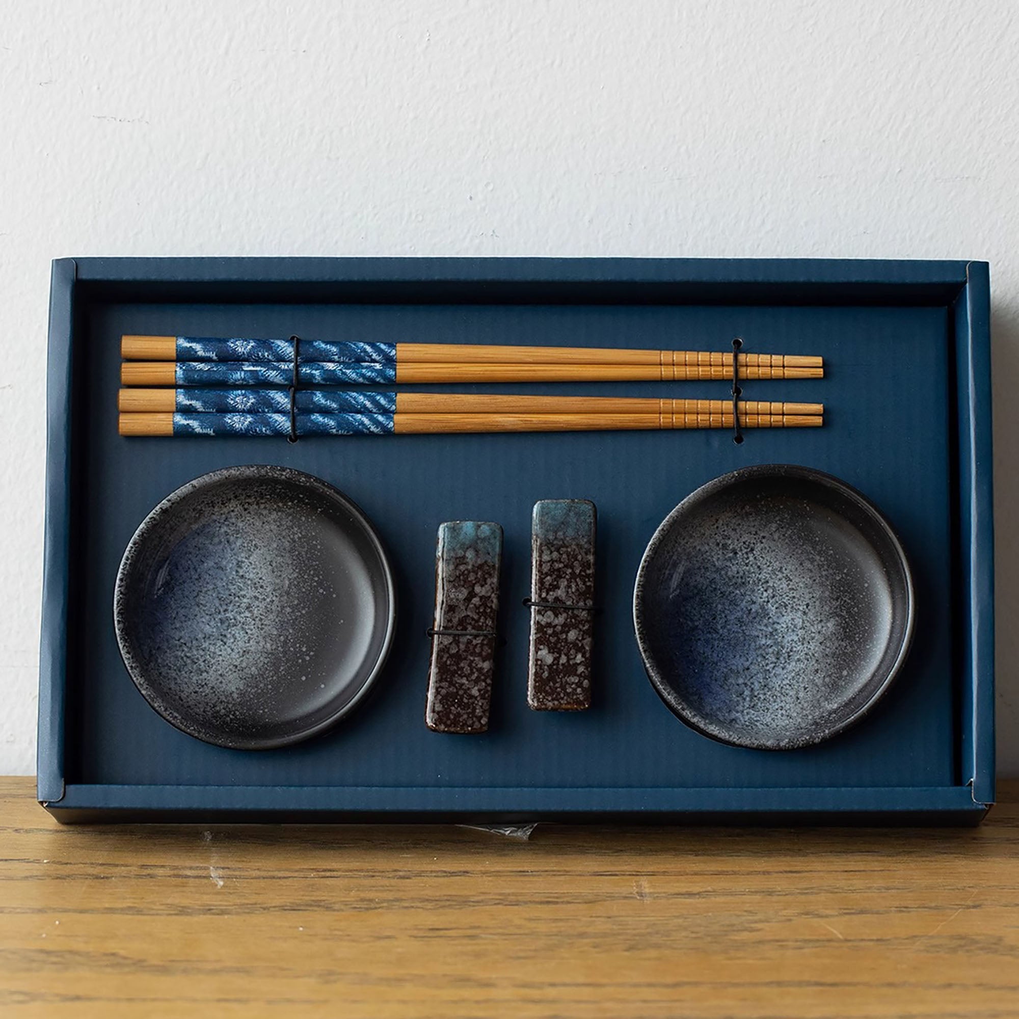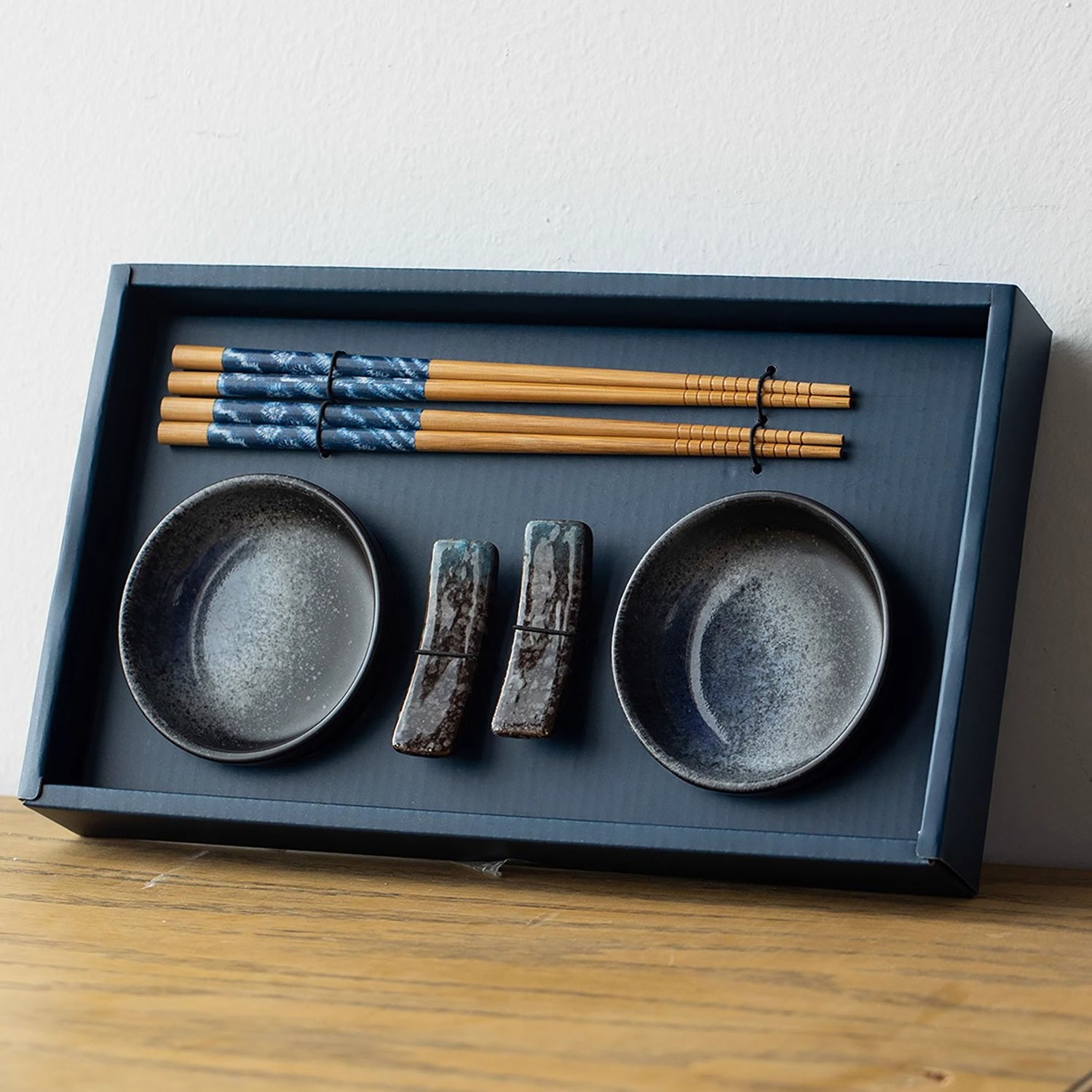 Ce coffret, conçu avec soin par Tanaka Tanahashi, comprend des baguettes en bois naturel, un repose-baguettes en céramique et une coupelle à sauce artisanale. Dominé par des tons bleus, il évoque une esthétique paisible et discrète, avec une texture rustique raffinée. Pensé pour deux personnes, ce coffret symbolise l’union et l’harmonie, idéal pour un usage personnel ou comme cadeau empreint de significations.