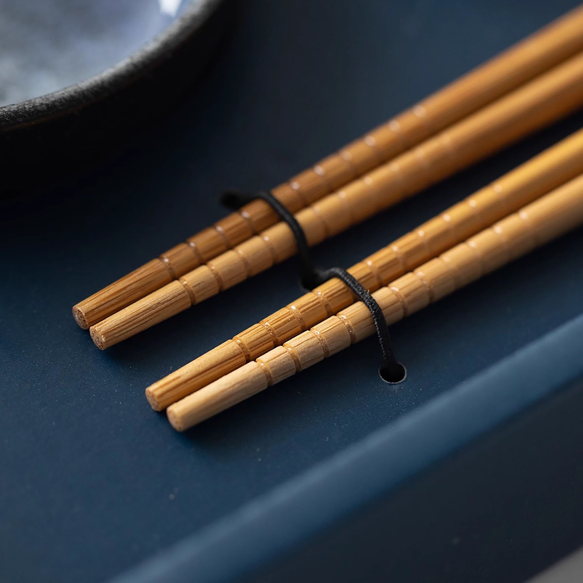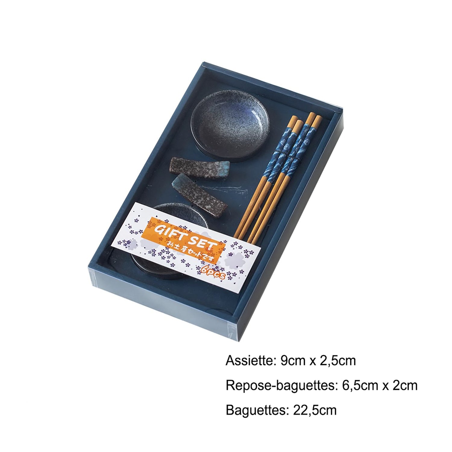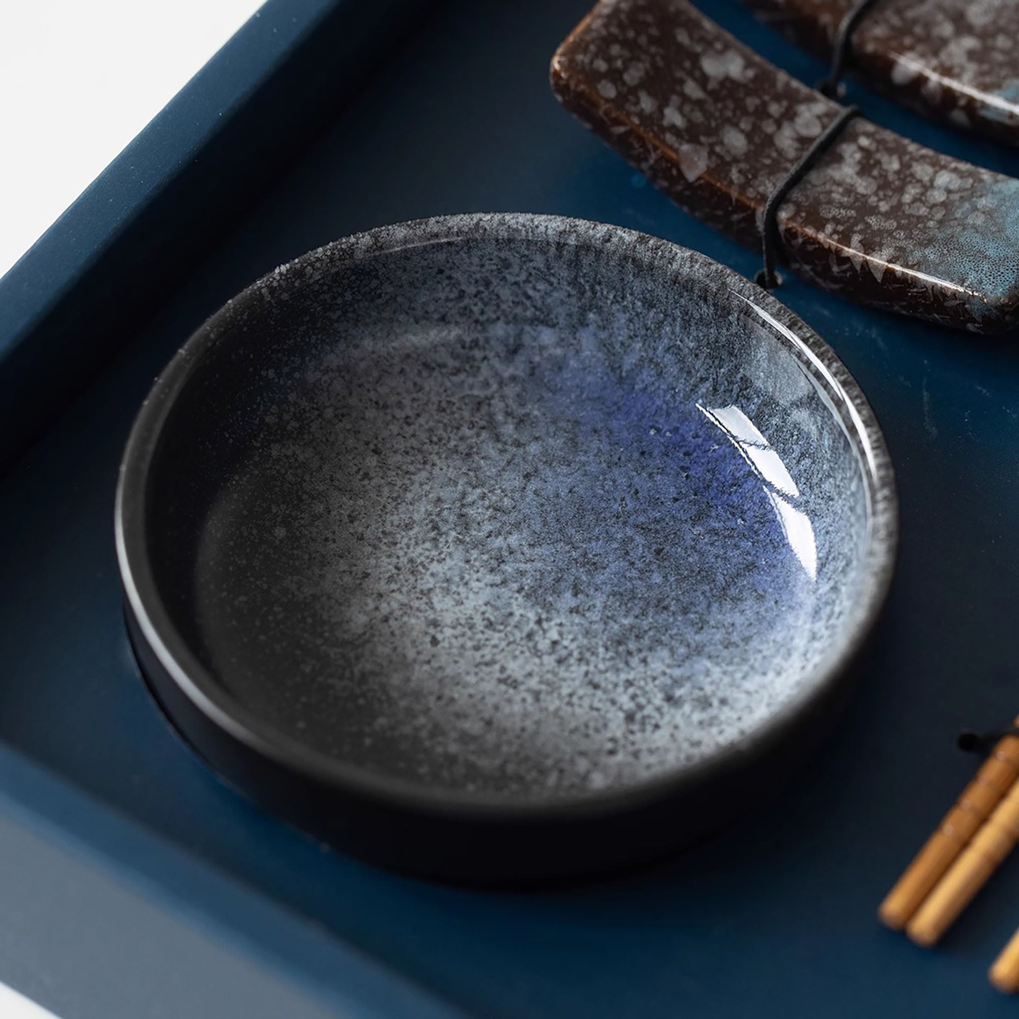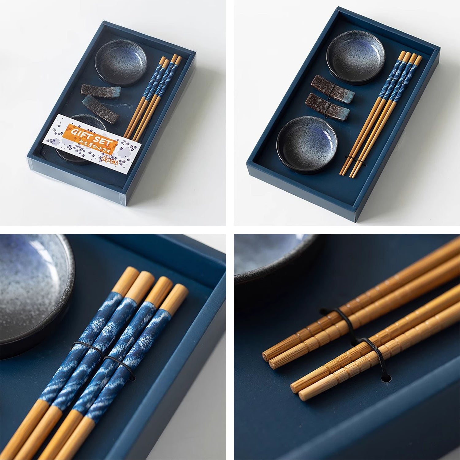 Ce coffret, conçu avec soin par Tanaka Tanahashi, comprend des baguettes en bois naturel, un repose-baguettes en céramique et une coupelle à sauce artisanale. Dominé par des tons bleus, il évoque une esthétique paisible et discrète, avec une texture rustique raffinée. Pensé pour deux personnes, ce coffret symbolise l’union et l’harmonie, idéal pour un usage personnel ou comme cadeau empreint de significations.