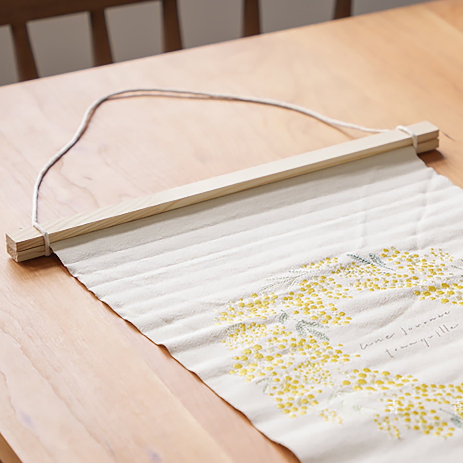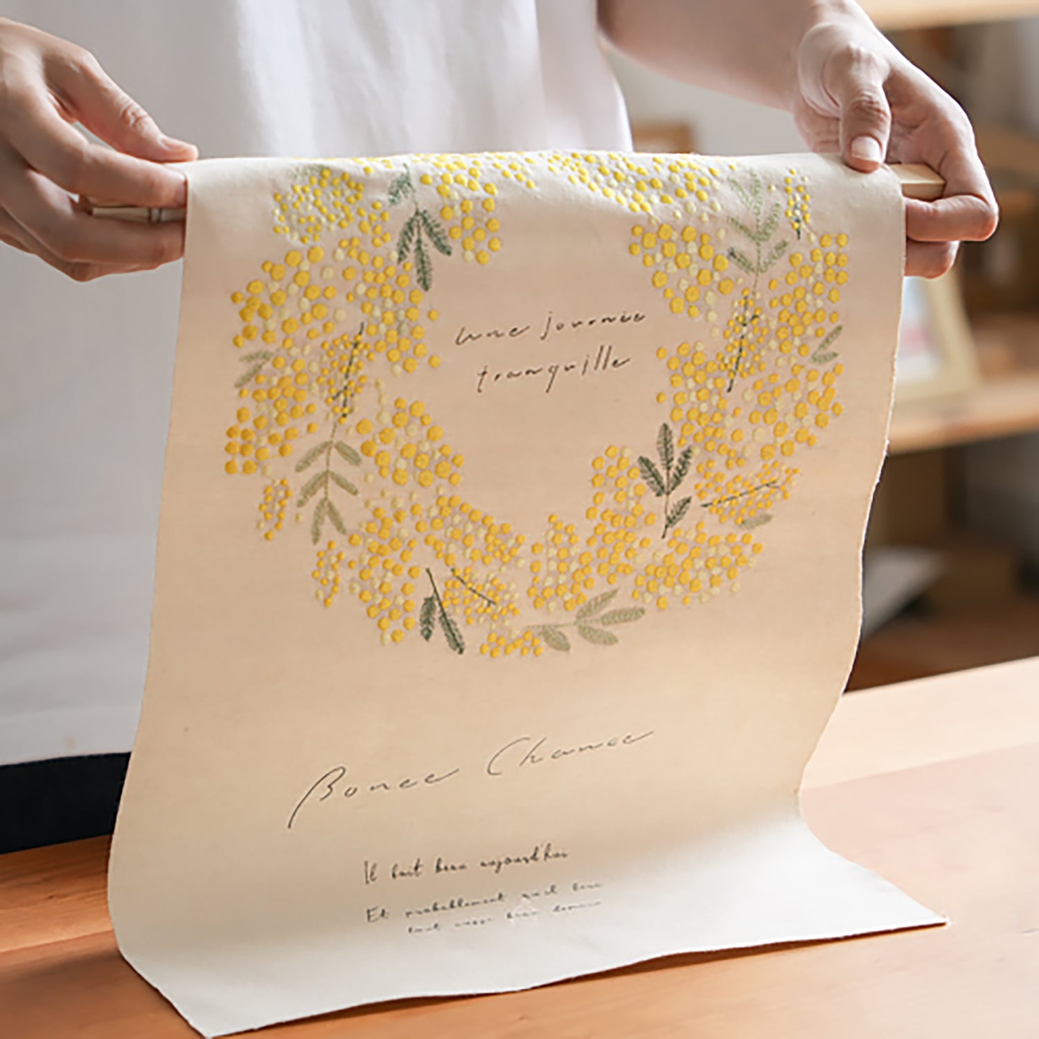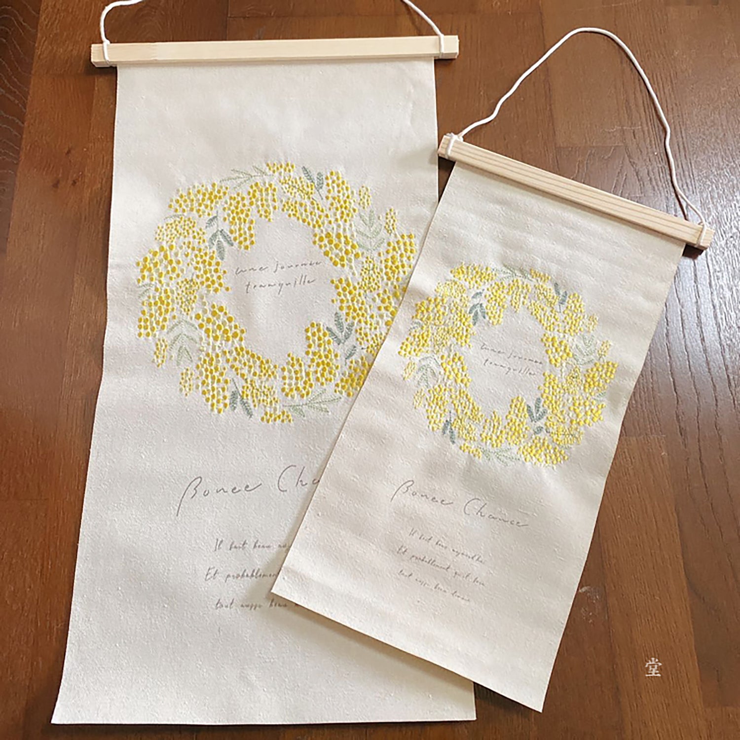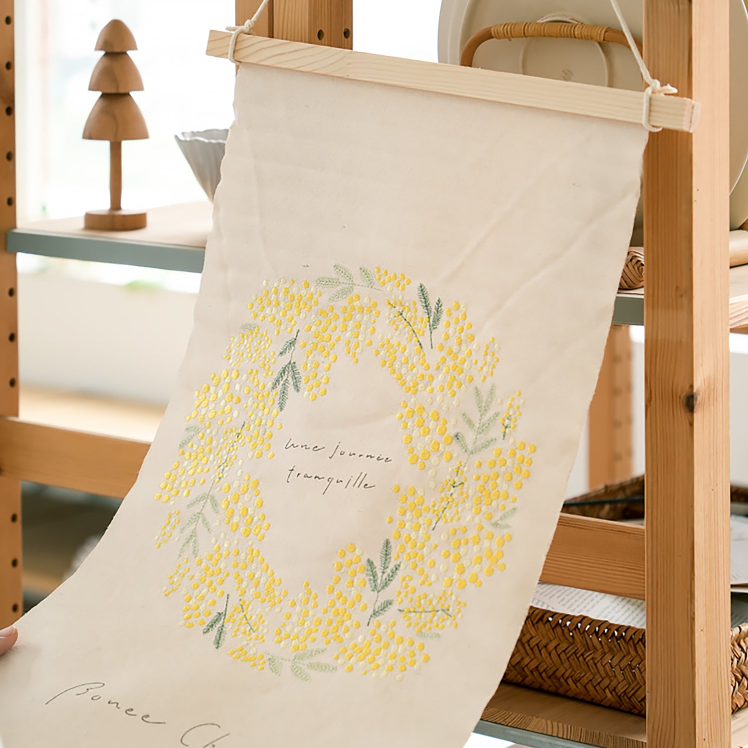 Cette décoration murale en tissu brodé marie esthétique et fonctionnalité, avec des motifs illustrés de carillons, fleurs et plantes, évoquant la douceur du style japonais. Chaque pièce est réalisée avec soin à la main, sur un tissu finement brodé. Facile à accrocher grâce à sa barre en bois incluse, elle s’installe aisément sur un mur ou une porte. Légère, poétique et pratique, elle apportera une touche de sérénité à votre intérieur.