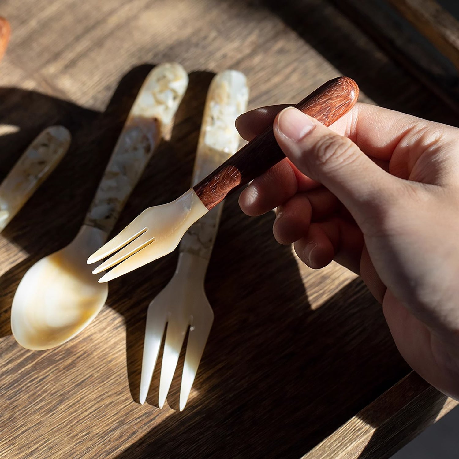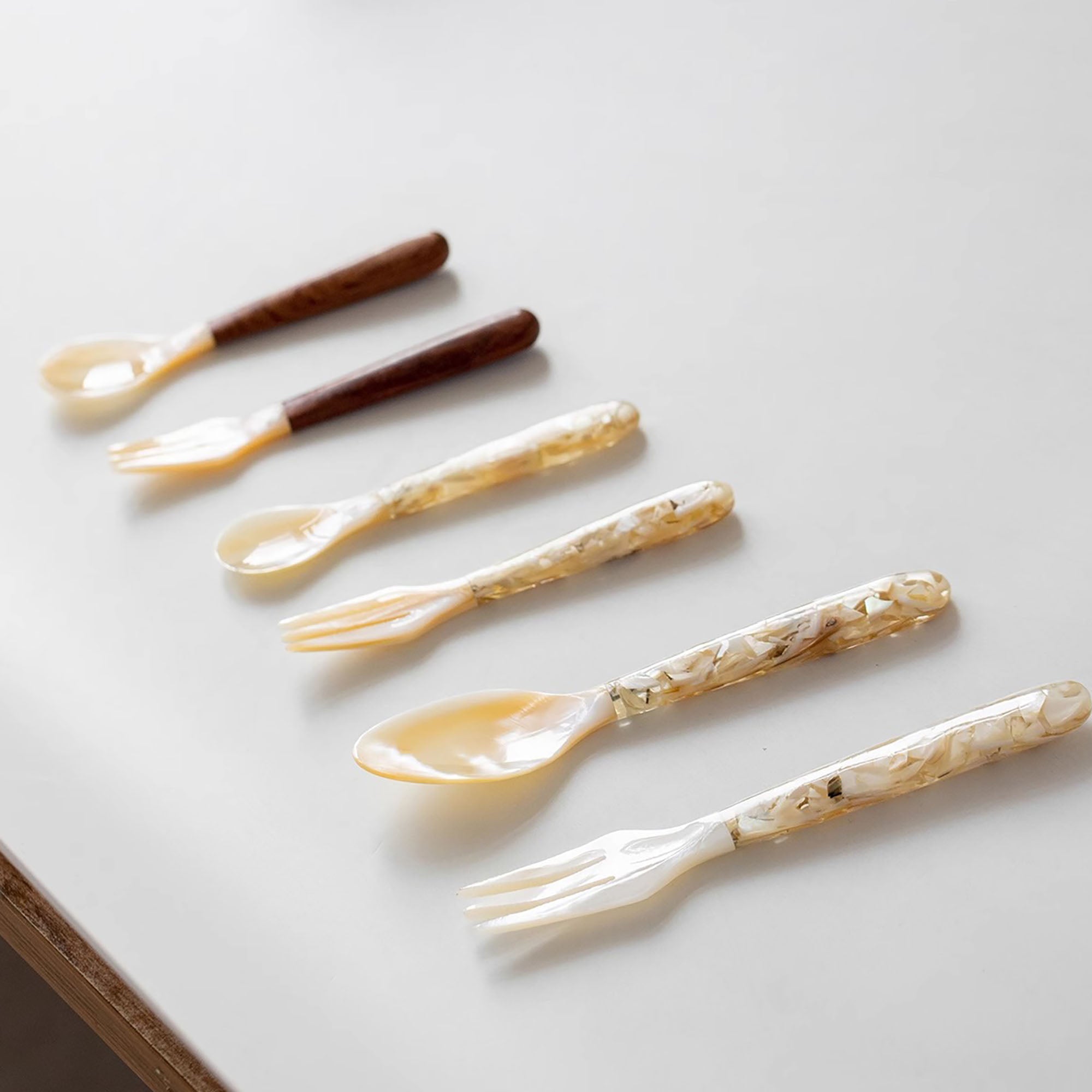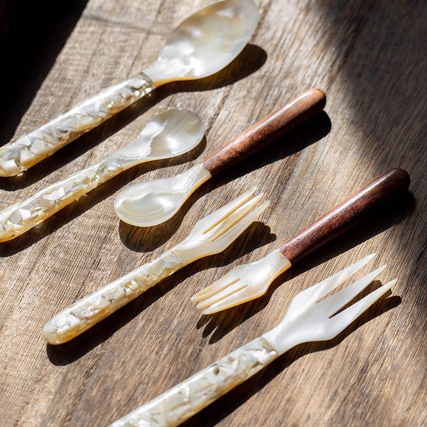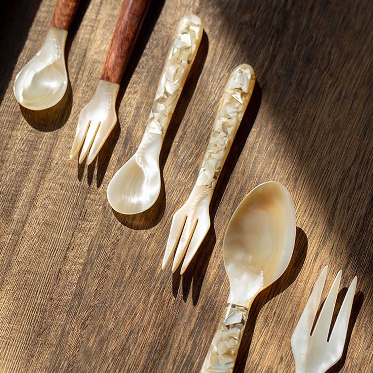 Cette collection de fourchette et cuillère à dessert en nacre naturelle est minutieusement façonné à la main. Chaque pièce révèle la pureté et la beauté des matériaux naturels, offrant une touche d’authenticité et de raffinement à votre table.