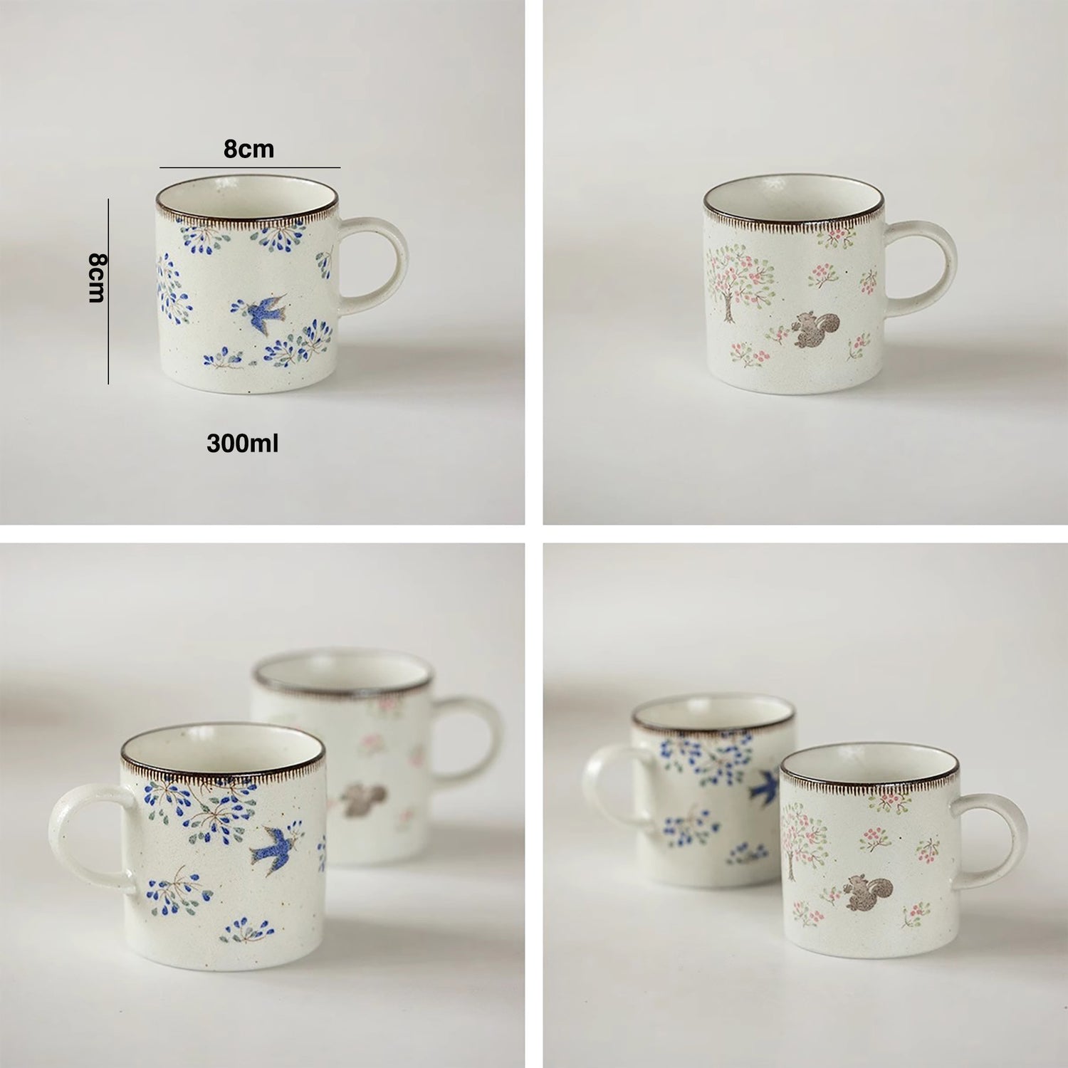 Ce mug est fabriqué selon la tradition du Mino-yaki japonais, utilisant une technique artisanale de peinture sous glaçure sans plomb à haute température. Orné de charmants motifs champêtres d’oiseaux et d’écureuils dessinés à la main, il évoque une ambiance douce et nostalgique. Ses teintes naturelles ajoutent une touche chaleureuse et apaisante à vos moments de dégustation.