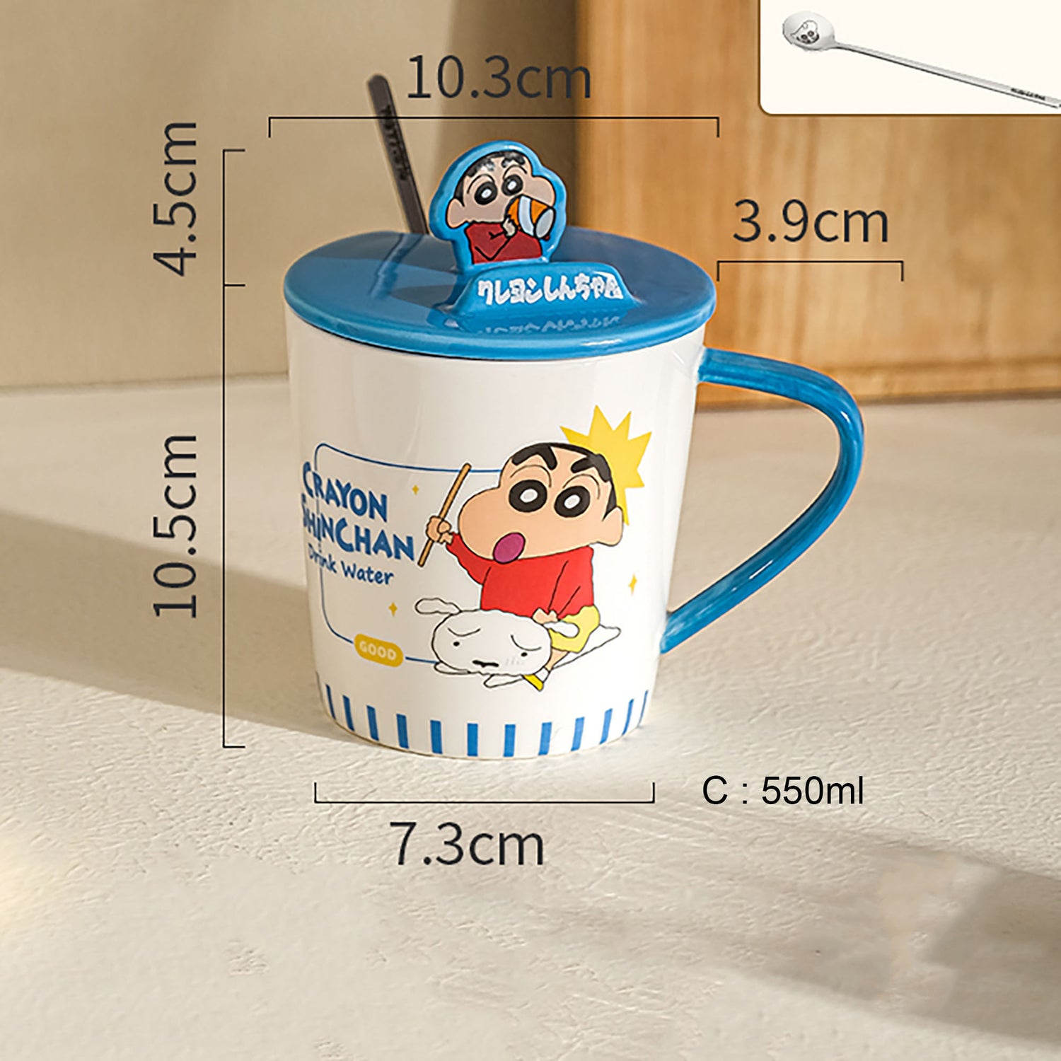 Ce mug en céramique est décoré de motifs adorables de Crayon Shin-chan, appliqués grâce à une technique de sous-glaçure, garantissant des couleurs vives et durables. Le couvercle en céramique astucieusement conçu présente une figurine de Crayon Shin-chan qui peut également servir de support pour téléphone, ajoutant une fonctionnalité supplémentaire au mug. Avec une capacité adéquate, ce mug est parfait pour préparer de petites portions de nouilles instantanées ou pour infuser du thé.