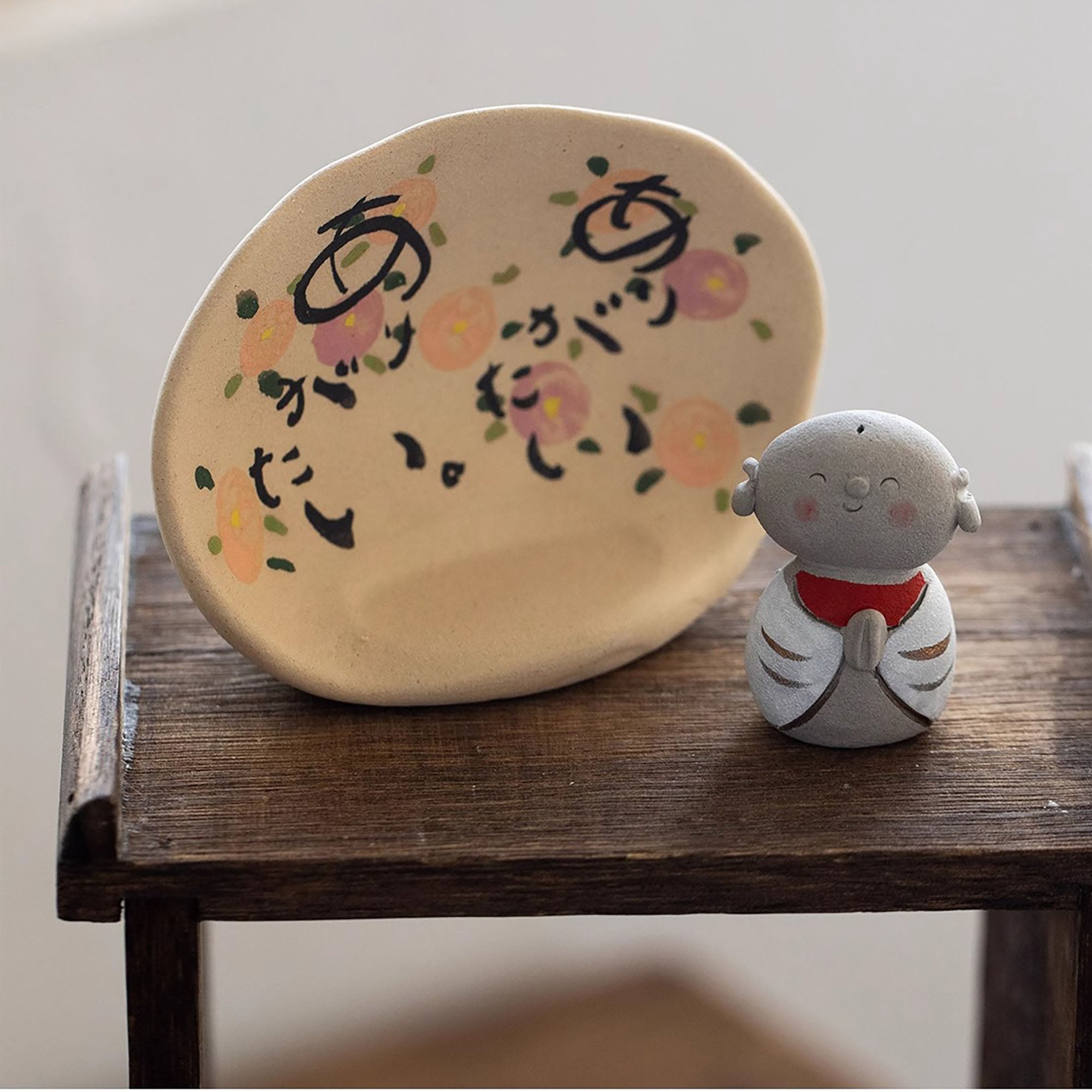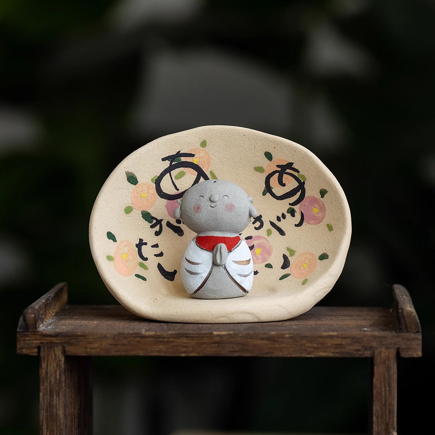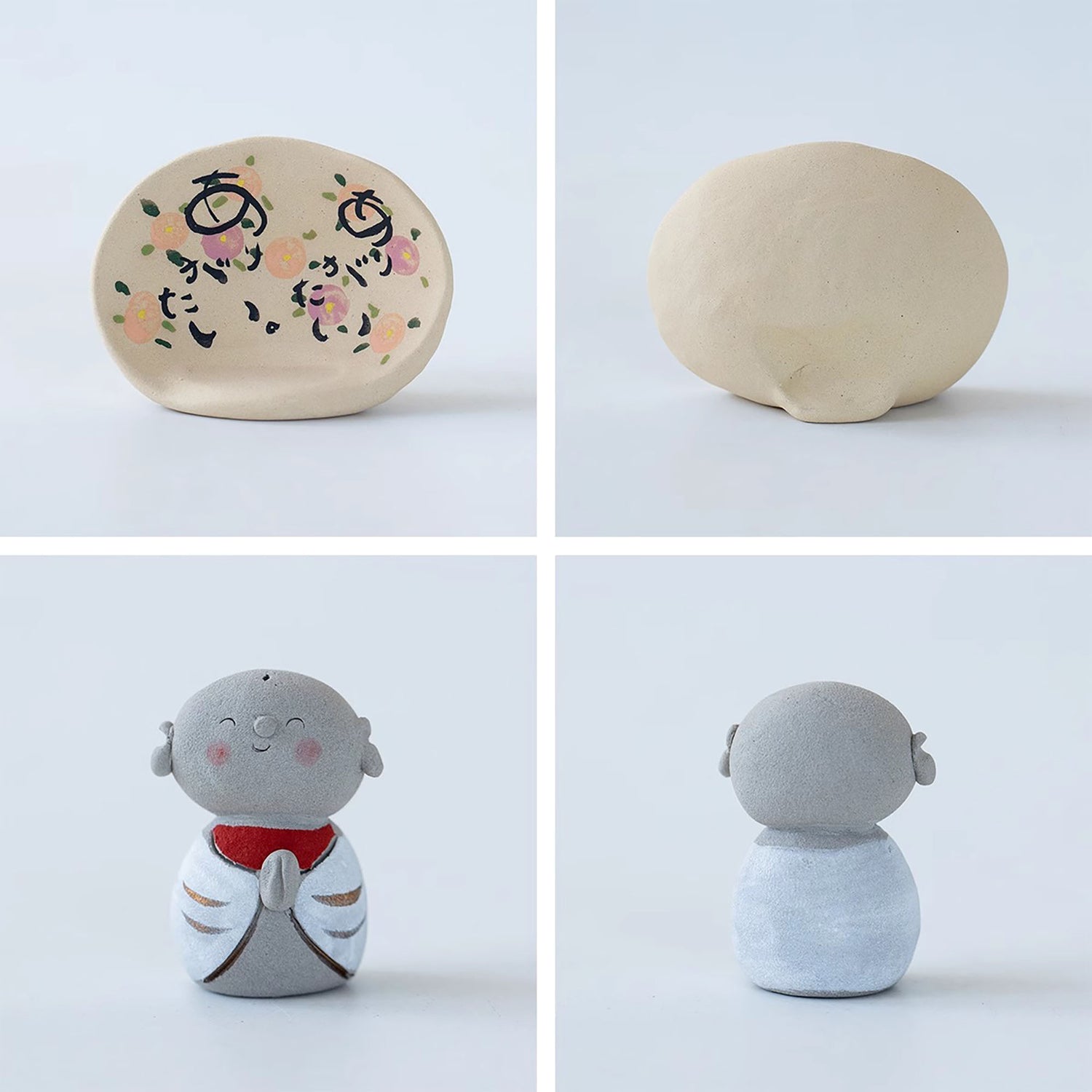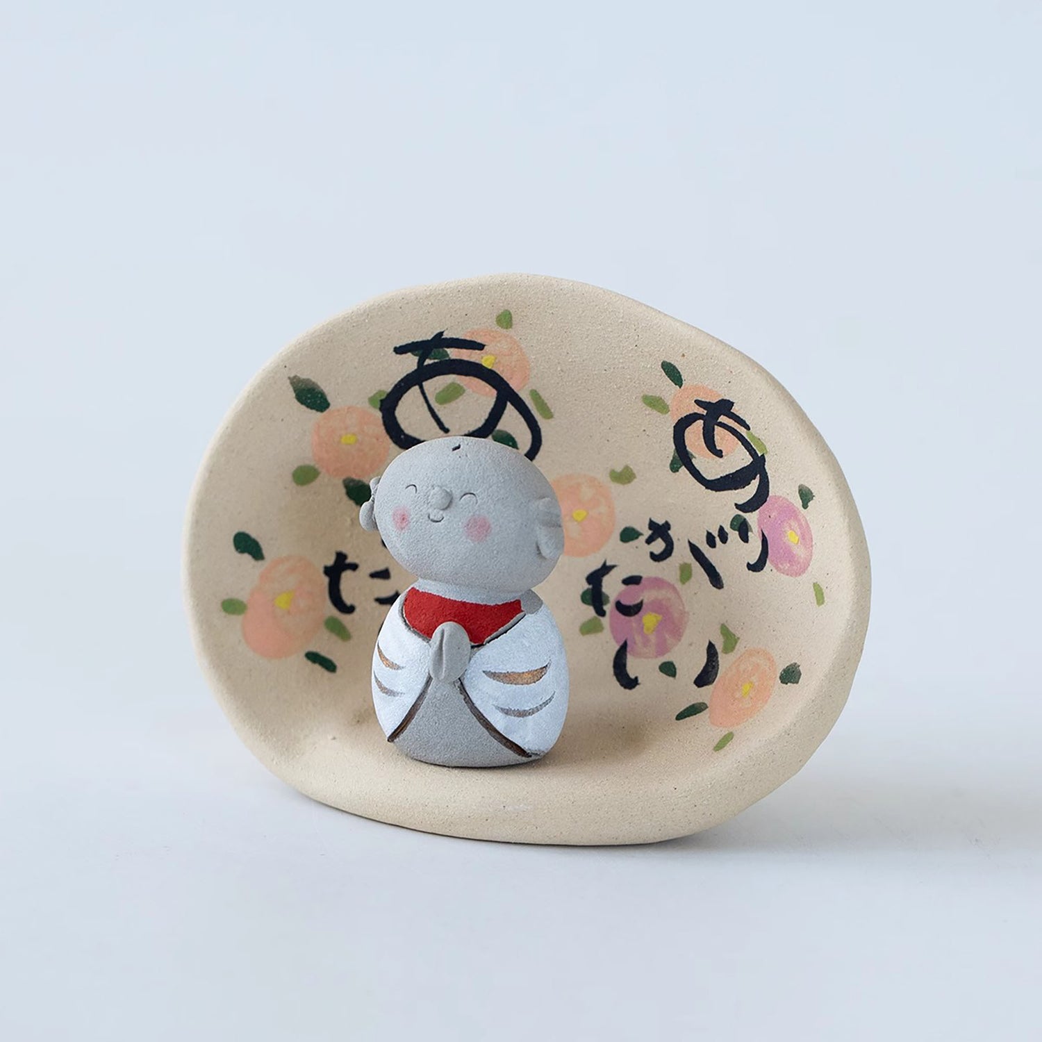 Fabriqué à la main en Mino-yaki traditionnel, ce petit objet décoratif en grès représente Jizō les mains jointes sous une maisonnette de prière. Avec son style artisanal doux et rustique, il apporte une touche chaleureuse, protectrice et apaisante à votre espace de vie.