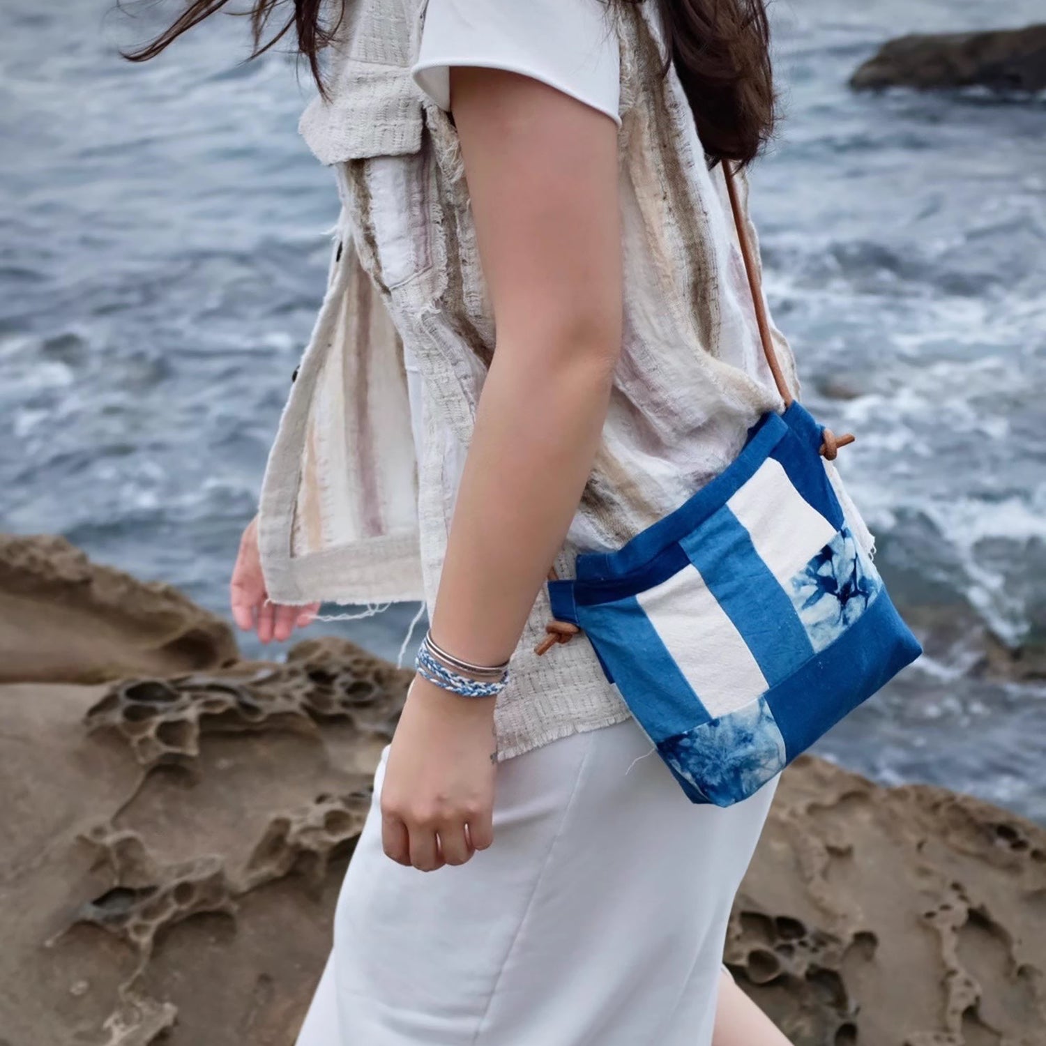 Ce petit sac bandoulière patchwork teint à la main avec des teintures végétales indigo se distingue par sa palette de couleurs bleu et blanc qui lui confère une allure rétro et artistique. La bandoulière en corde de cuir réglable peut être ajustée en nouant simplement le cordon, et l'excédent peut être coupé pour plus de confort. Ce sac se porte à l’épaule ou en travers selon vos besoins. Chaque couture reflète la passion du créateur pour la nature. La fermeture à bouton magnétique est pratique, et la doublure intérieure en toile de coton bleu marine cache une poche ouverte. Les motifs de patchwork sont uniques des deux côtés grâce à des techniques de teinture artisanale, ajoutant une touche d'authenticité et d'exclusivité à chaque pièce. Parfait pour vos sorties quotidiennes, ce sac offre à la fois élégance et praticité.