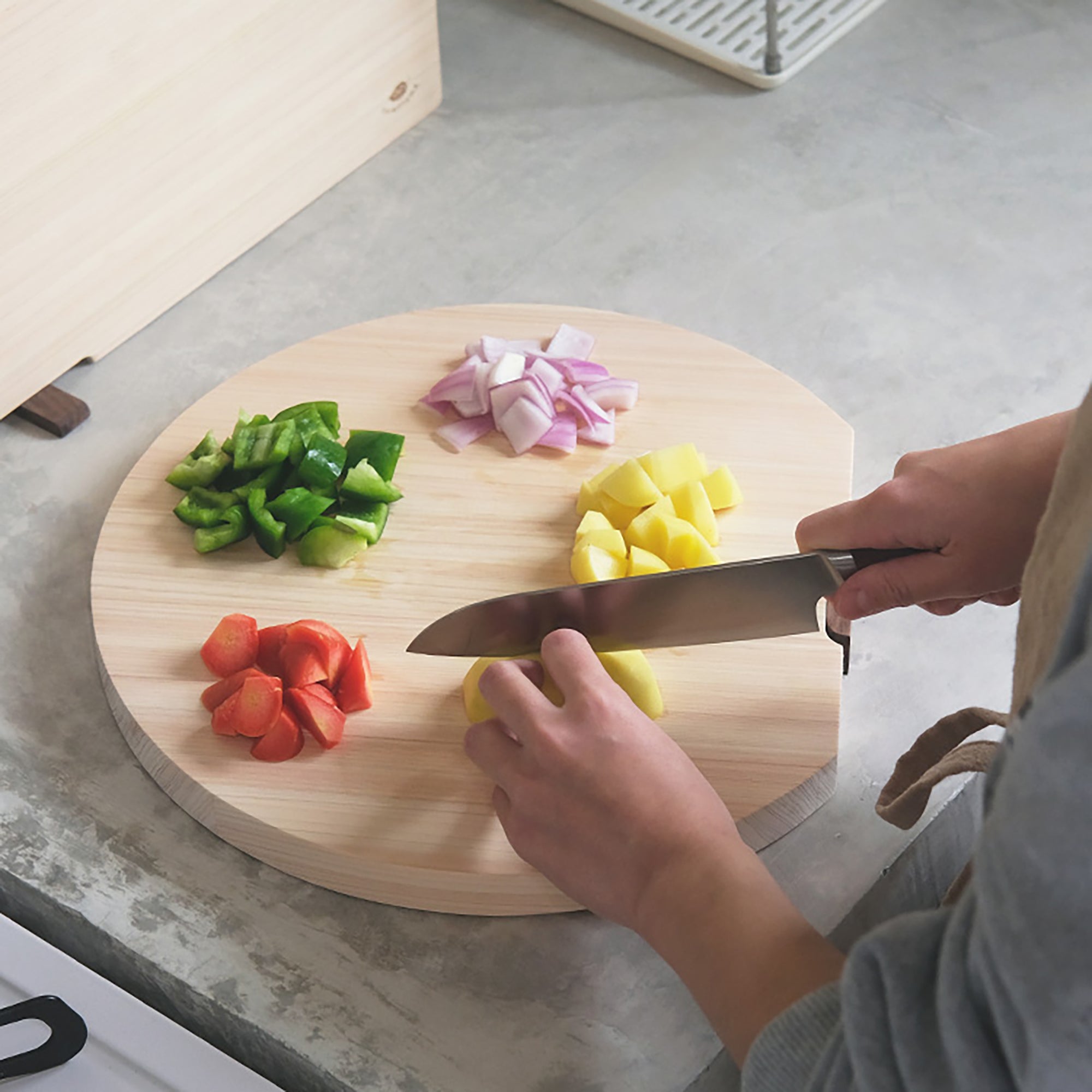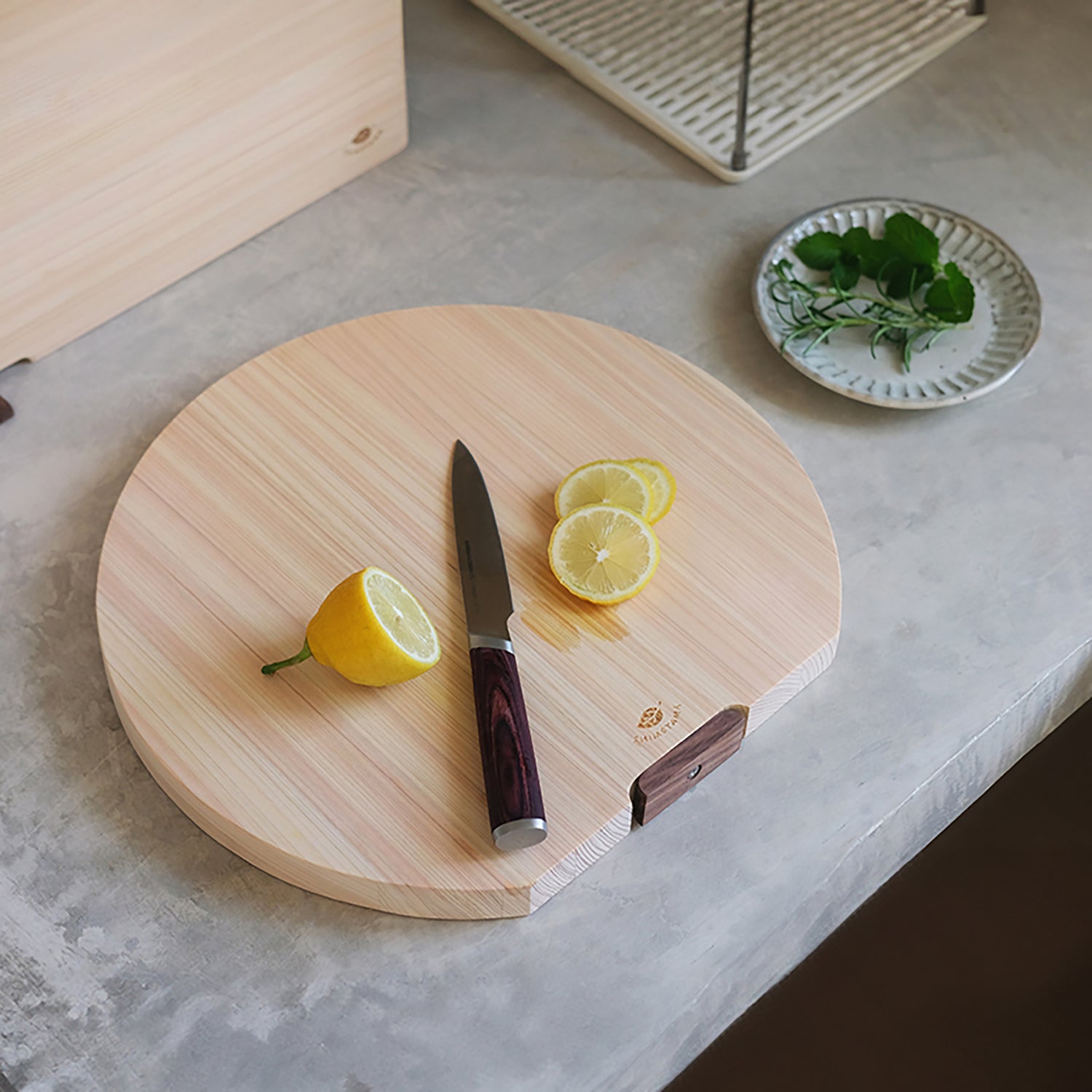 La planche à découper demi-lune Shimoyama est fabriquée à partir de cyprès naturel non traité, offrant un bois au grain fin, naturellement anti-moisissures et anti-insectes, avec un parfum frais et subtil.