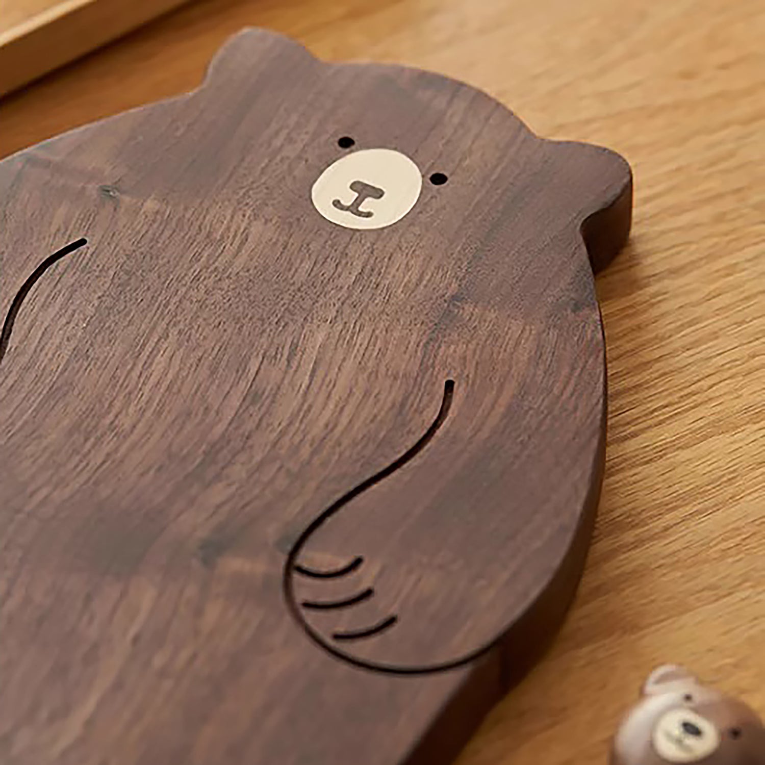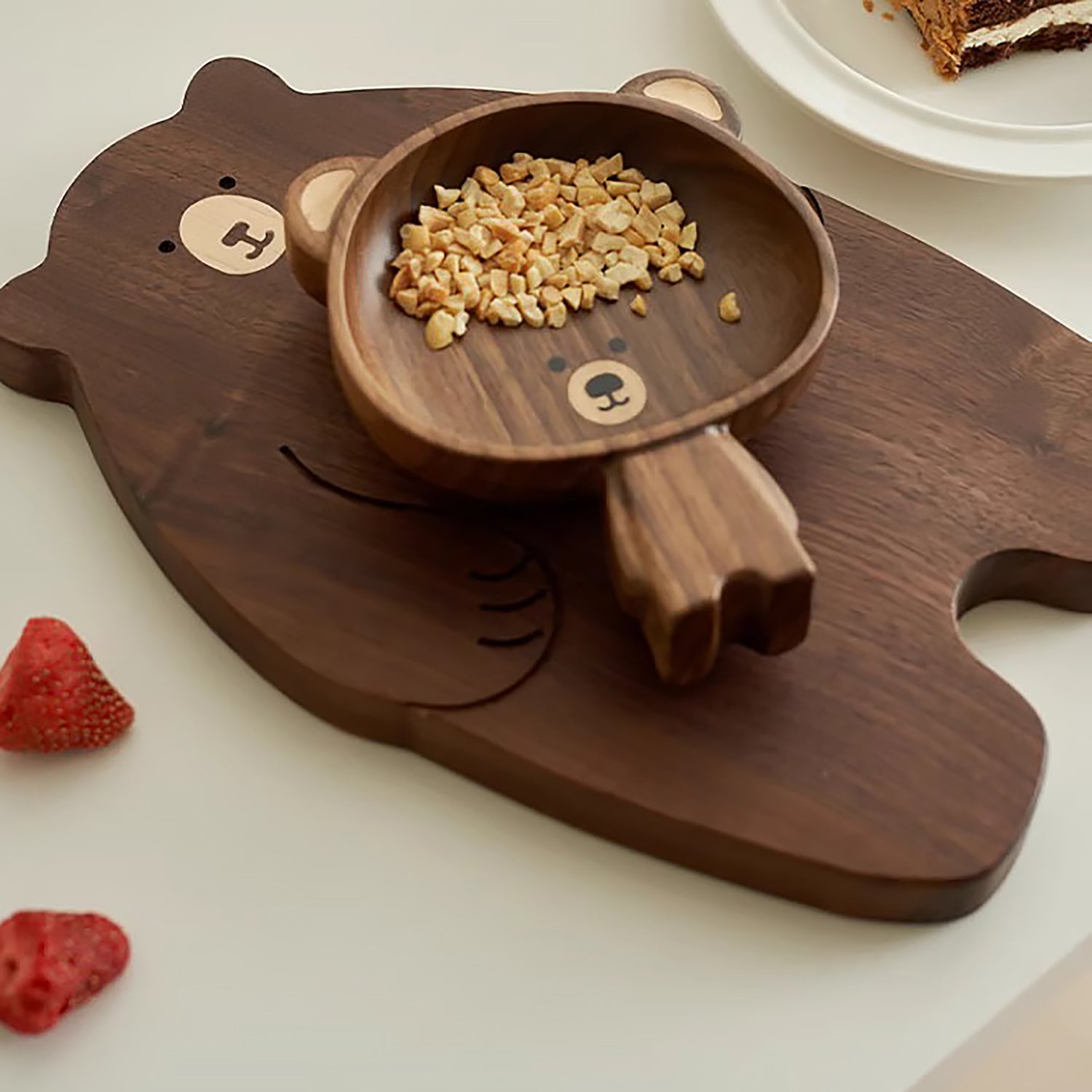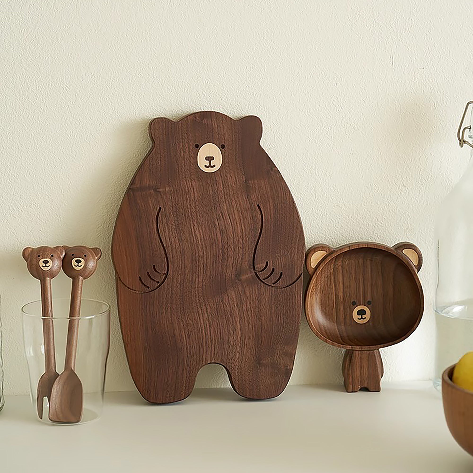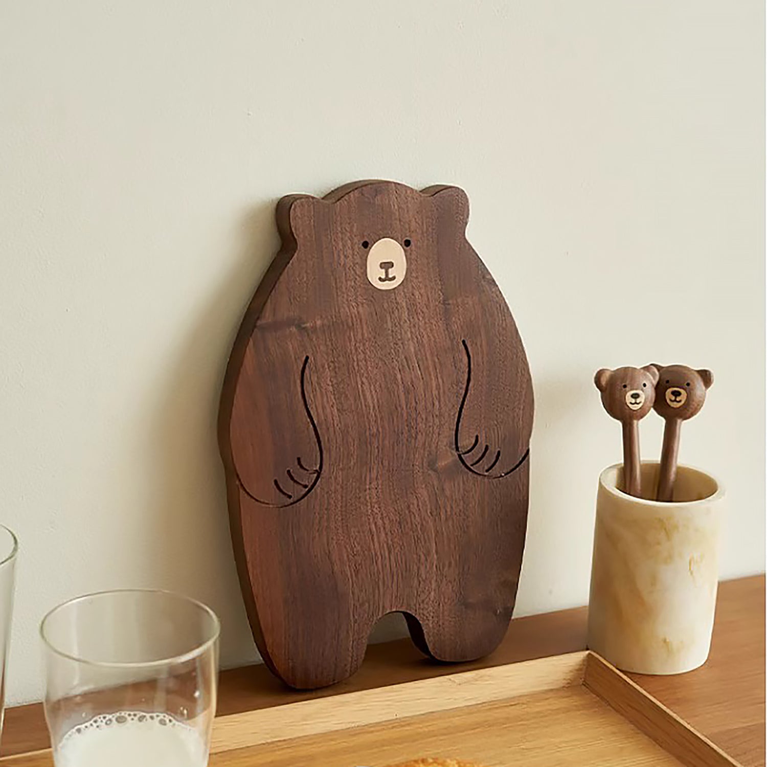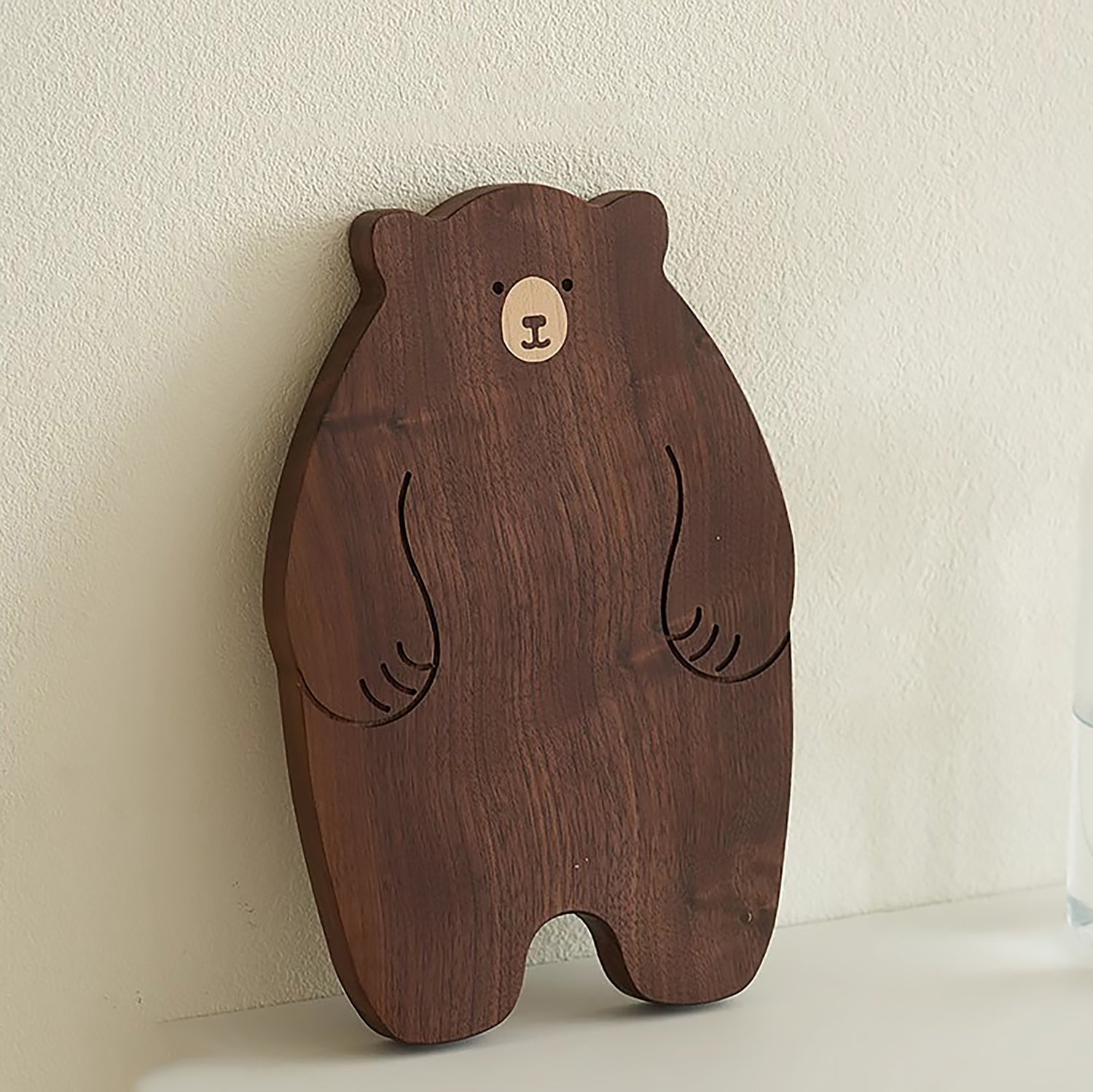 Fabriquée à la main en noyer noir massif, cette planche à découper présente une adorable forme d’ourson avec une incrustation en chêne sur la tête, ajoutant une touche de relief et d’originalité. Robuste et élégante, elle allie fonctionnalité et esthétisme pour égayer votre cuisine. Idéale pour la préparation des repas ou comme cadeau unique et raffiné.