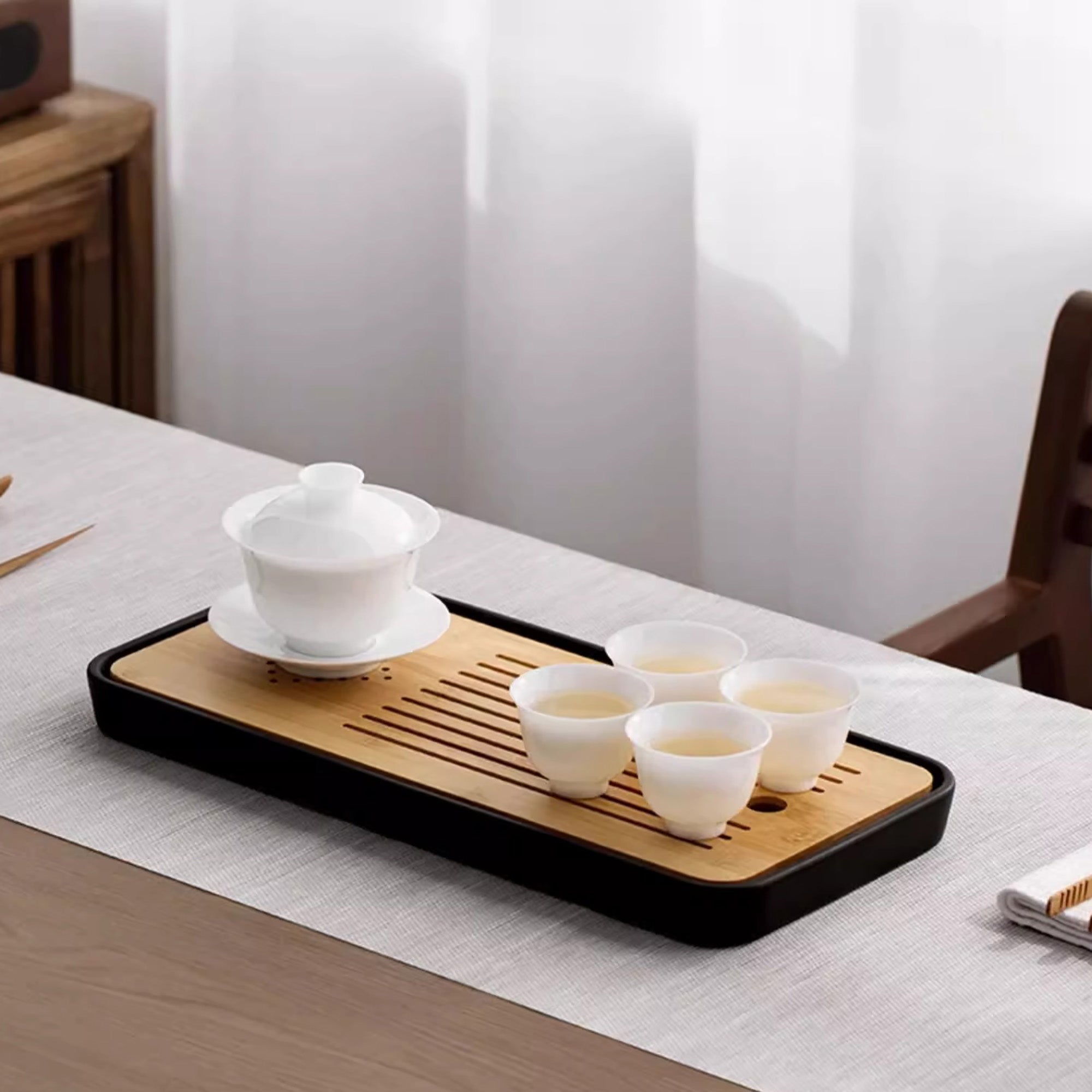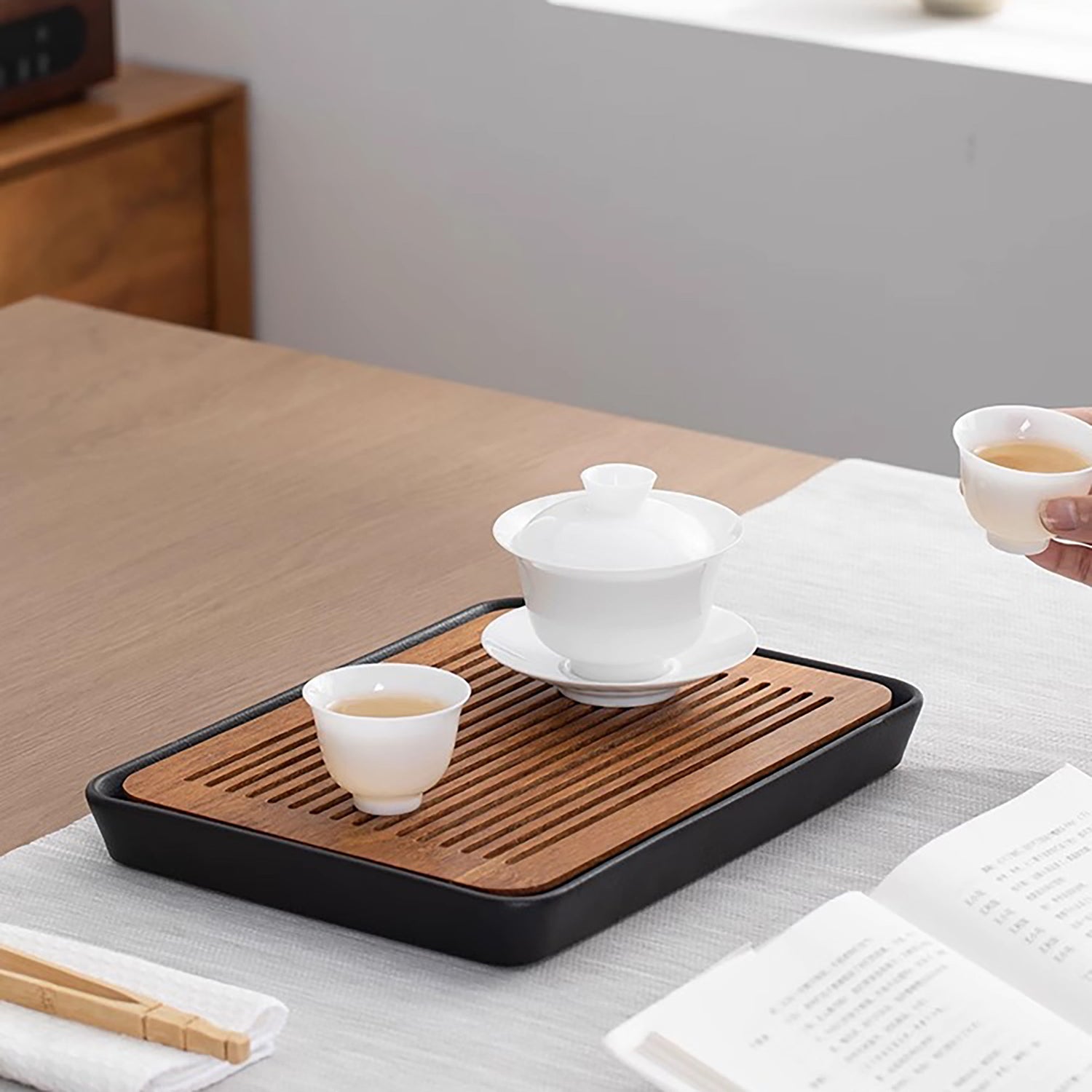 Ce plateau à thé en céramique pour la maison combine une base en céramique noire rustique avec une surface en bambou, créant une ambiance naturelle et vintage. L'association du grès céramique robuste et du bambou raffiné offre une texture élégante et unique, idéale pour diverses cérémonies de thé. Le plateau est conçu avec un système de drainage pour recueillir l'excès d'eau, rendant votre rituel de thé quotidien à la maison plus pratique. C'est le choix parfait pour allier esthétique et fonctionnalité dans votre espace de thé.