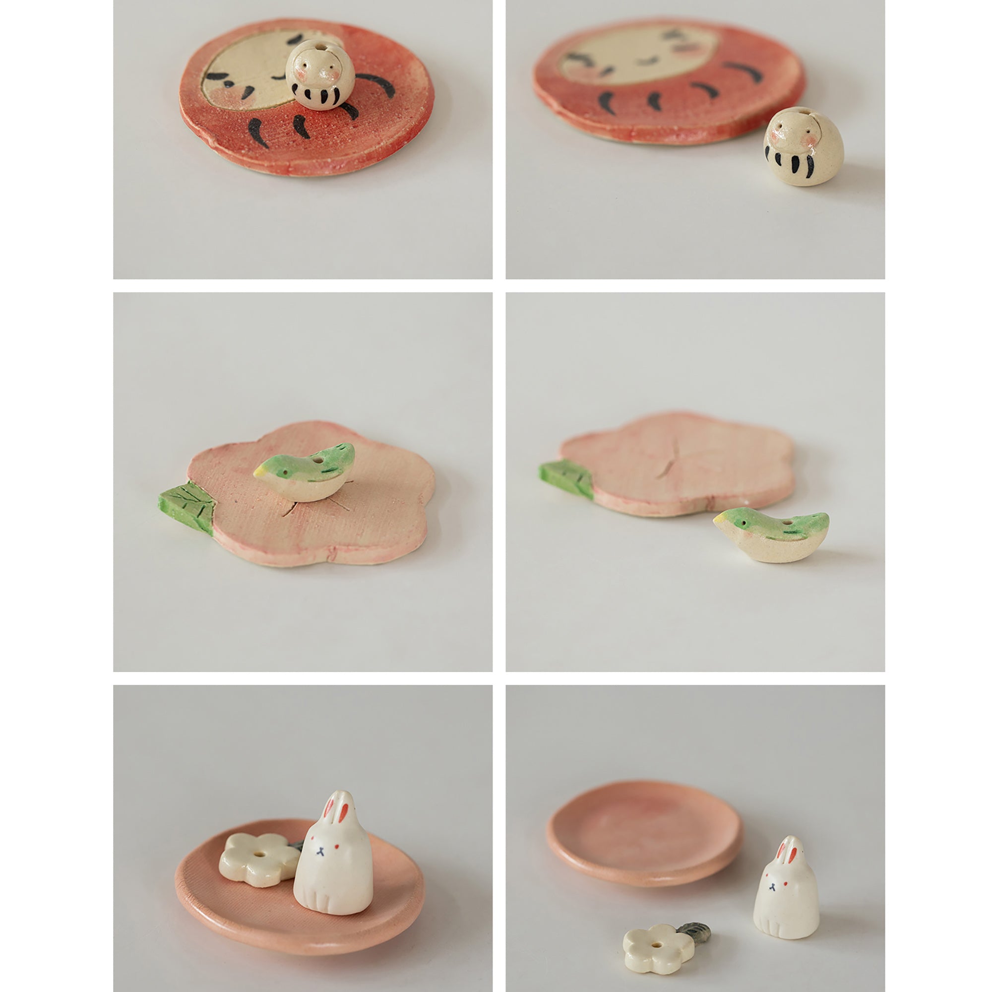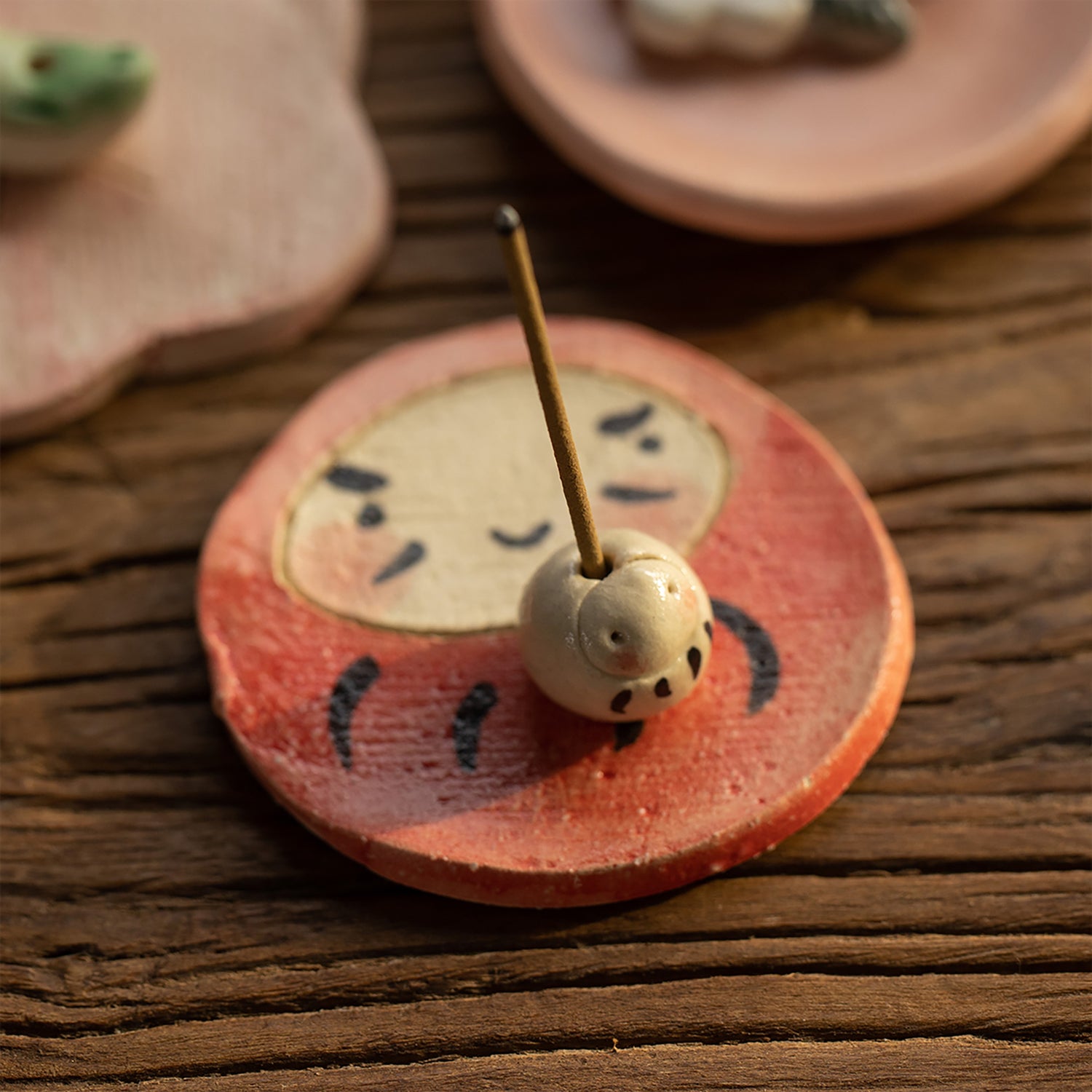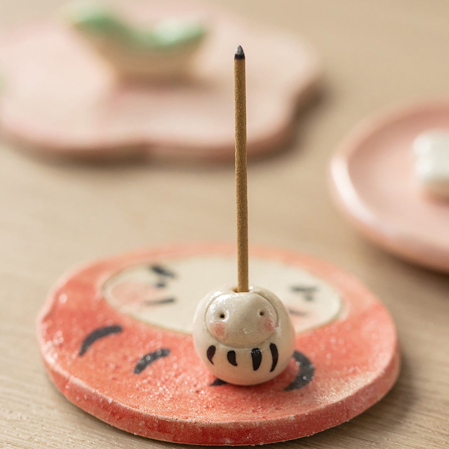 Fabriqué en Seto-yaki avec une finition en grès, ce porte-encens adorable est façonné à la main par des artisans. Orné de motifs soigneusement sculptés, tels que des darumas ou de petits animaux, il allie sérénité et chaleur réconfortante. Parfait pour un usage personnel ou comme cadeau.