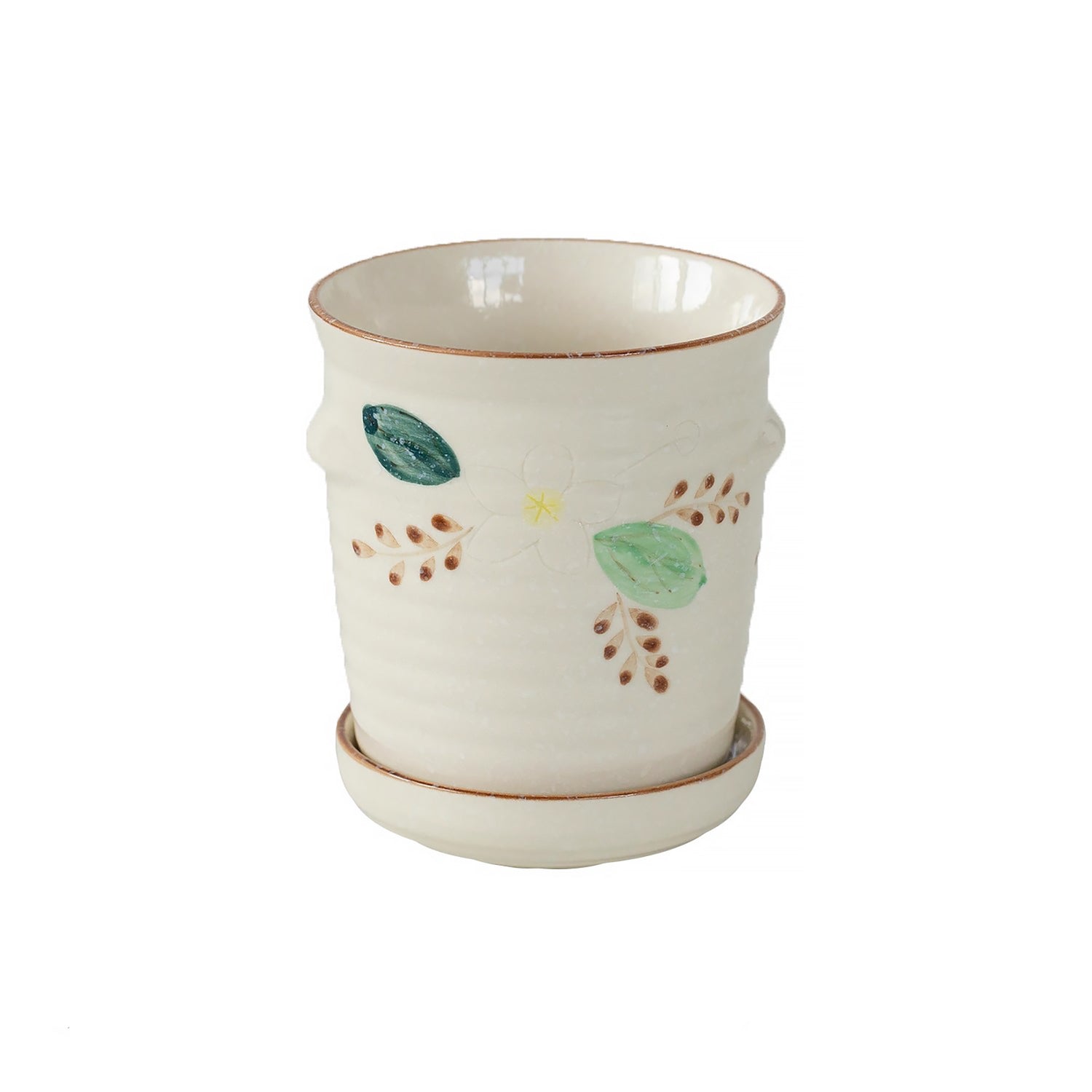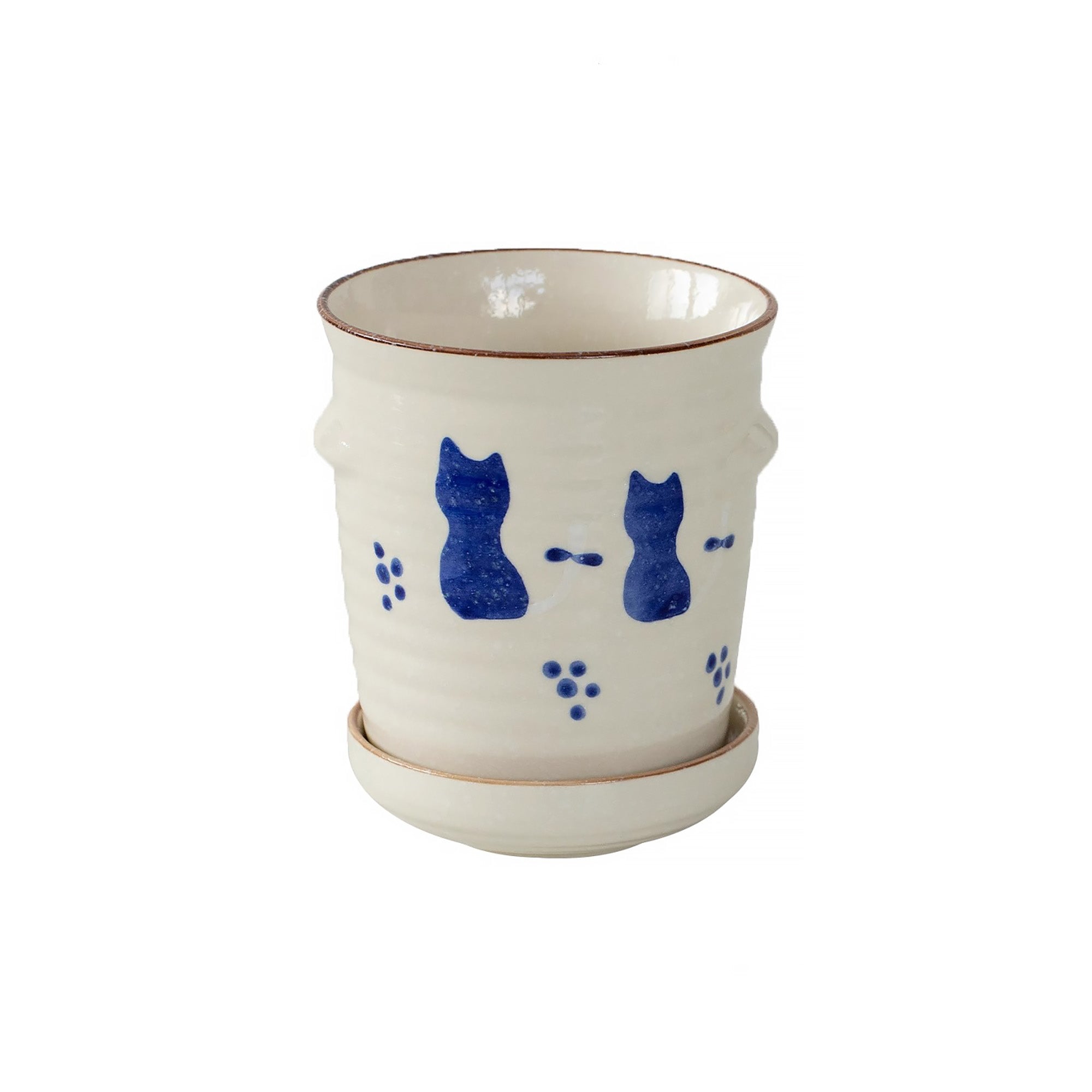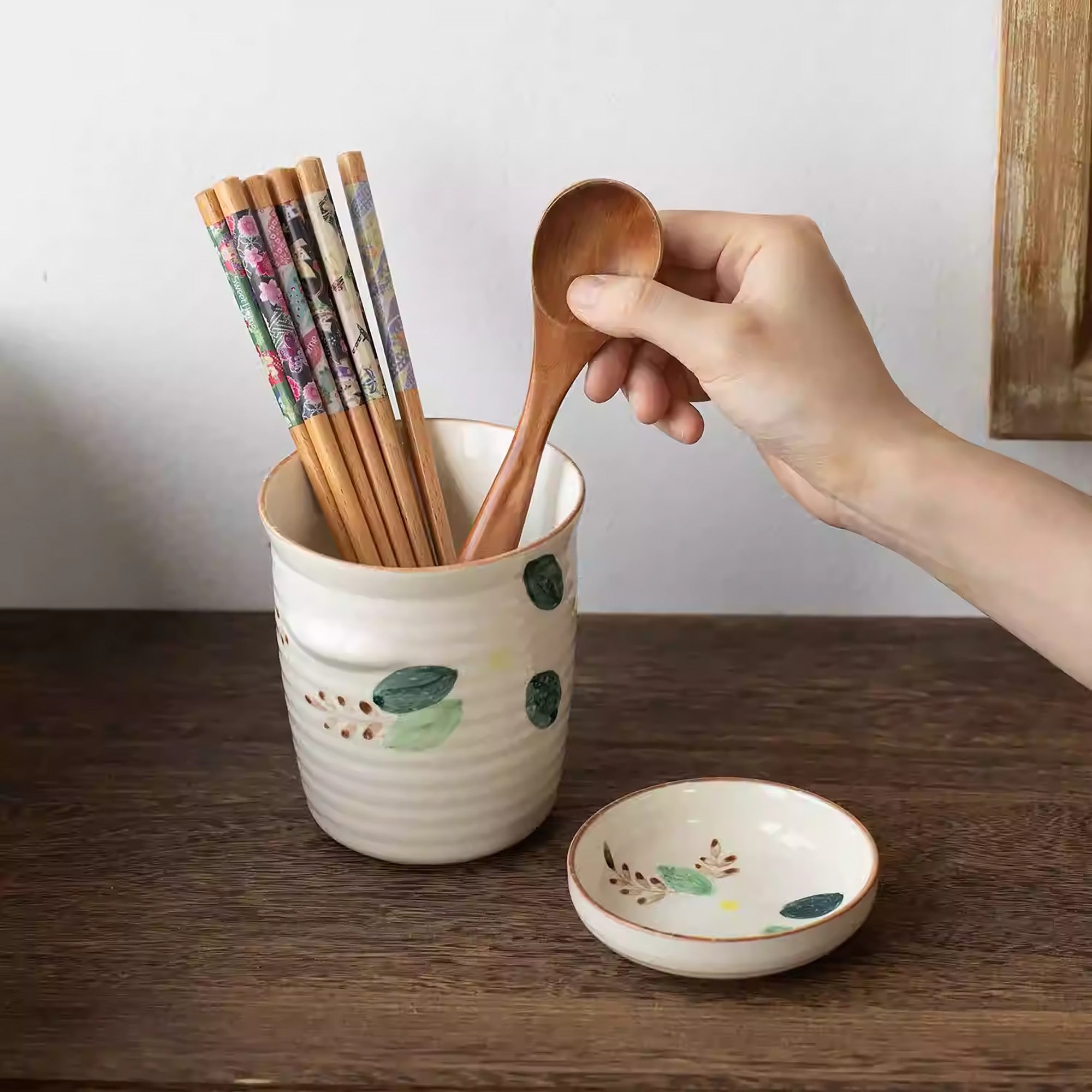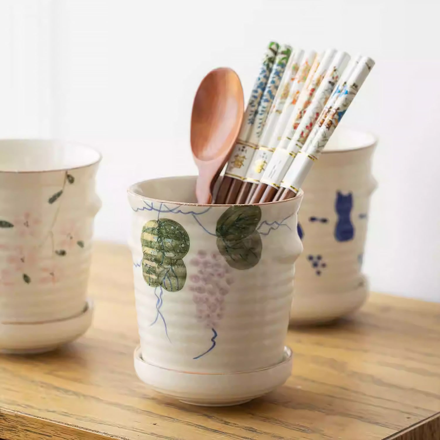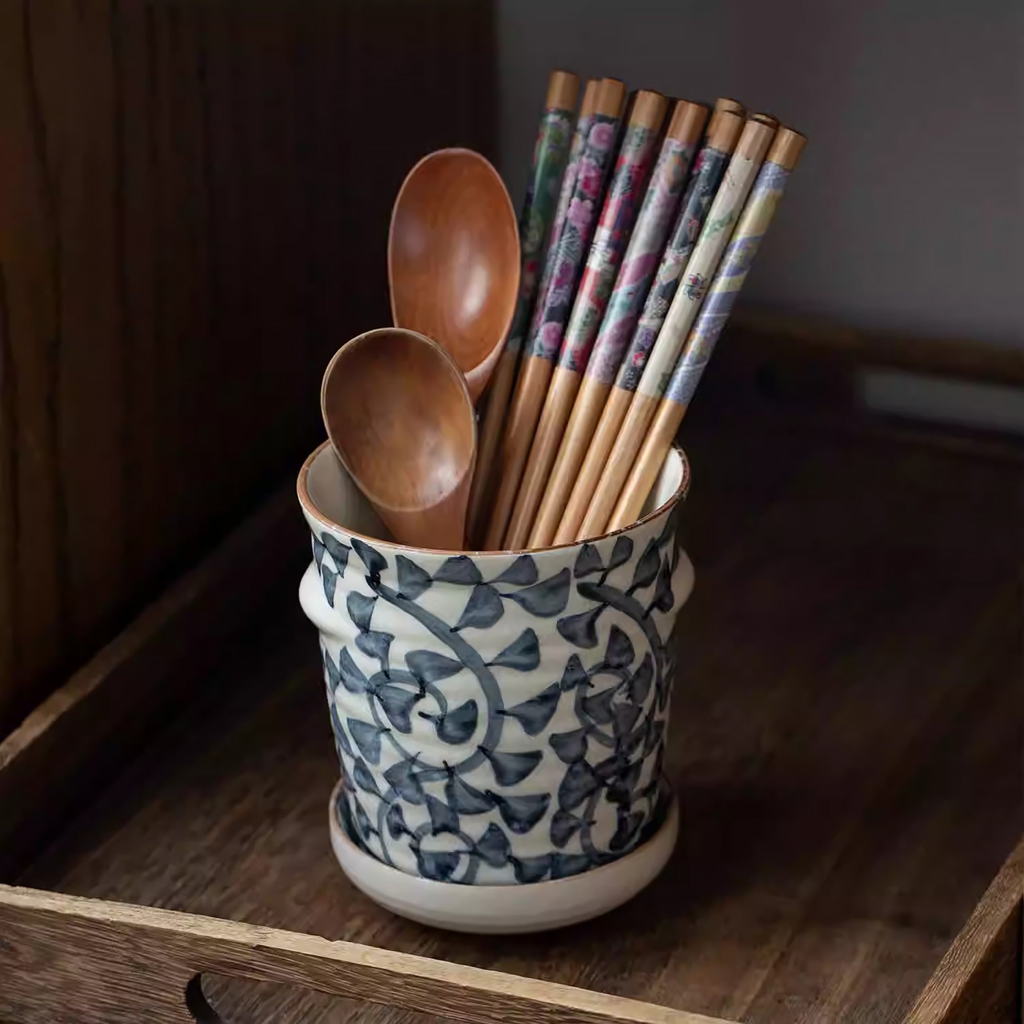 Pot à baguettes en céramique Mino-yaki, décoré à la main avec des motifs japonais délicats tels que fleurs de cerisier, grappes de raisin et chats bleus. Fabriqué à haute température, il offre une texture lisse et résistante. Son fond ajouré favorise la ventilation pour garder les baguettes sèches et propres. Une touche d’élégance artisanale pour la cuisine ou la table.