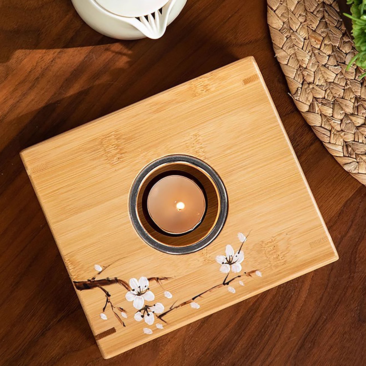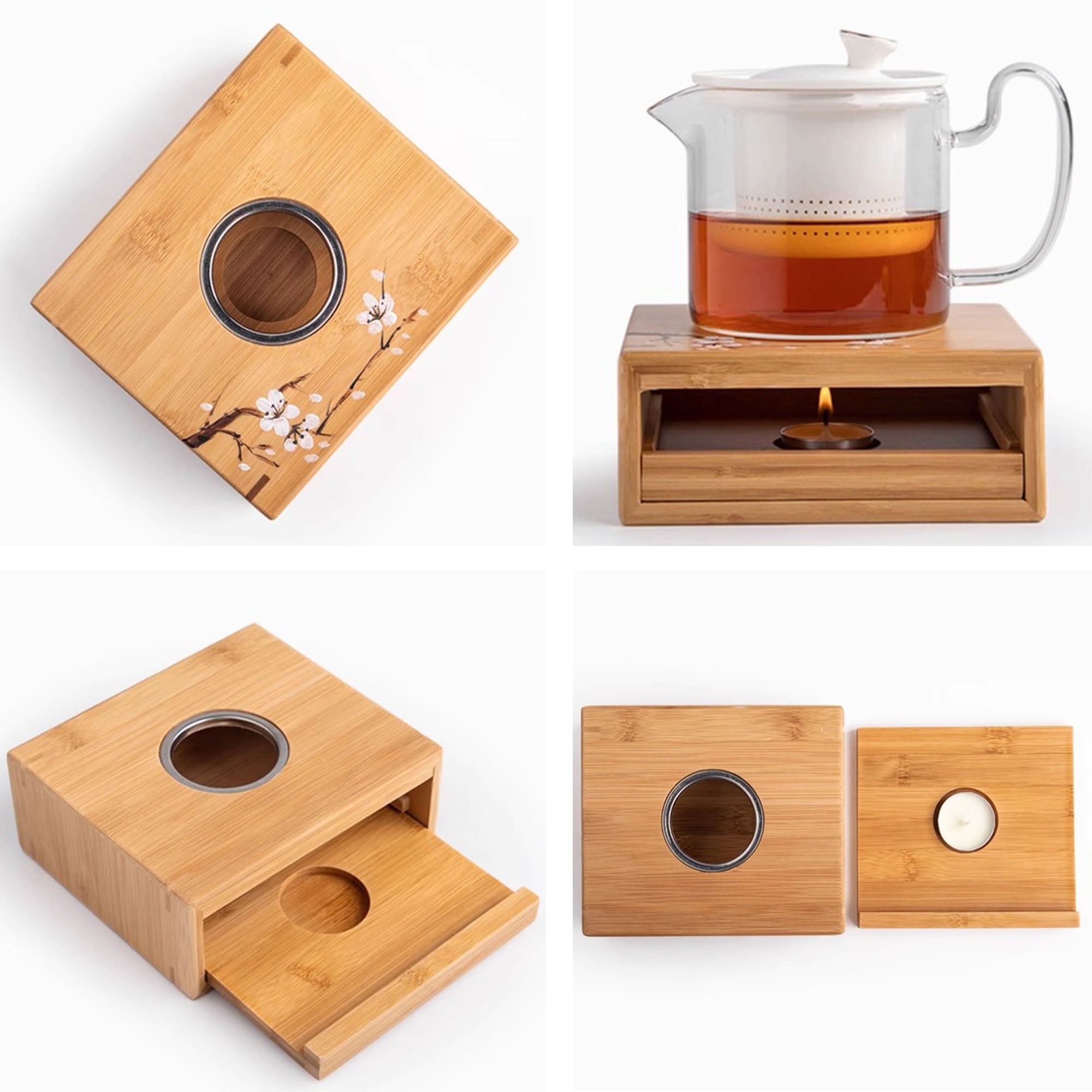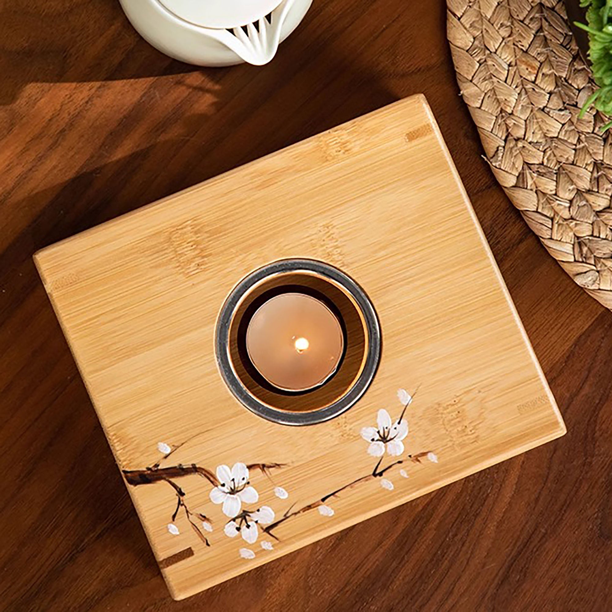 Ce réchaud à bougie pour théière en bambou utilise la technique traditionnelle des joints tenons-mortaises pour une structure solide et durable. Fabriqué en bambou massif avec un grain naturel distinct, il évoque une atmosphère rustique et champêtre. Le motif peint à la main de fleurs de prunier ajoute une touche poétique. Conçu pour s’adapter à la plupart des théières, il est doté d’un porte-bougie coulissant, offrant une commodité parfaite pour votre moment de thé quotidien.