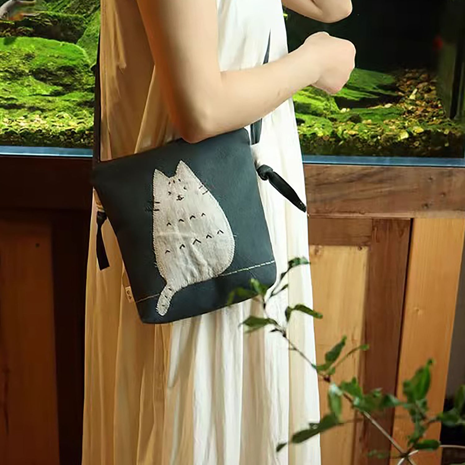 Ce sac bandoulière en toile de lin et coton est fabriqué à la main avec un motif de chat cousu avec soin, ajoutant une touche de vivacité et de mignonnerie. Chaque sac est unique et reflète l'attention méticuleuse portée à sa confection. Idéal pour une utilisation quotidienne, que ce soit pour faire du shopping, aller à l'école ou se promener, ce sac apportera une note ludique et charmante à votre tenue.