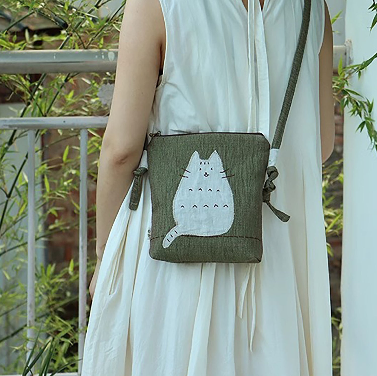 Sac bandoulière en toile lin et coton fait à la main avec mignon motif chat