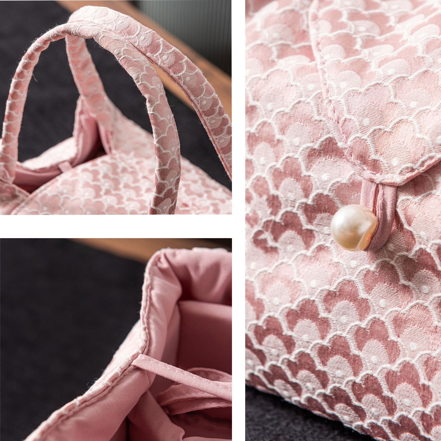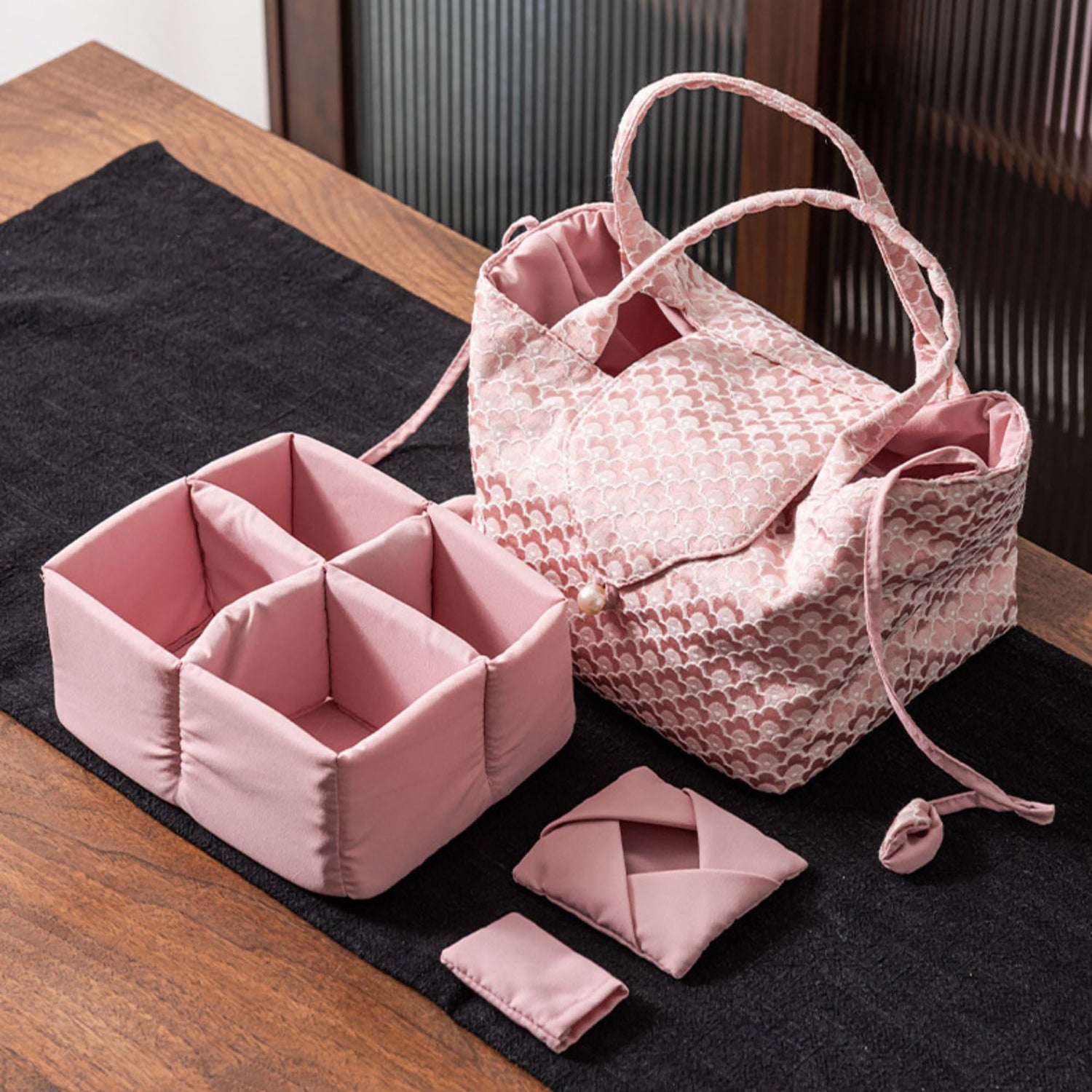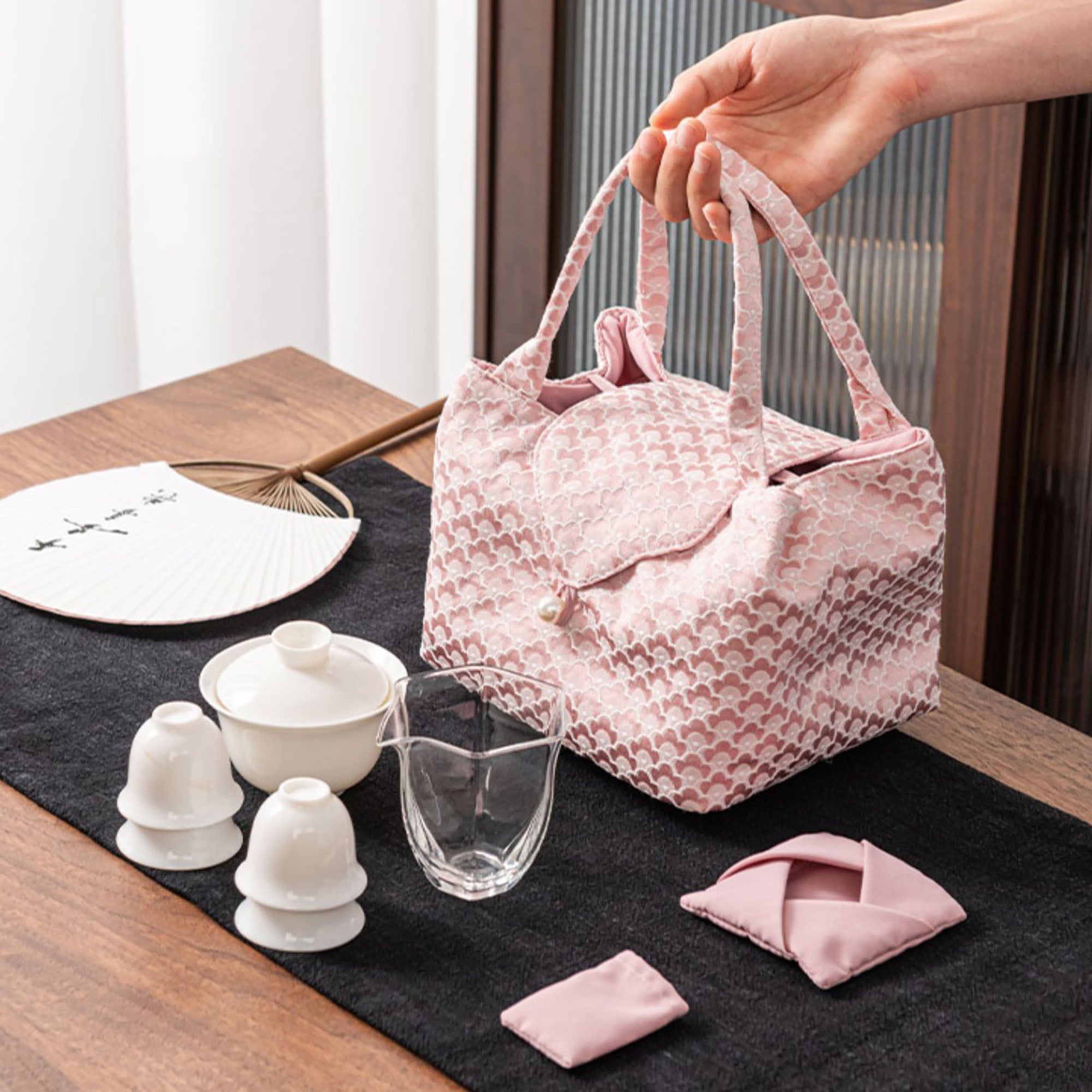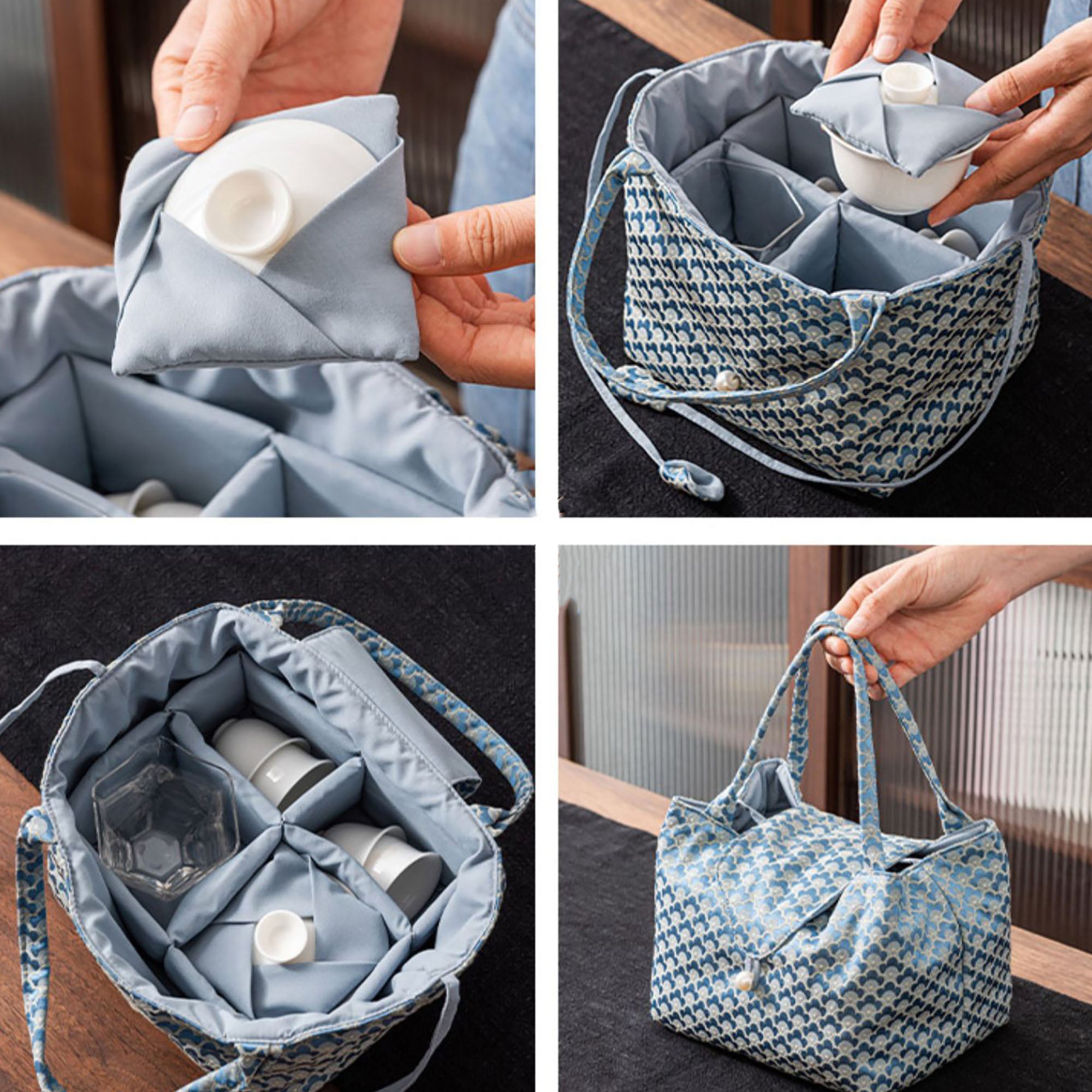 Ce sac de rangement pour accessoires à thé est fabriquée à la main avec un tissu en brocart, offrant une sensation douce et agréable au toucher. Le design à cordon, associé aux motifs traditionnels de nuages, donne un charme oriental unique. Avec une couture à double couche et quatre compartiments de rangement amovibles, elle permet de ranger vos accessoires à thé de différentes tailles. Chaque compartiment est renforcé pour offrir une protection optimale à votre service à thé lors de vos déplacements. Idéale pour un usage quotidien ou en voyage, elle est élégante et pratique.