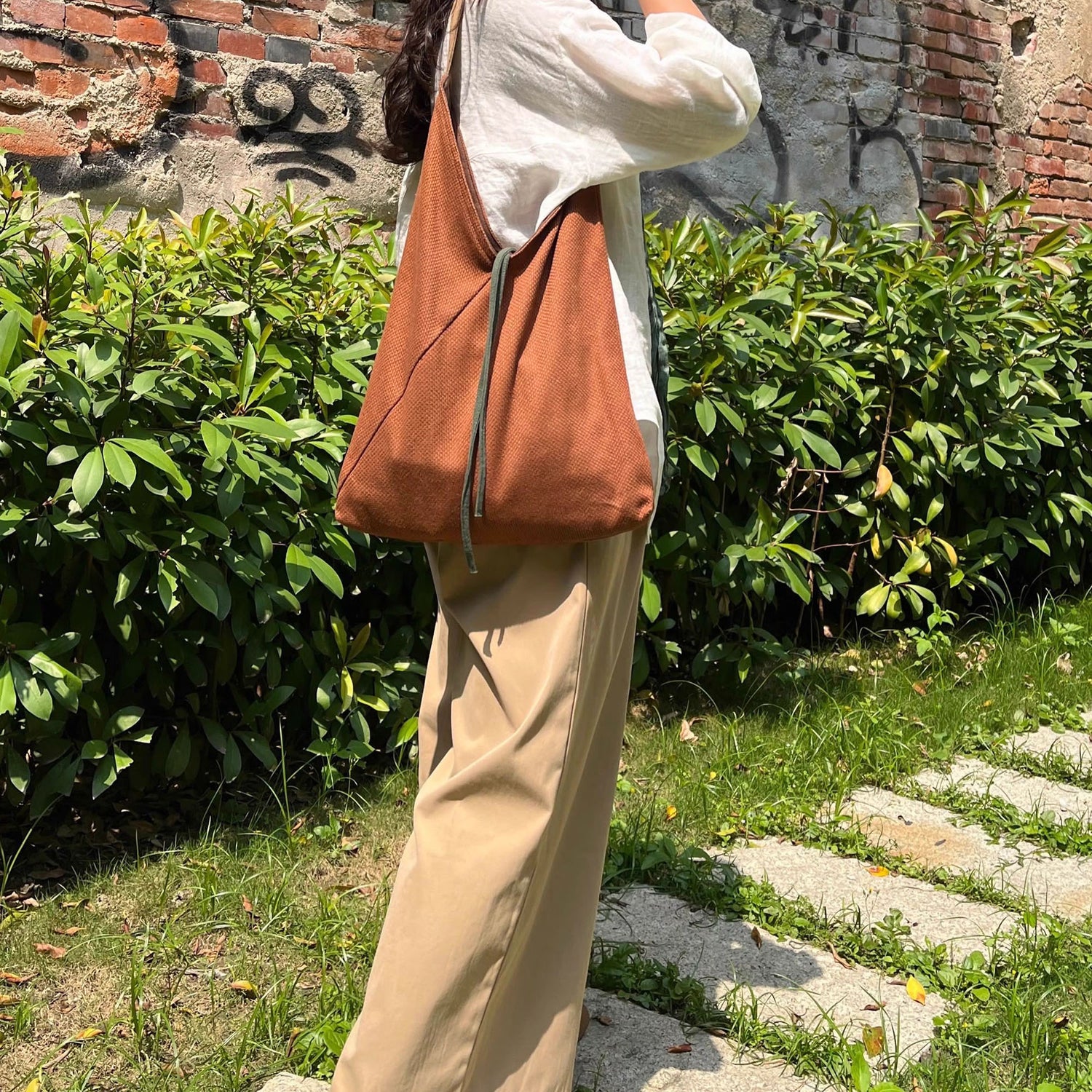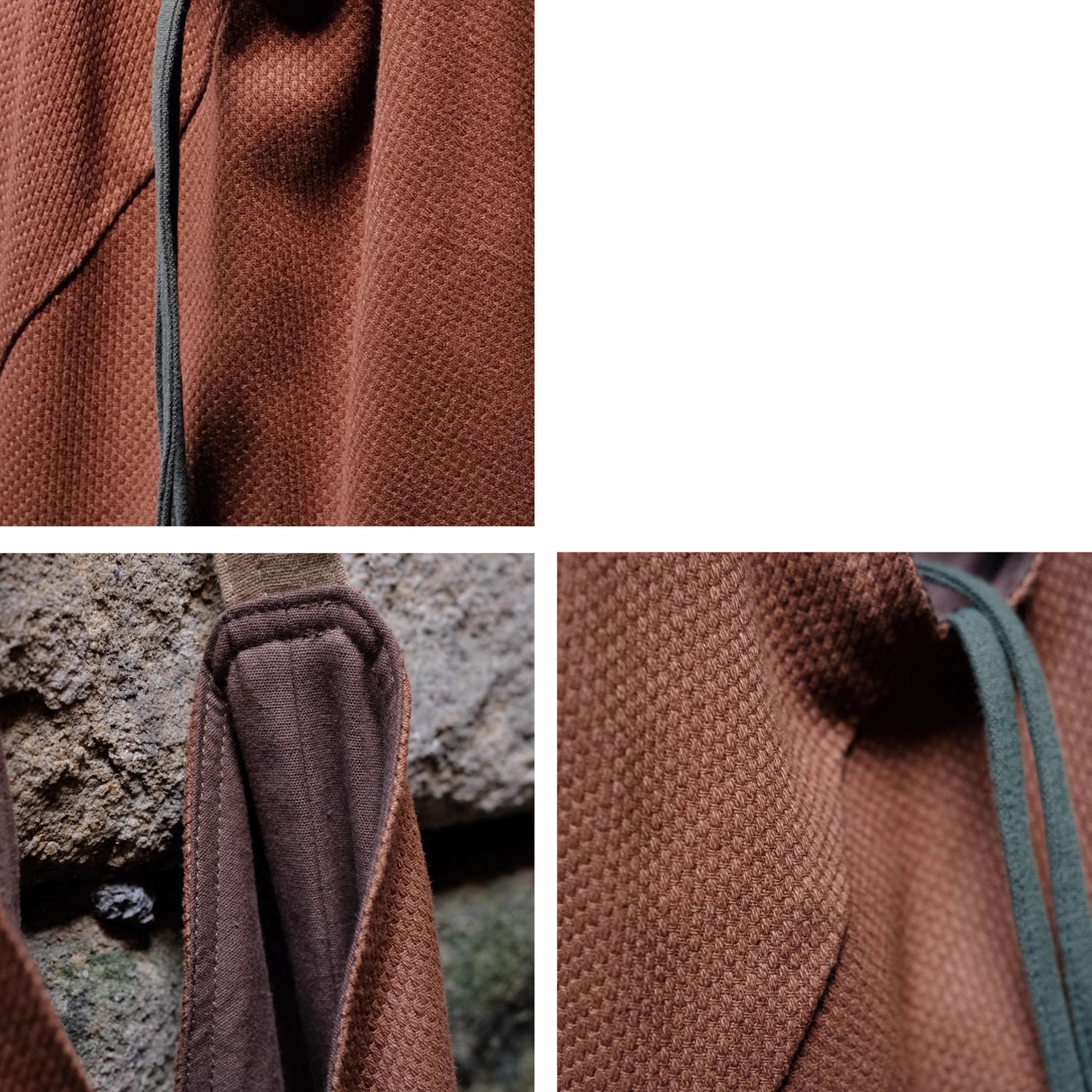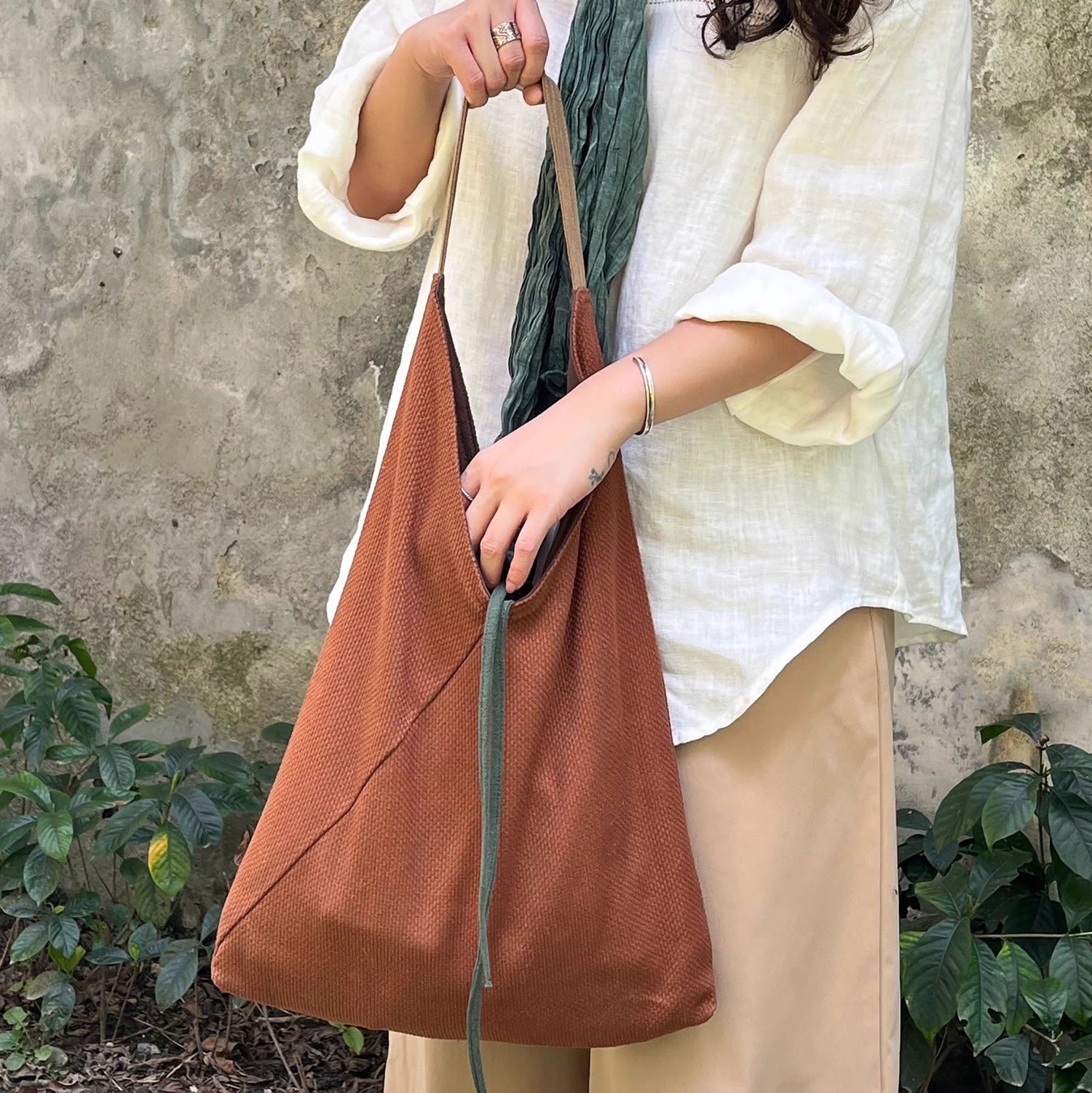 Ce sac en toile triangulaire de couleur terre, cousu main, s’inspire du style rétro et artistique des vêtements de kendo, reflétant l’attention aux détails du créateur à chaque couture. Le sac est doté d’un système de fermeture par lien et d’une doublure marron foncé, qui, une fois retournée, permet de transformer le sac pour un tout nouveau look. À l'intérieur, quatre petites poches ouvertes offrent un espace pratique pour ranger vos objets essentiels. Ce sac polyvalent est idéal pour vos sorties quotidiennes, alliant utilité et charme vintage.