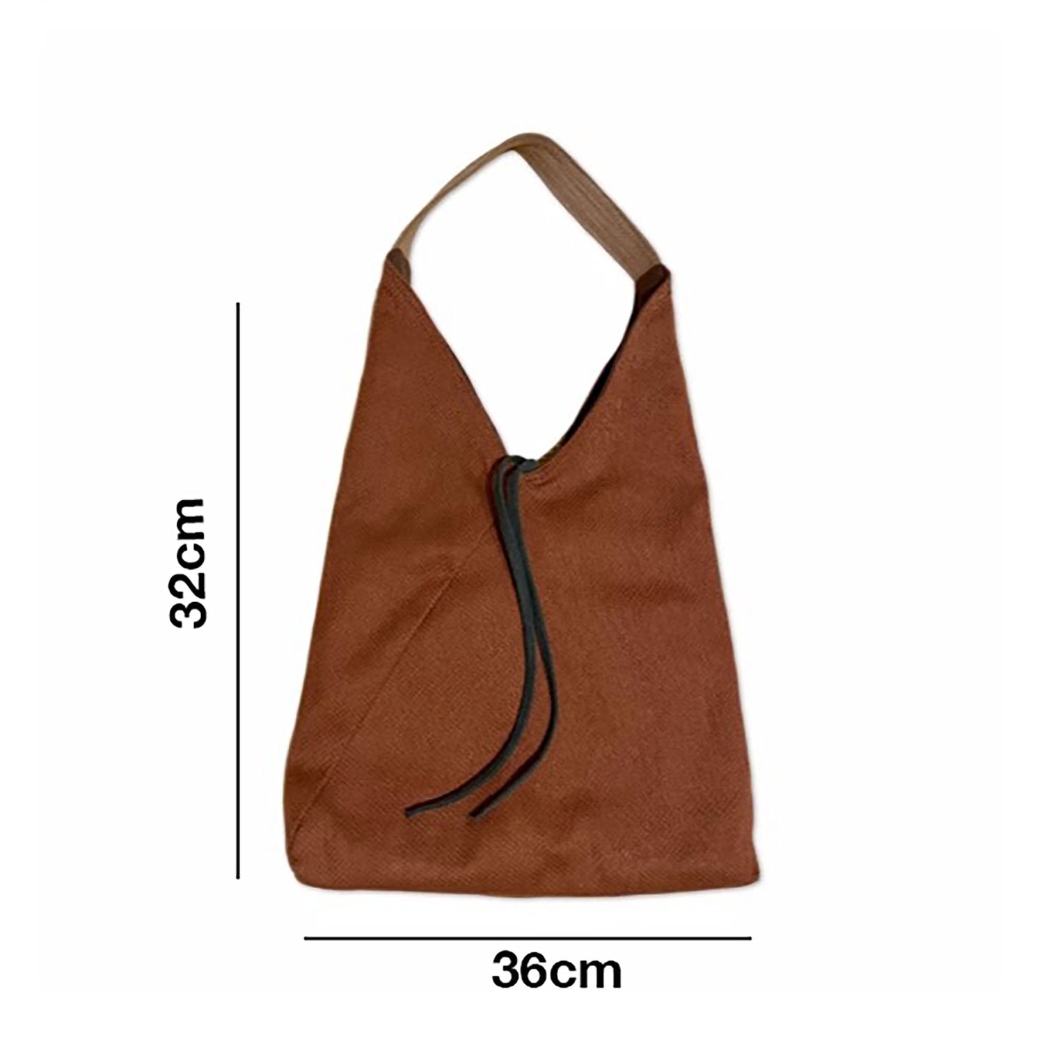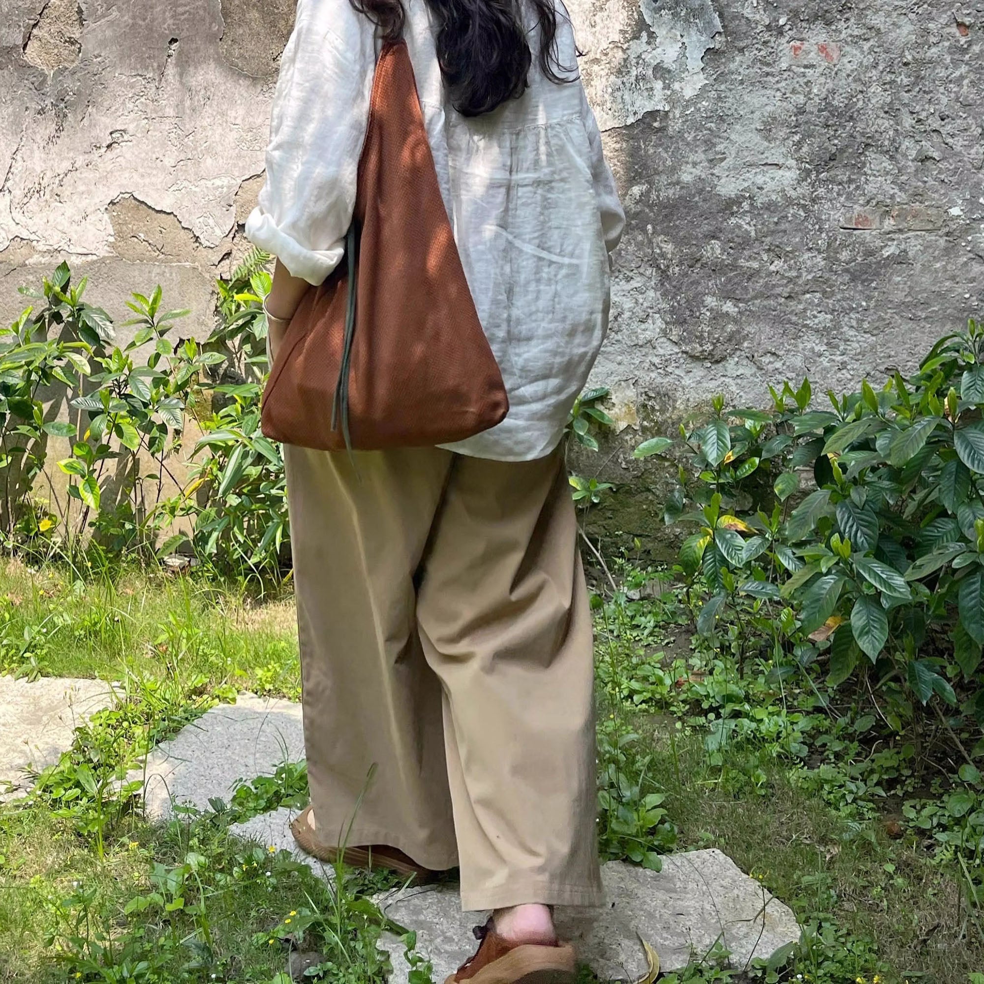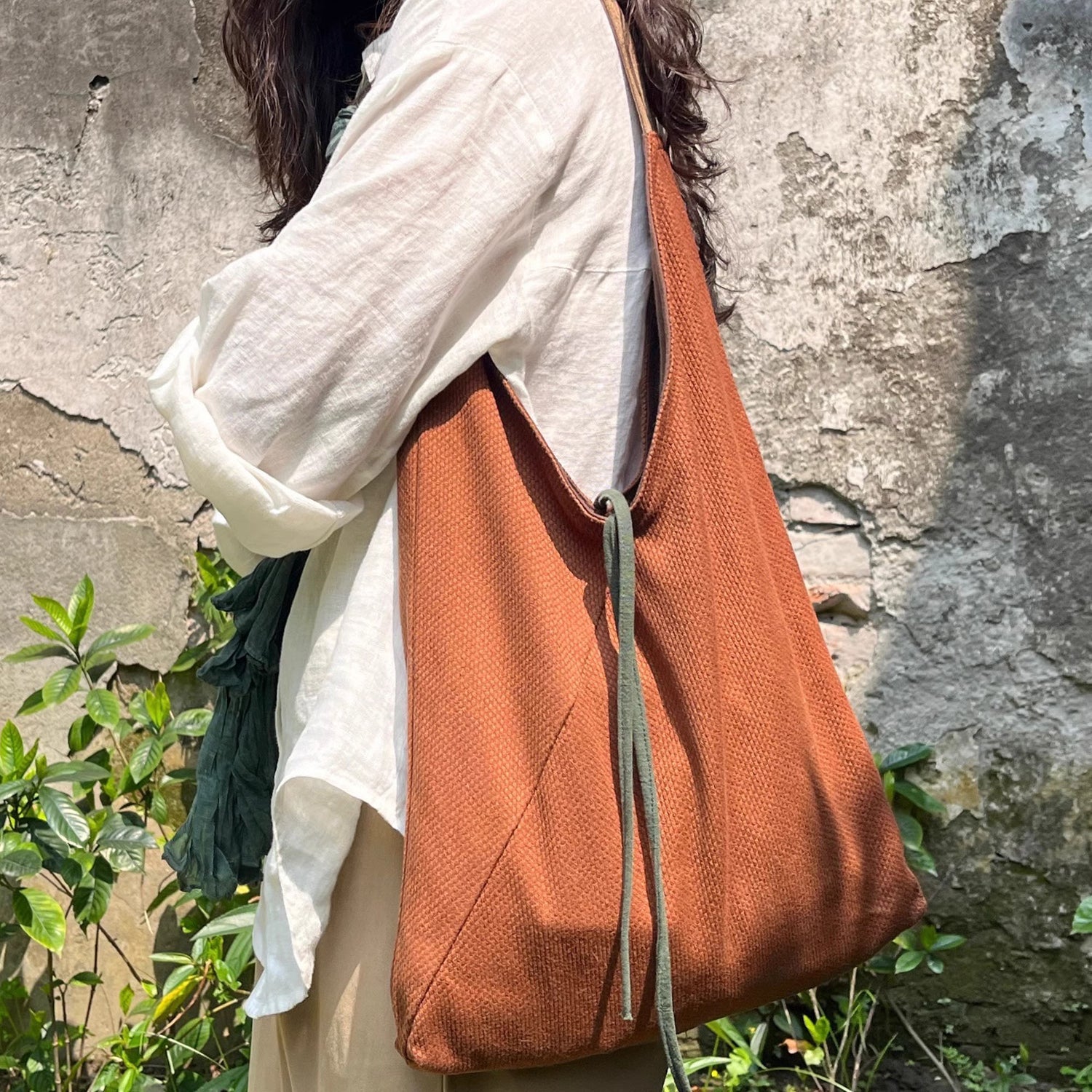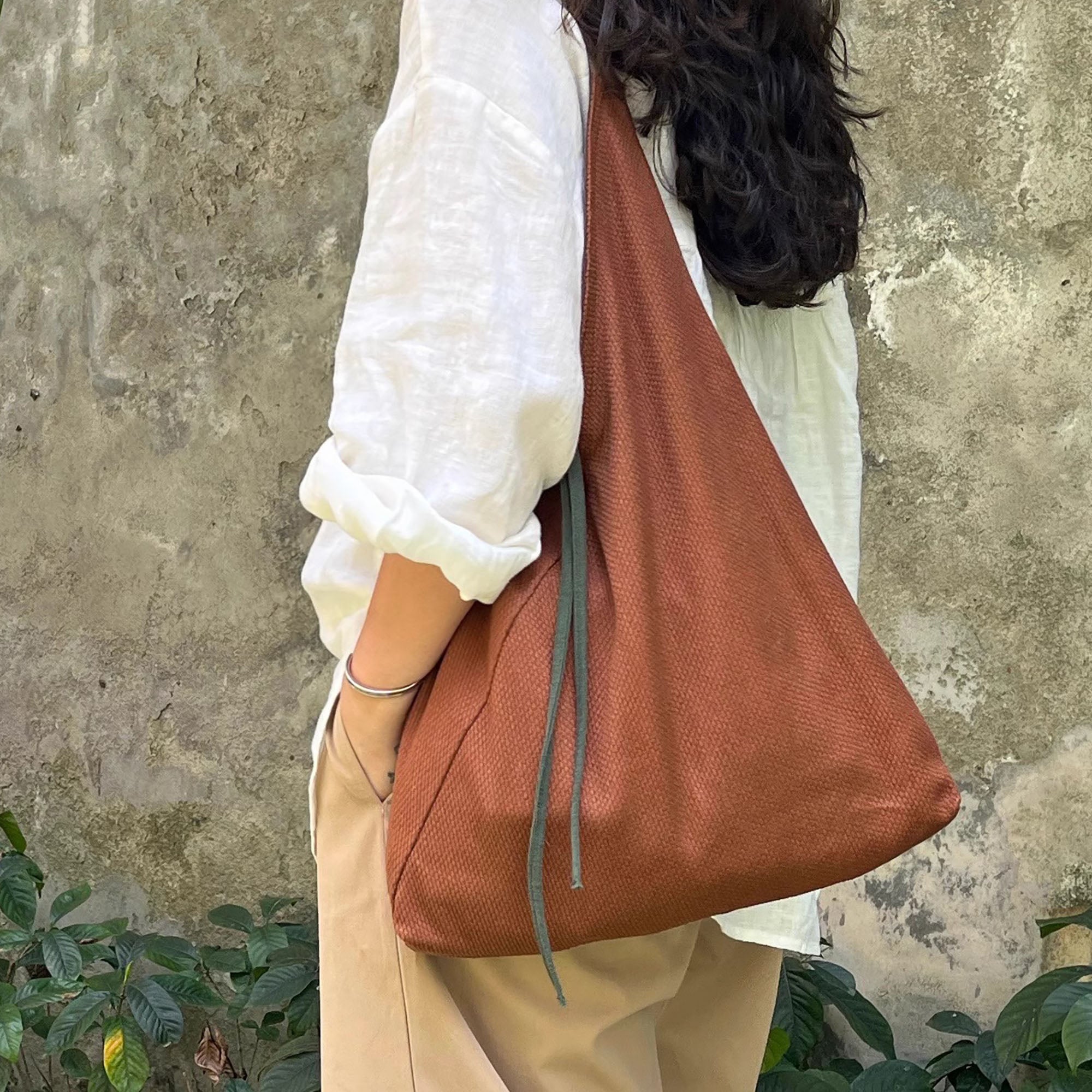 Ce sac en toile triangulaire de couleur terre, cousu main, s’inspire du style rétro et artistique des vêtements de kendo, reflétant l’attention aux détails du créateur à chaque couture. Le sac est doté d’un système de fermeture par lien et d’une doublure marron foncé, qui, une fois retournée, permet de transformer le sac pour un tout nouveau look. À l'intérieur, quatre petites poches ouvertes offrent un espace pratique pour ranger vos objets essentiels. Ce sac polyvalent est idéal pour vos sorties quotidiennes, alliant utilité et charme vintage.