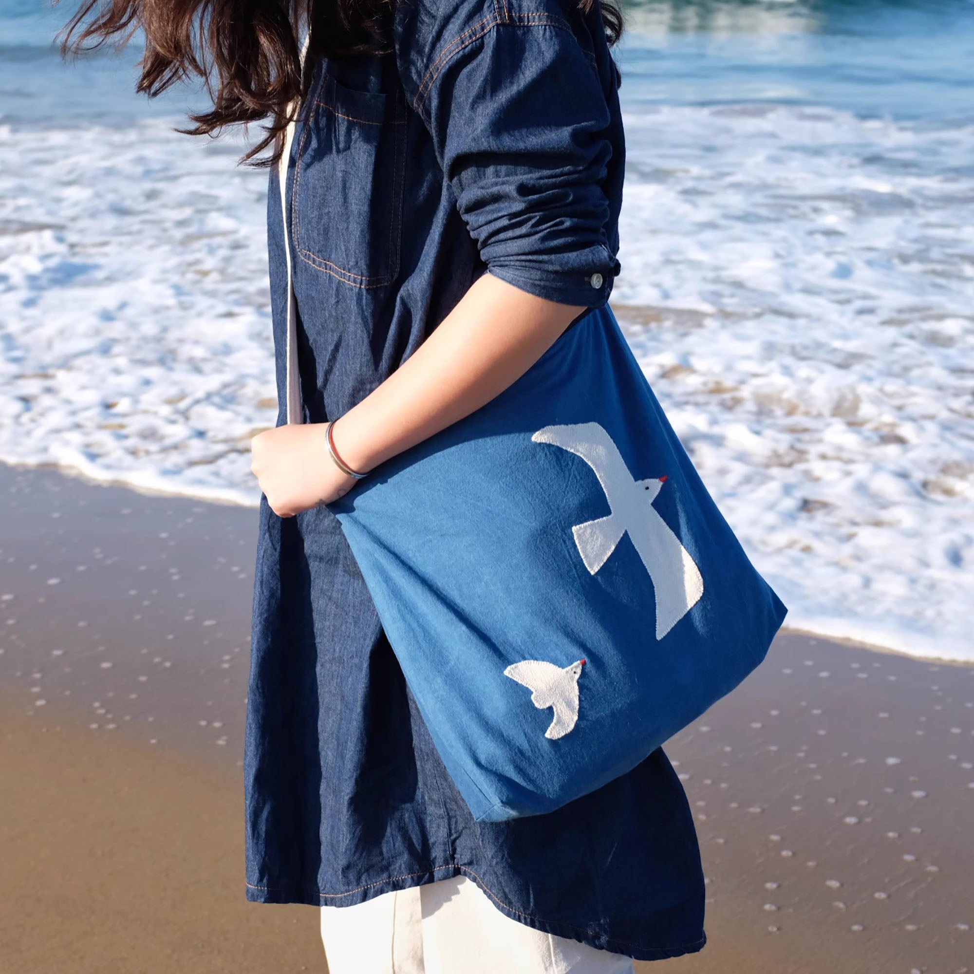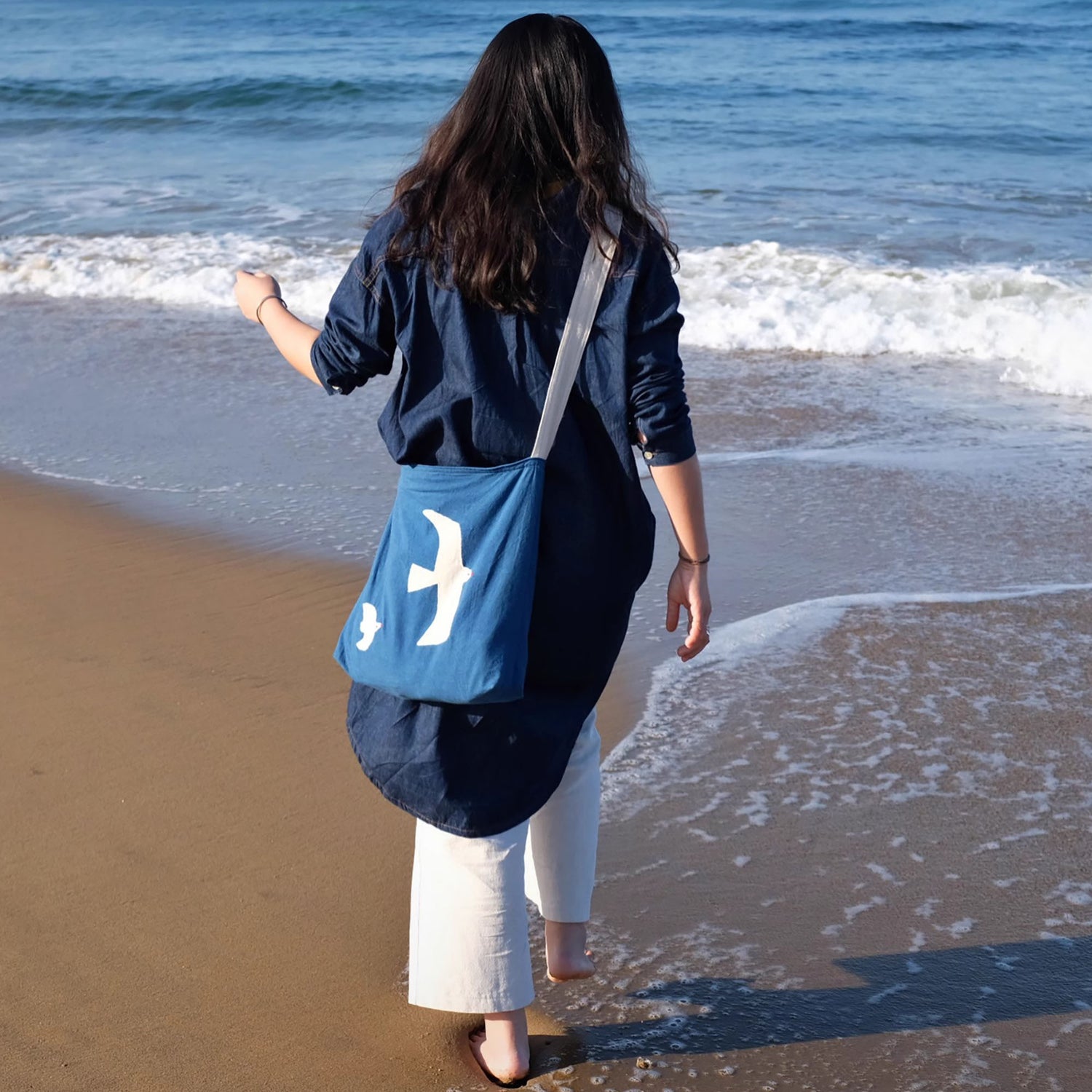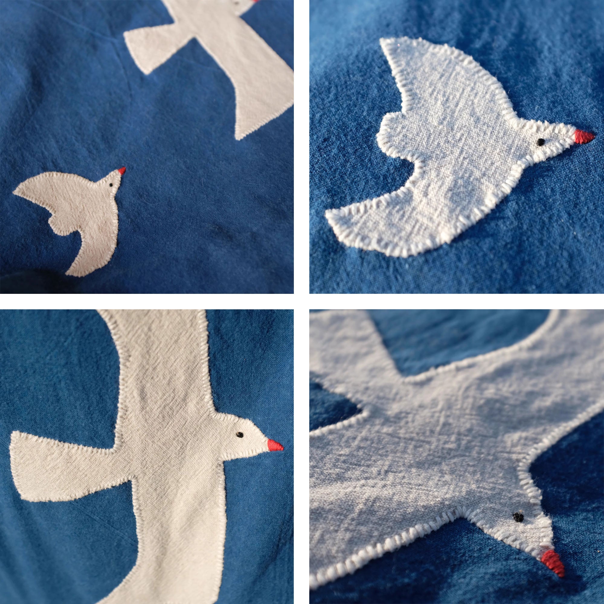 Ce sac épaule en lin et coton cousu main, agrémenté d’un patchwork teinté à l’indigo et d'une broderie délicate représentant des mouettes, exprime l’amour du créateur pour la nature et la vie paisible. La fermeture à glissière en métal YKK garantit une robustesse durable, tandis que la doublure en toile de coton bleu marine ajoute une touche de douceur. Avec une poche intérieure ouverte, ce sac est parfait pour ranger vos petits objets du quotidien. Idéal pour les sorties quotidiennes, il allie fonctionnalité et élégance artisanale.