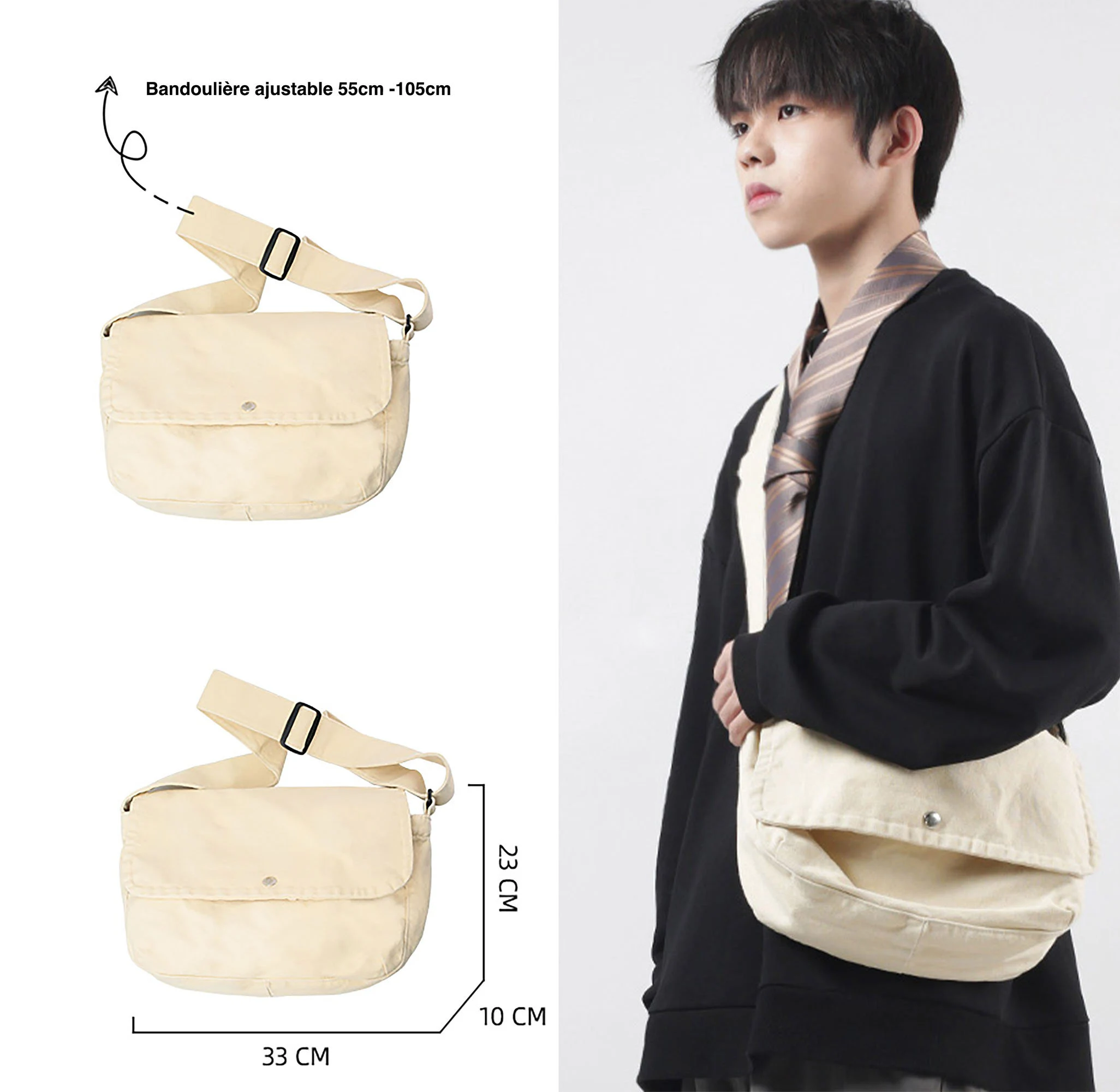 Ce sac messager à bandoulière pour homme de style vintage japonais est fabriqué en toile épaisse de haute densité et 100% coton, à la fois durable et élégant. Son design offre un espace de rangement spacieux, idéal pour les sorties quotidiennes. La bandoulière réglable assure un confort optimal en toutes circonstances. Que ce soit pour le travail, les courses ou les loisirs, ce sac messager est votre compagnon idéal.