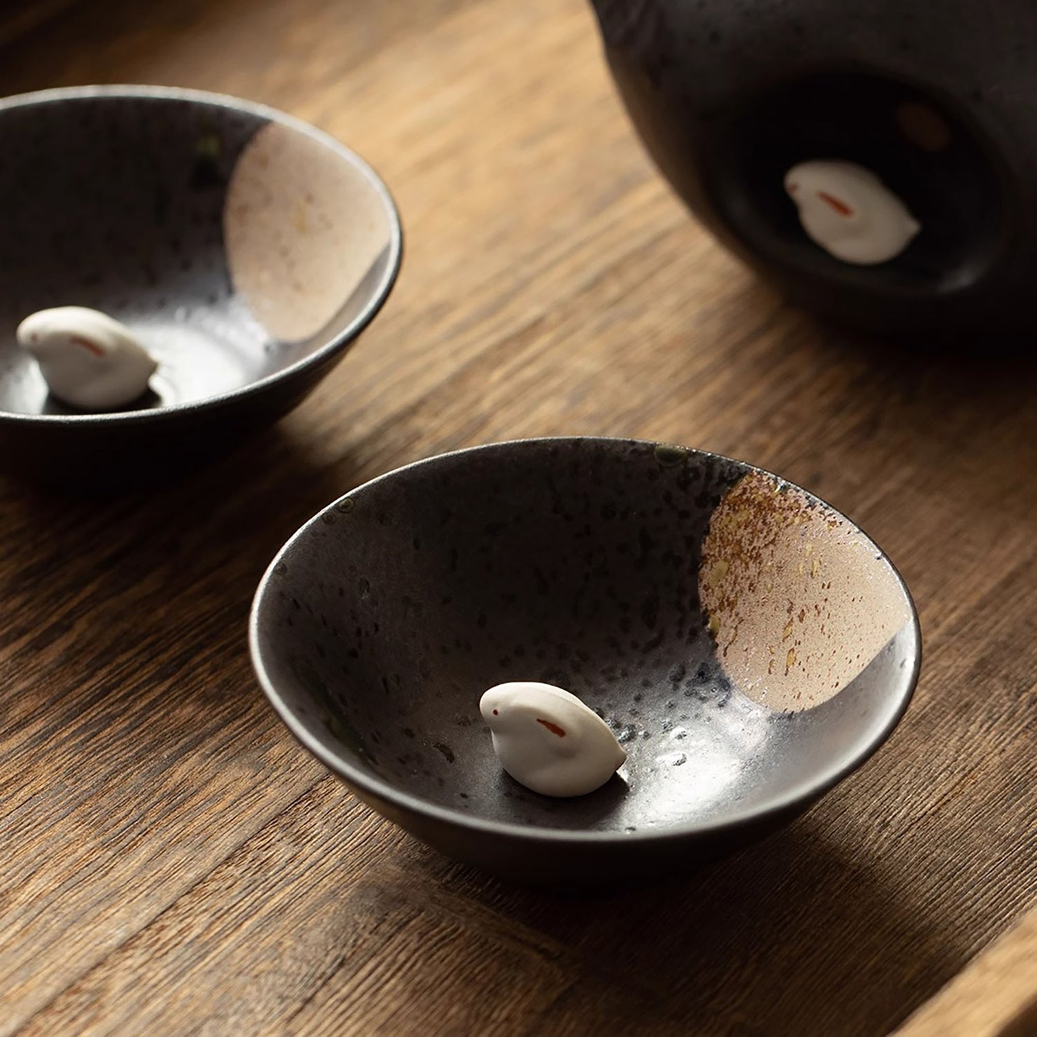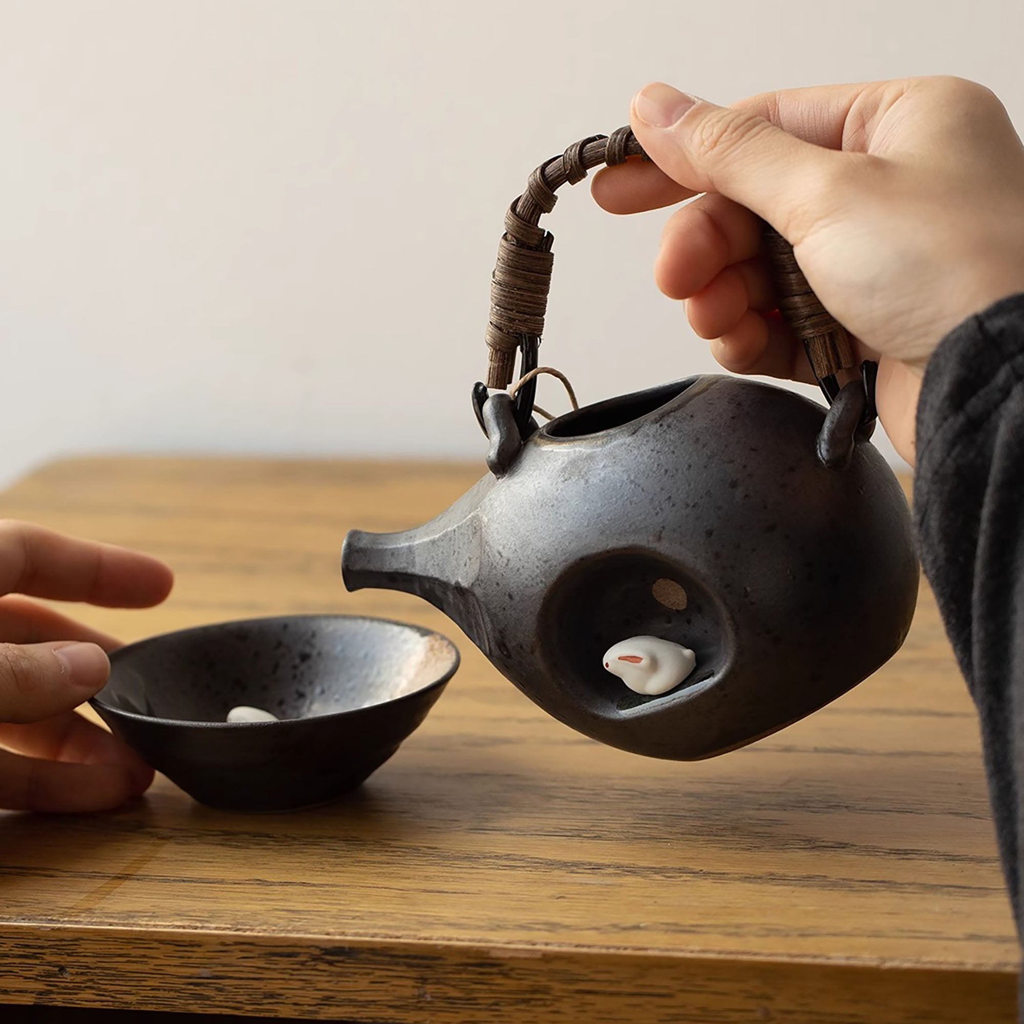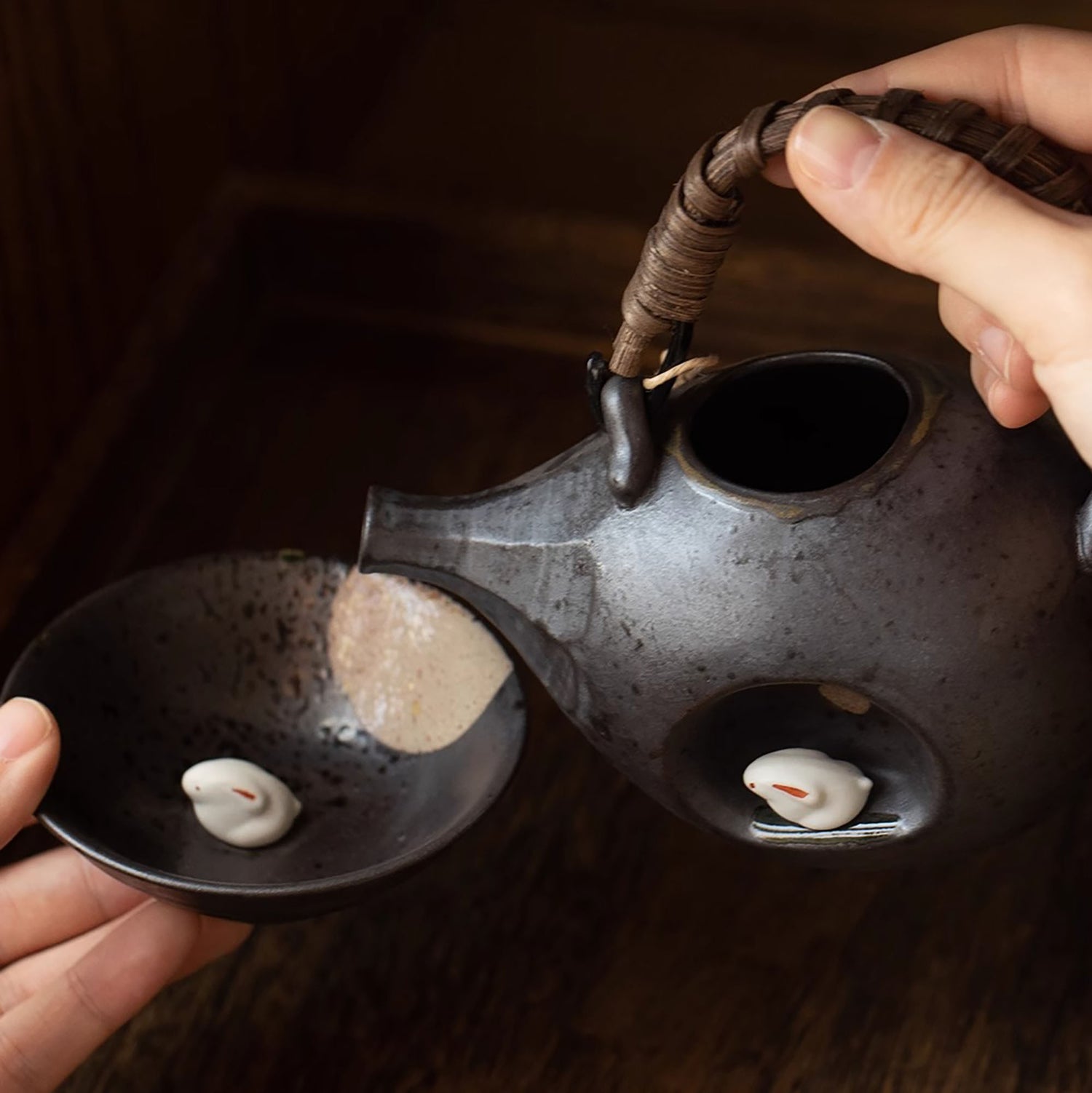 Ce service à saké artisanal inclut une carafe et deux tasses, fabriqué à la main par des artisans. Orné de charmants lapins contemplant la lune, contrastant harmonieusement avec la base en céramique noire, il allie sobriété et vivacité. Les textures naturelles et le design épuré évoquent une chaleur empreinte de zen. Idéal pour partager un moment convivial en famille ou entre amis. Cuit à haute température avec une technique sous glaçure, il reflète l'artisanat authentique. Parfait pour un usage personnel ou comme cadeau raffiné.