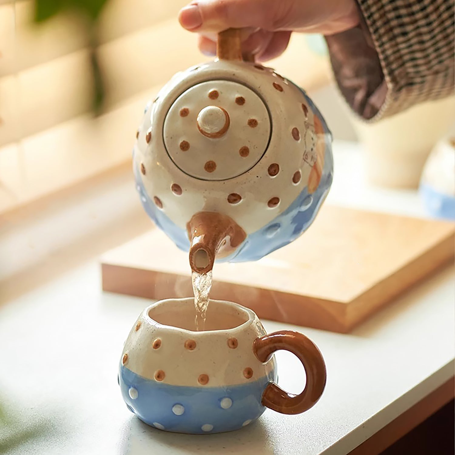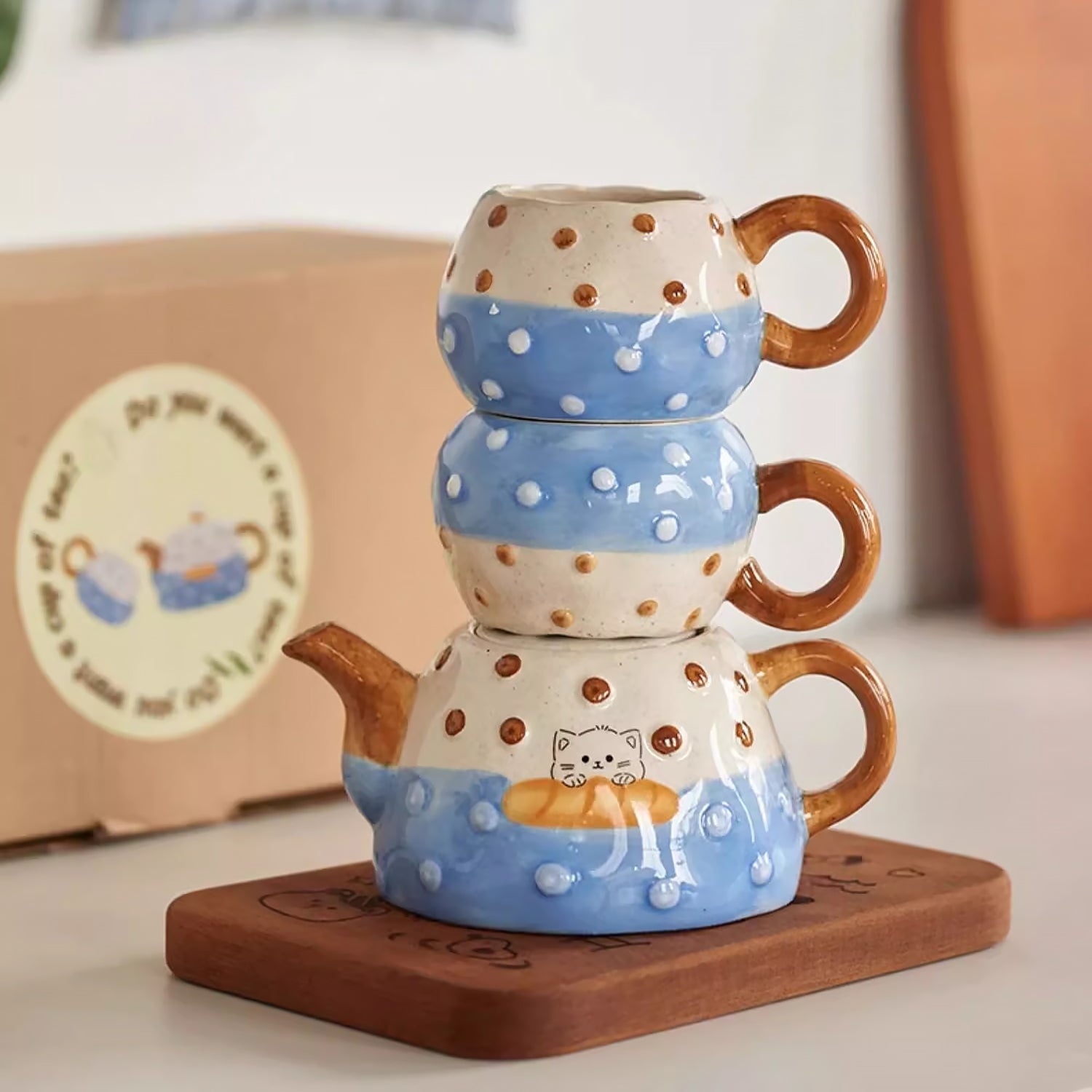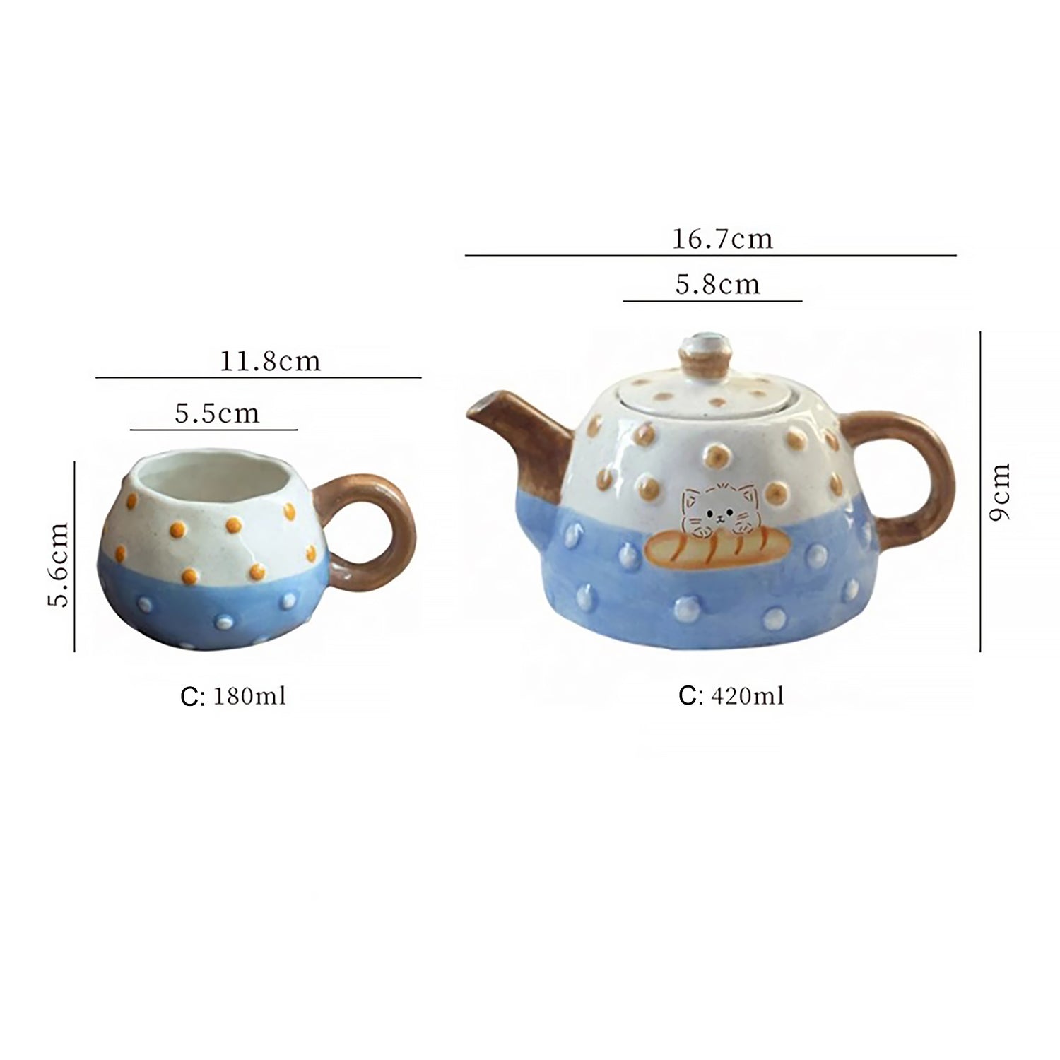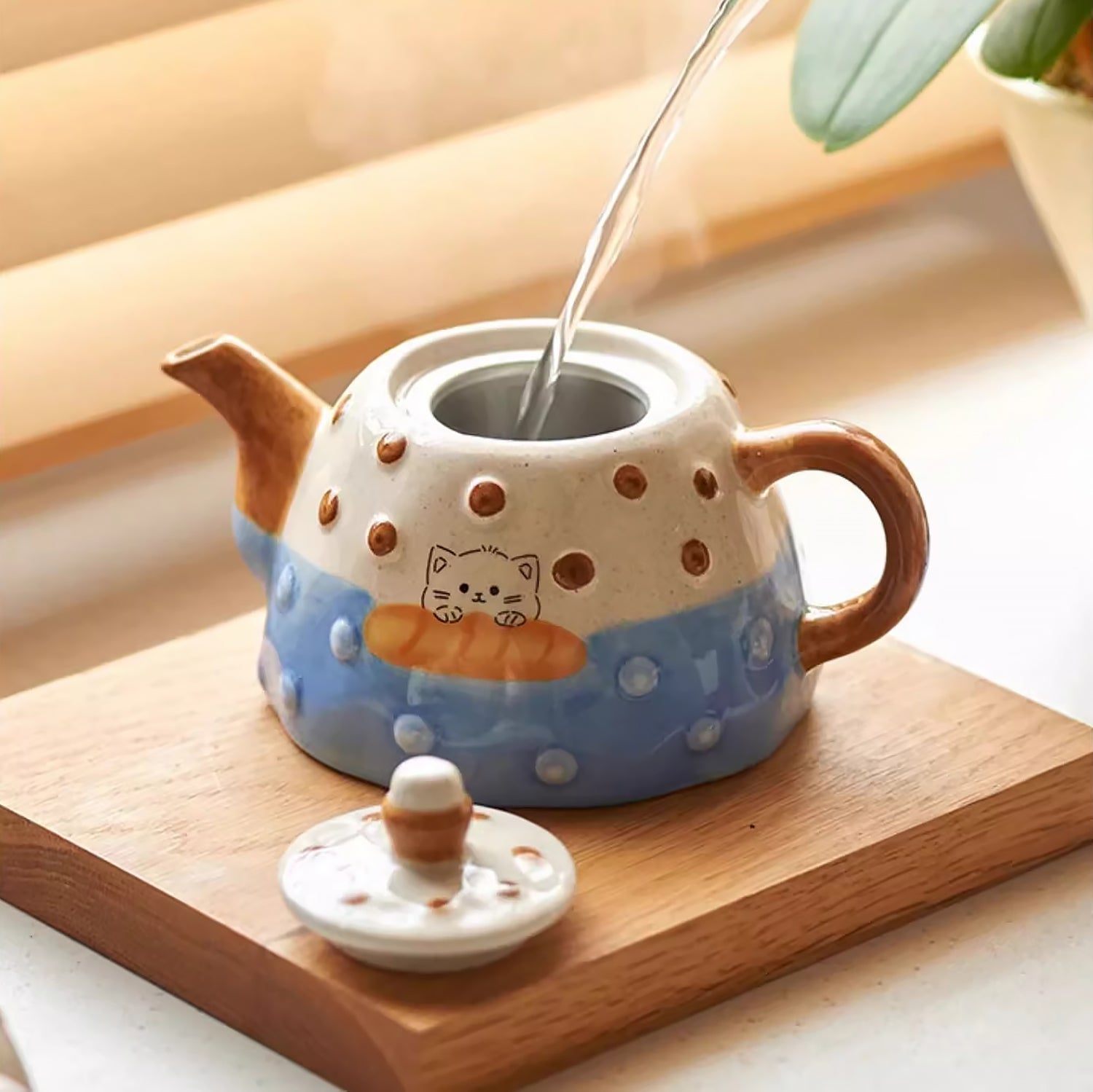 Apportez une touche de douceur à votre pause thé avec cet ensemble en céramique fait main, composé d’une théière et de deux tasses. Son design unique, illustré d’un chat gourmand de pain, ajoute une note ludique et chaleureuse. Équipé d’un filtre en acier inoxydable pour une infusion parfaite. Parfait pour une utilisation quotidienne ou comme cadeau original.