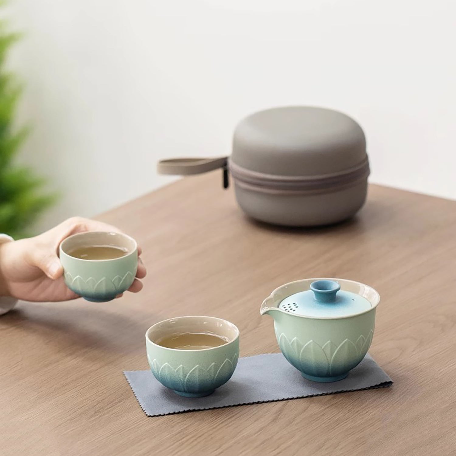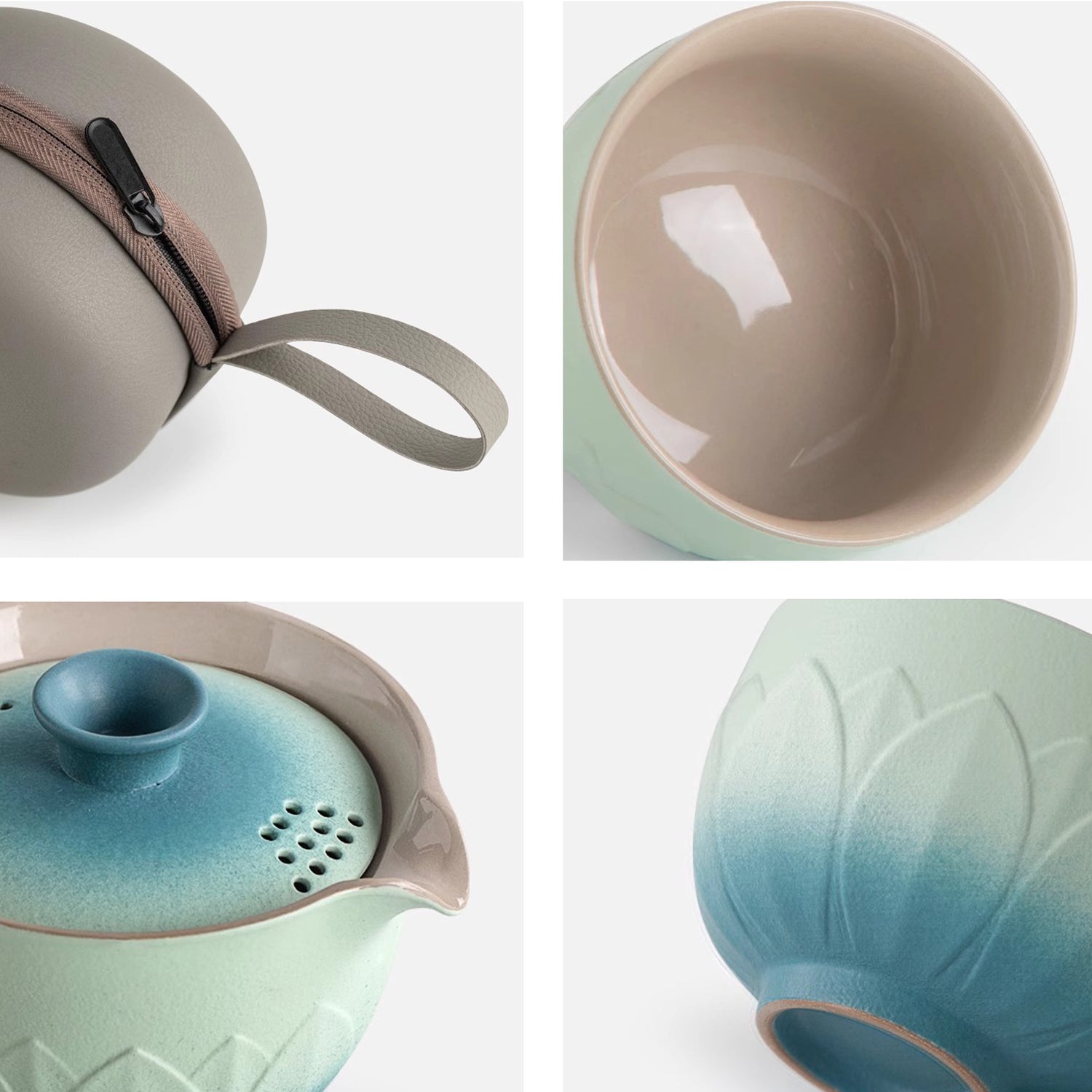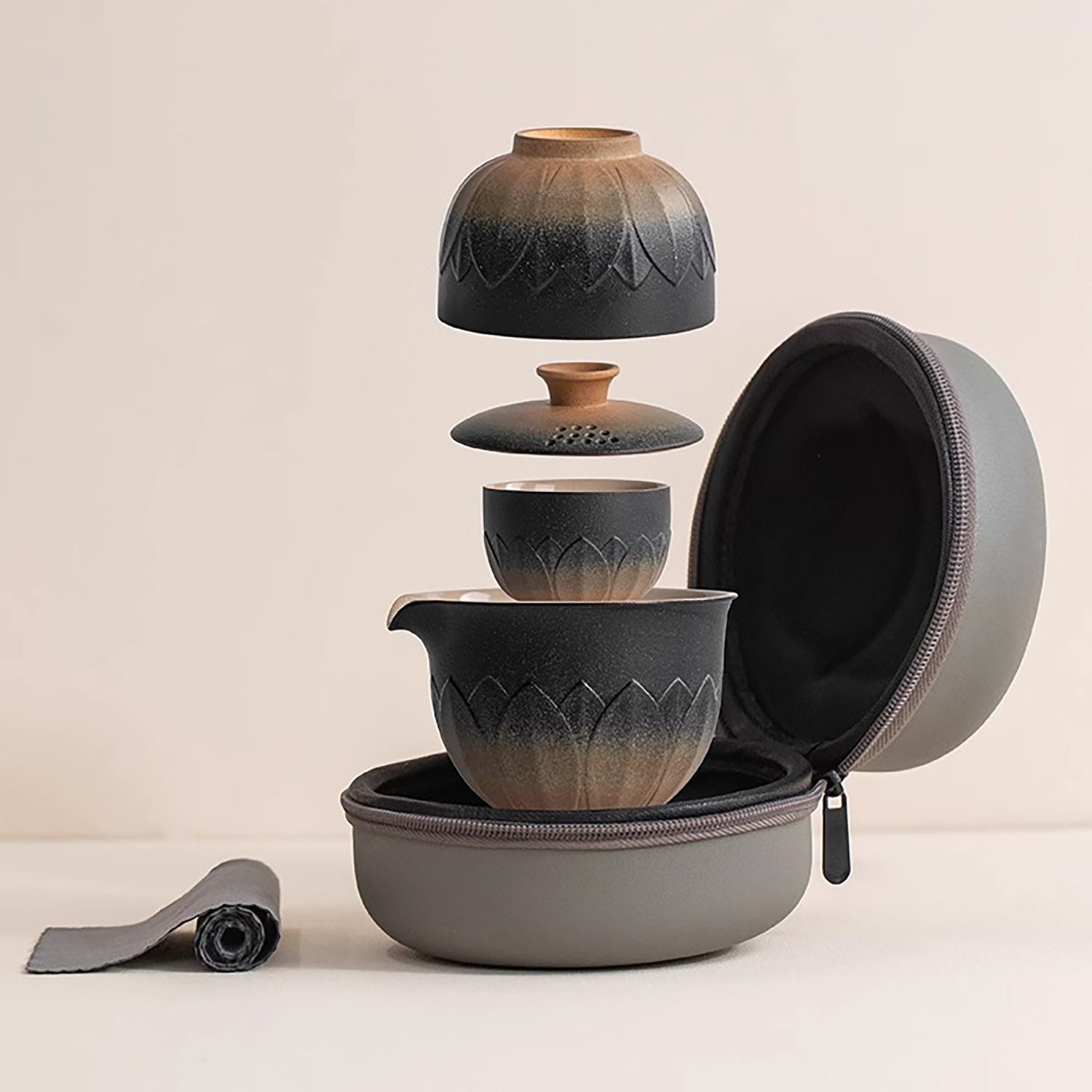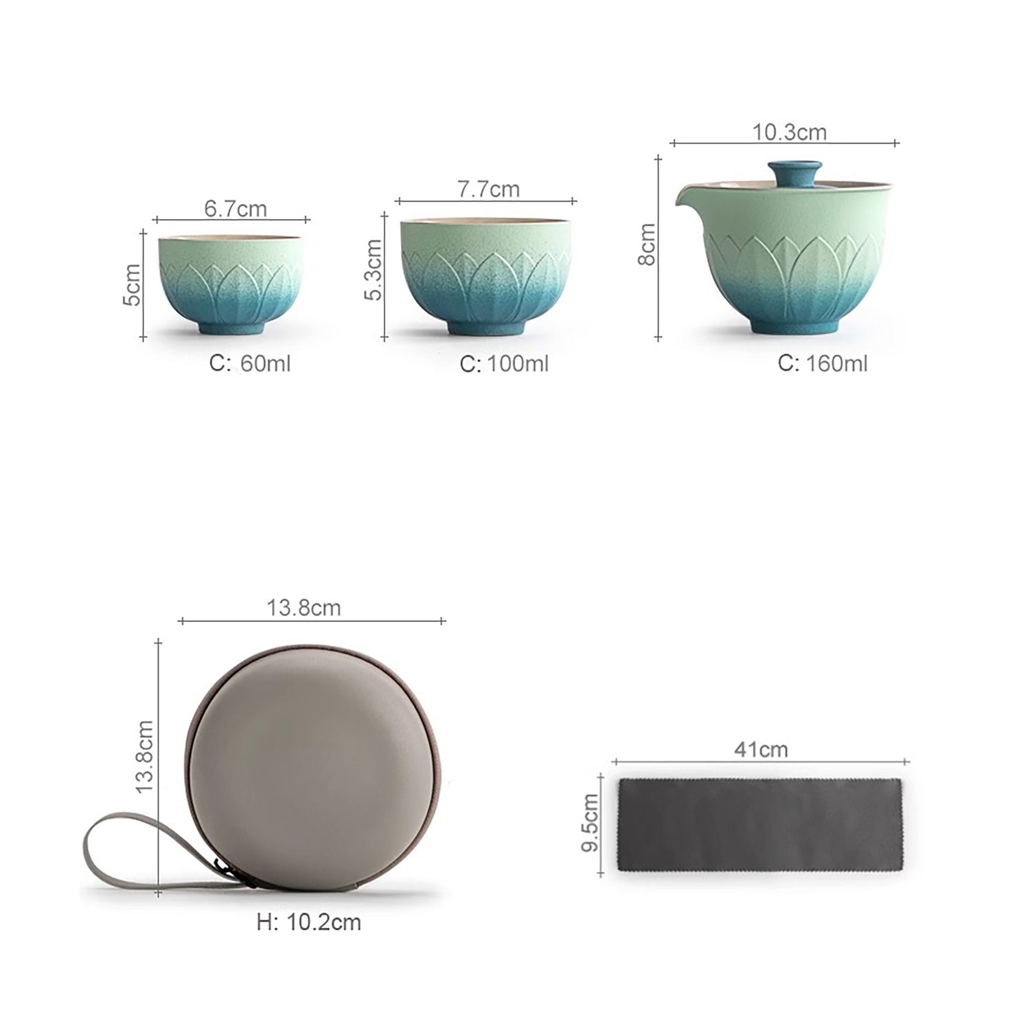 Ce service à thé de voyage, également appelé "Fleur de Lotus", comprend une théière, deux tasses et un pichet. Fabriqué en porcelaine de haute qualité, ce set présente un émaillage aux nuances naturelles et une forme inspirée de la fleur de lotus, agréable à tenir en main. Son design raffiné rehausse l'expérience de la dégustation du thé et invite à un retour à la simplicité. Le set est livré avec une serviette à thé et sa conception portable vous permet d'apprécier l’art du thé où que vous soyez, en toute sérénité.