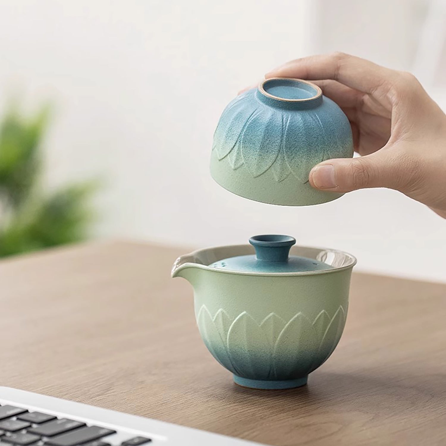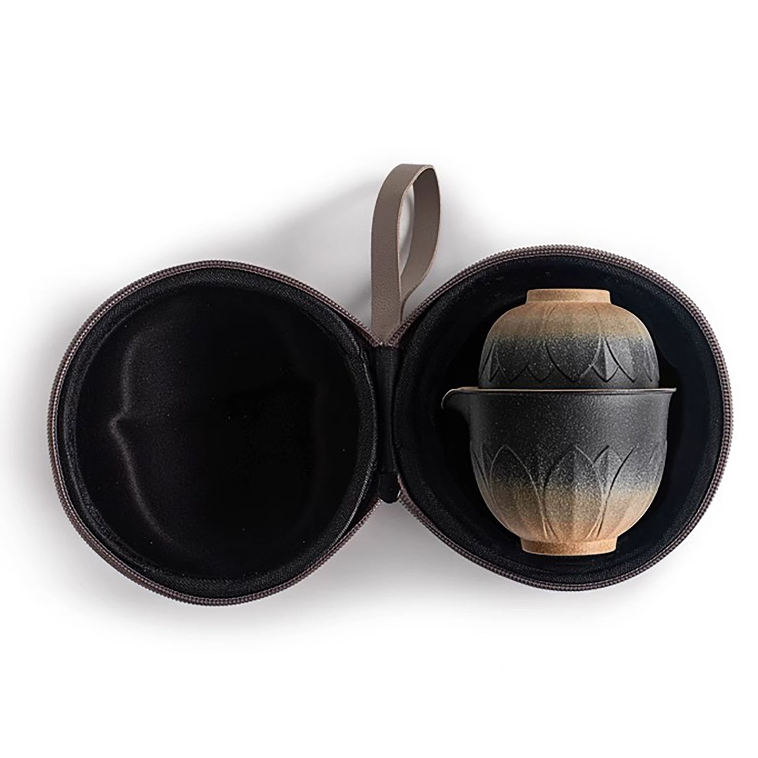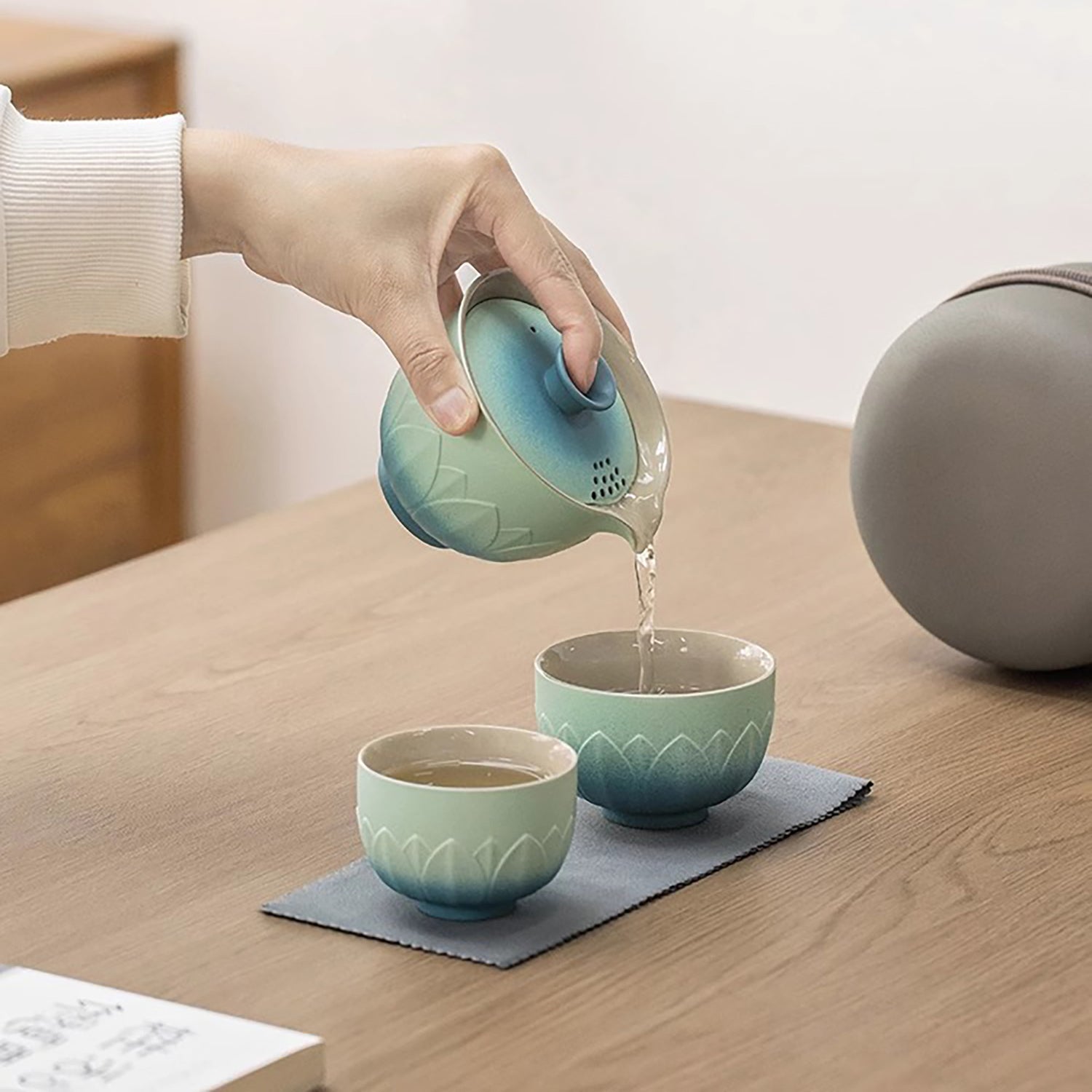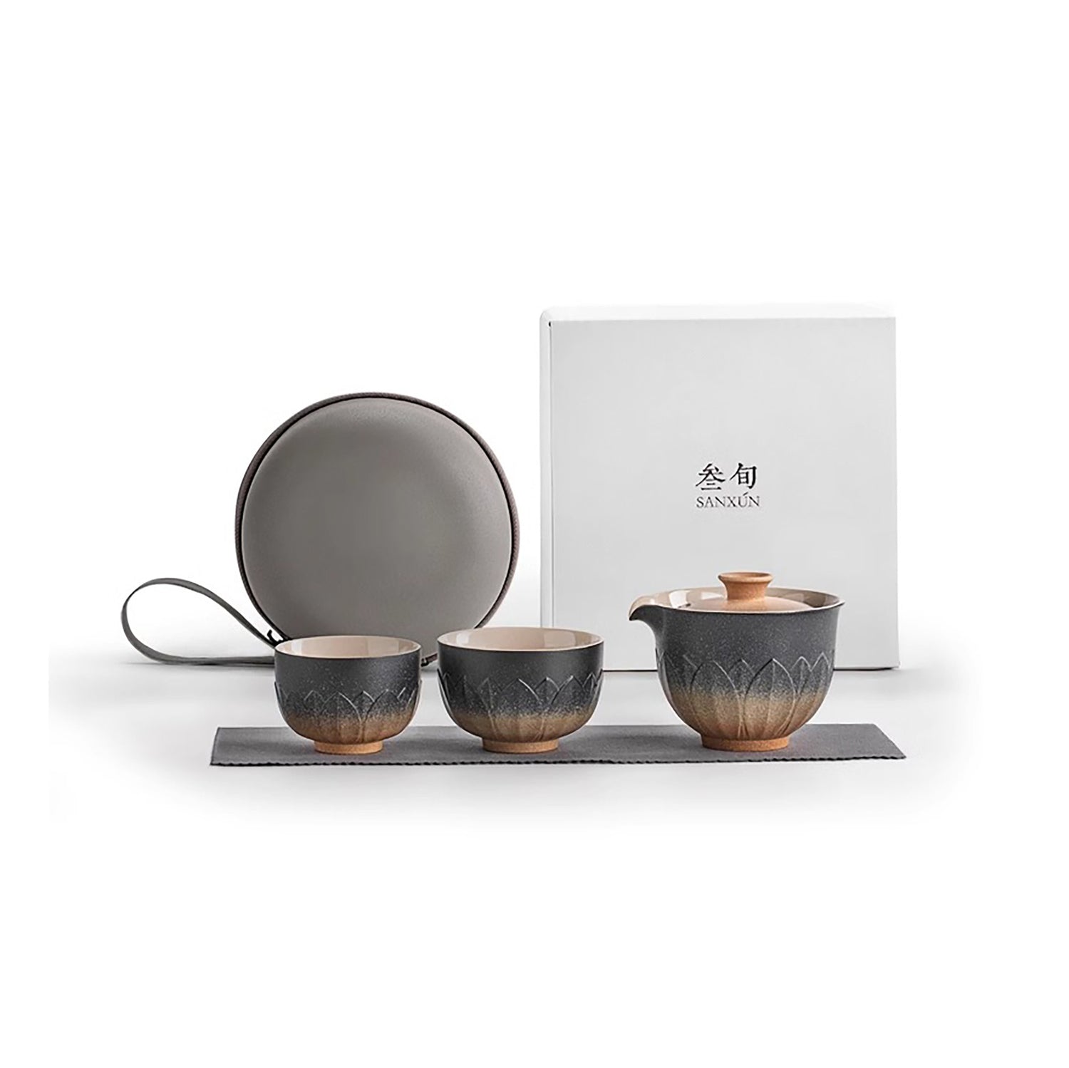 Ce service à thé de voyage, également appelé "Fleur de Lotus", comprend une théière, deux tasses et un pichet. Fabriqué en porcelaine de haute qualité, ce set présente un émaillage aux nuances naturelles et une forme inspirée de la fleur de lotus, agréable à tenir en main. Son design raffiné rehausse l'expérience de la dégustation du thé et invite à un retour à la simplicité. Le set est livré avec une serviette à thé et sa conception portable vous permet d'apprécier l’art du thé où que vous soyez, en toute sérénité.
