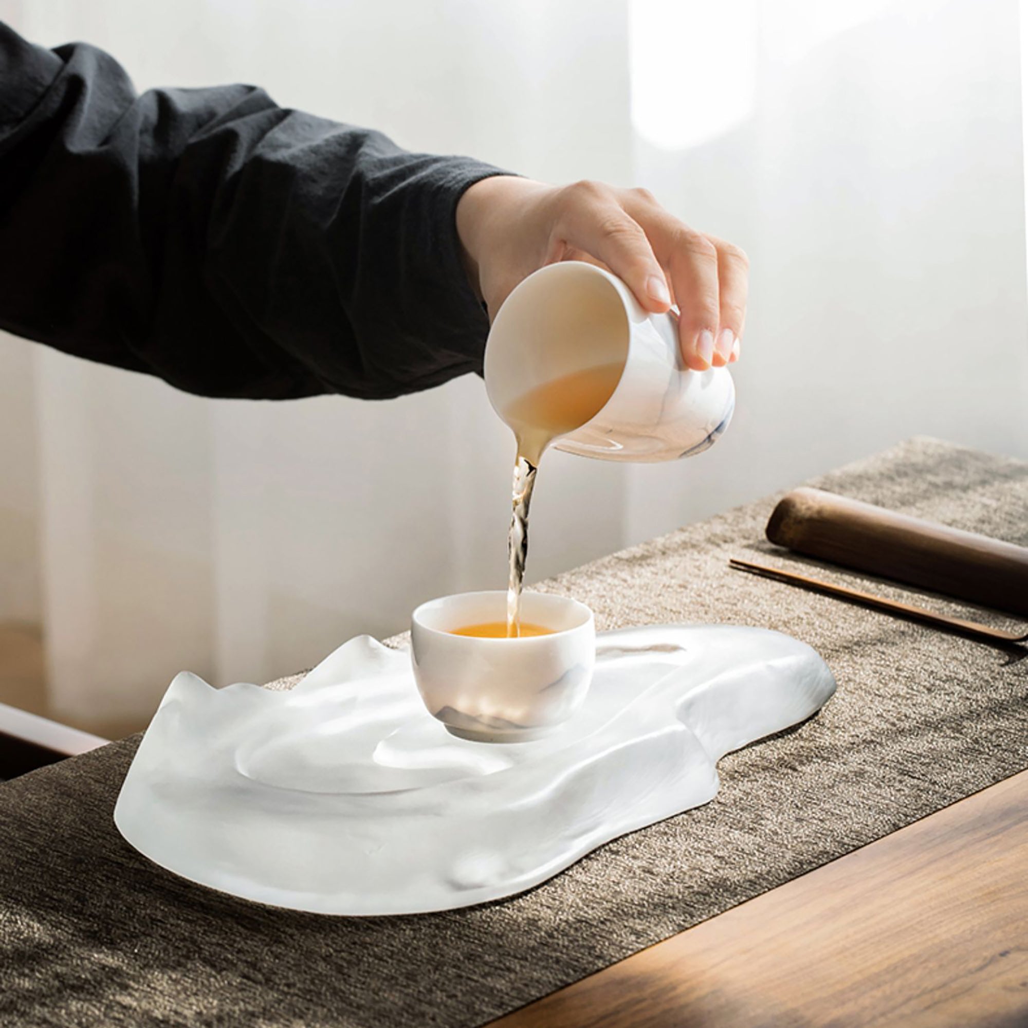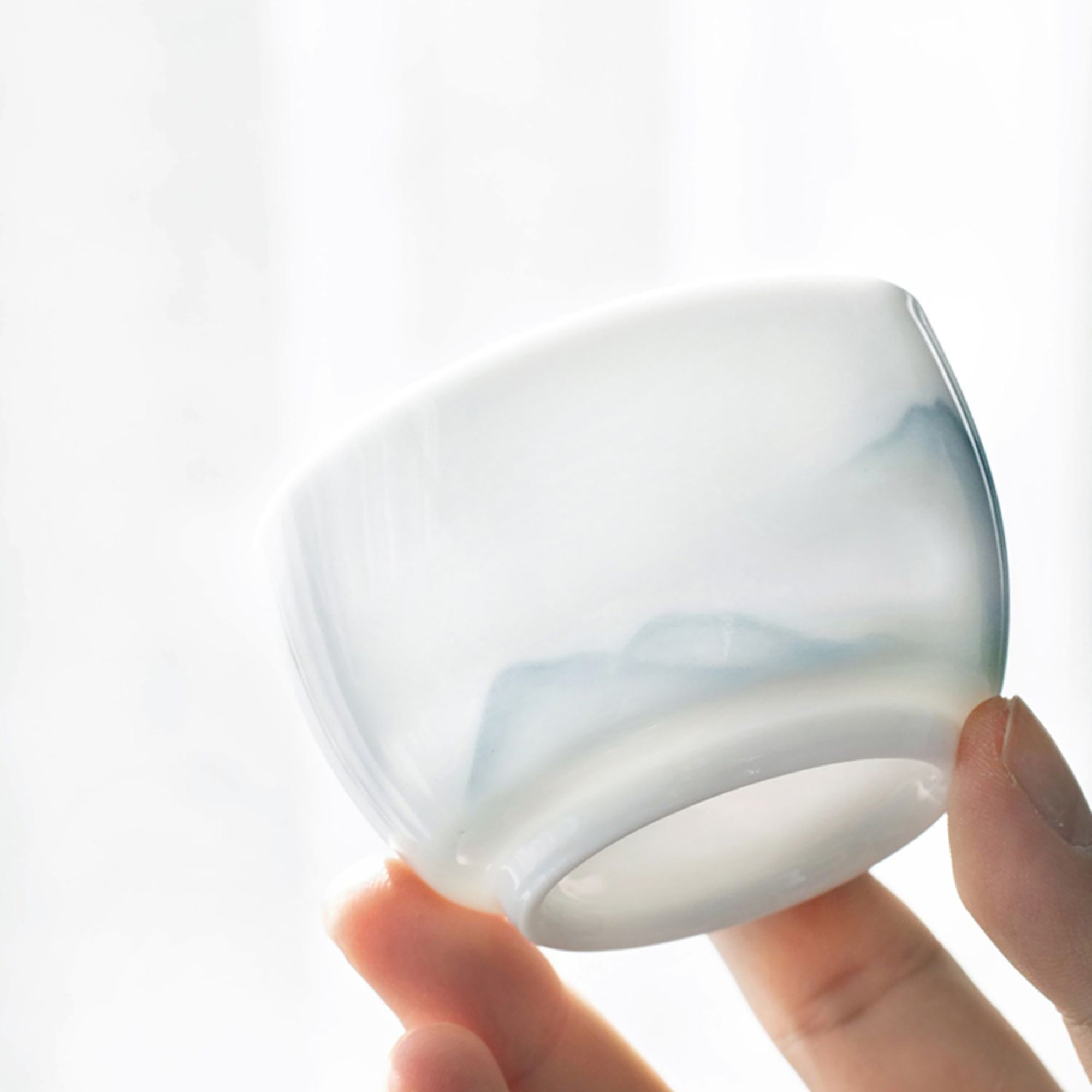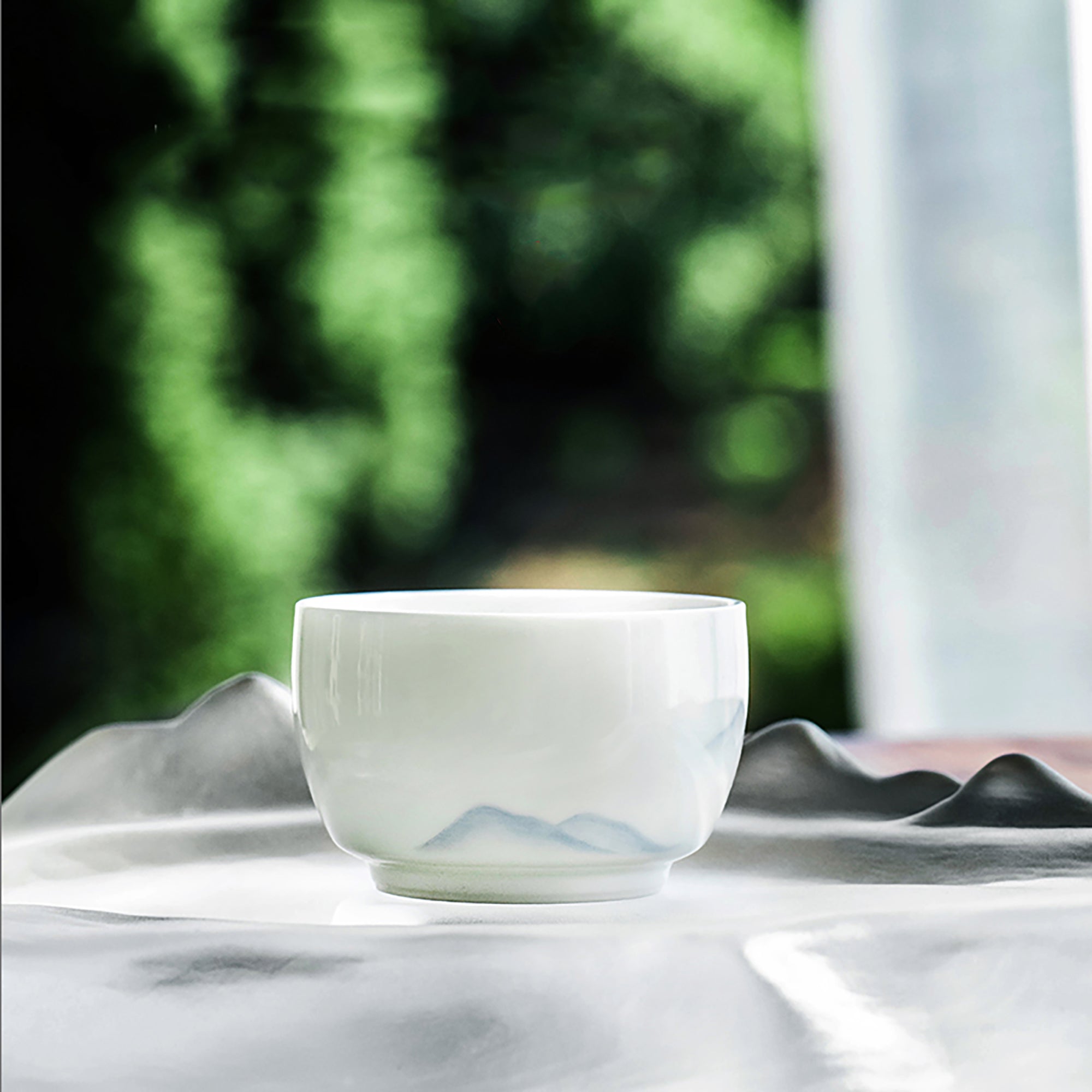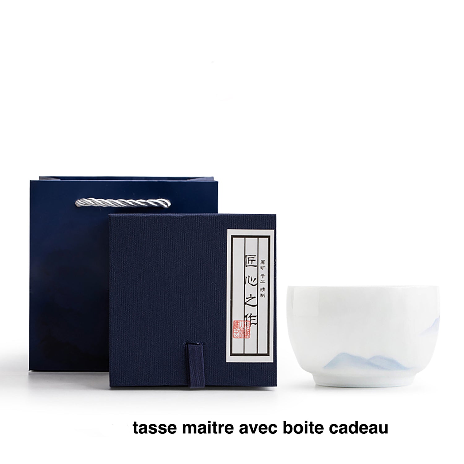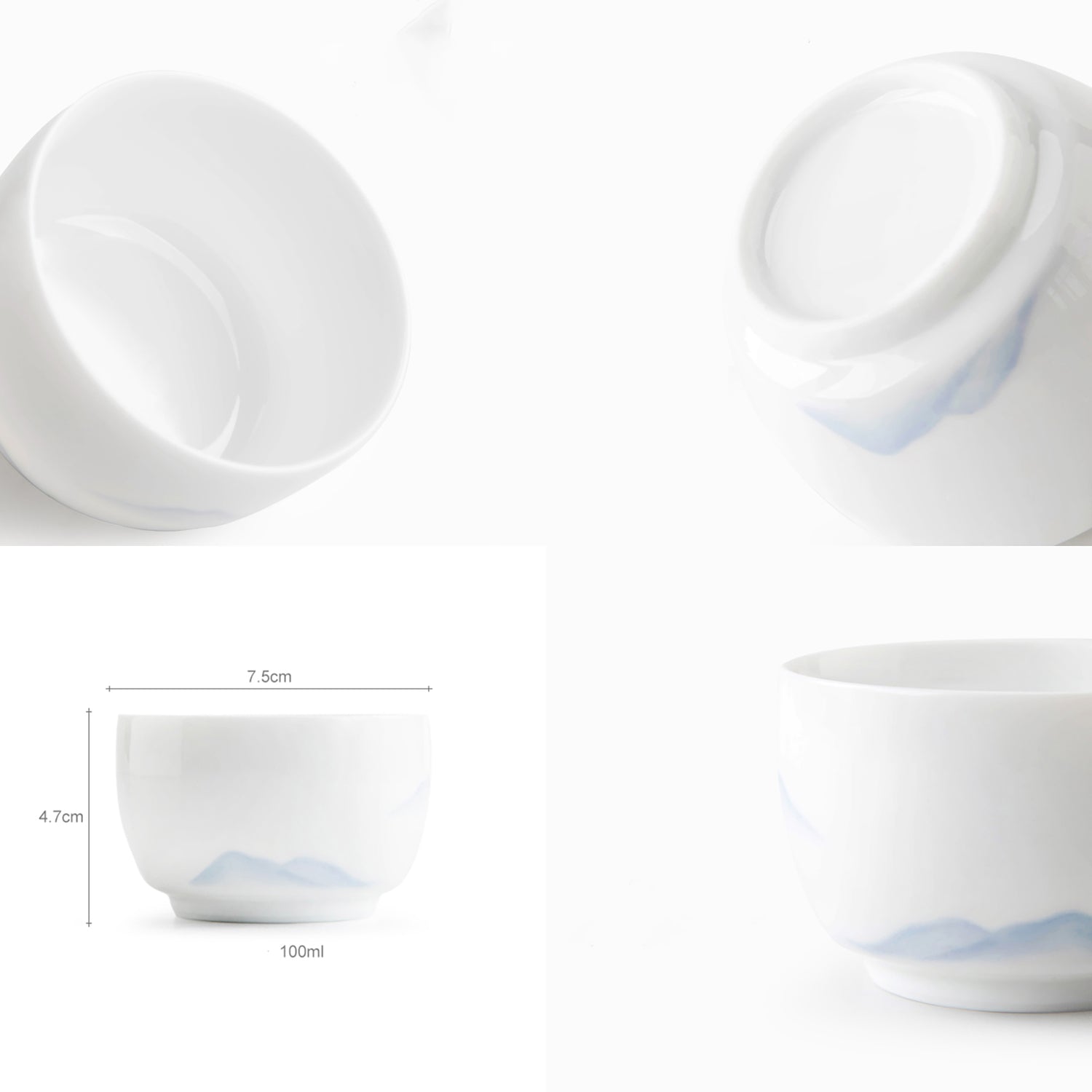 Cette tasse maître en céramique de haute qualité, fabriquée à Jingdezhen, est réalisée en porcelaine blanche fine et délicate, avec une texture douce et translucide. Le design est orné d'un motif peint à la main représentant des montagnes lointaines, aux traits subtils et élégants, offrant une ambiance paisible et poétique.