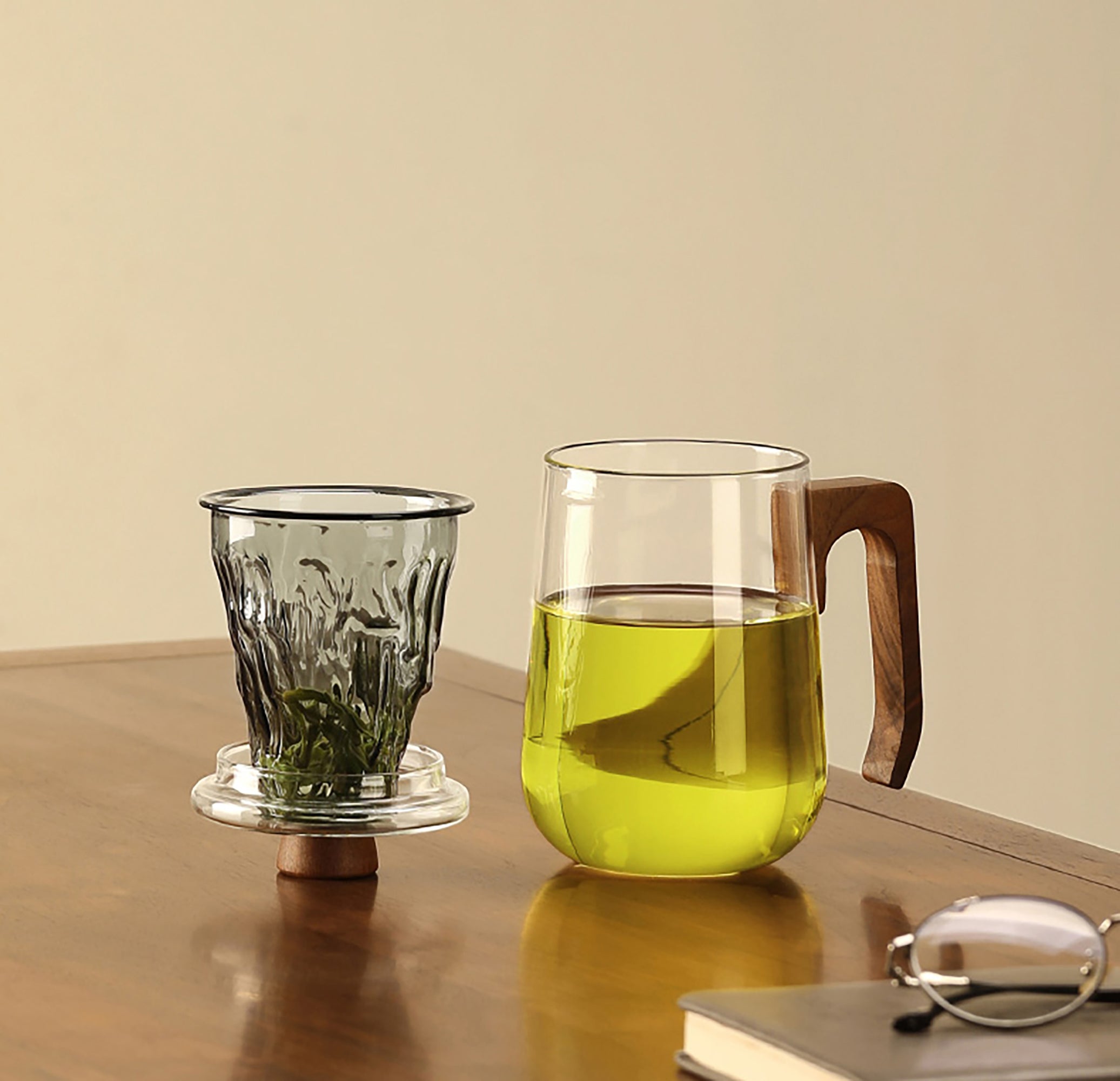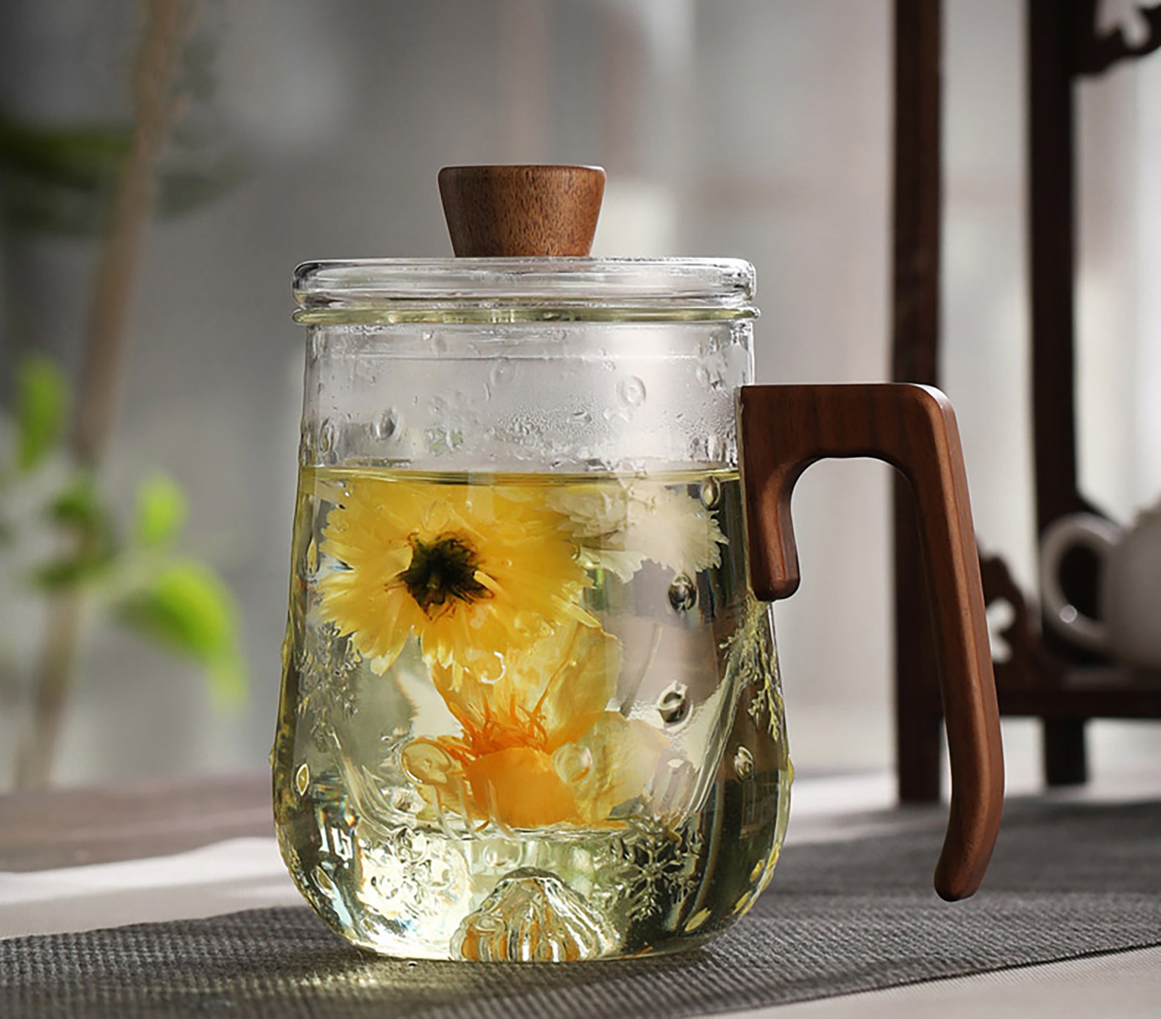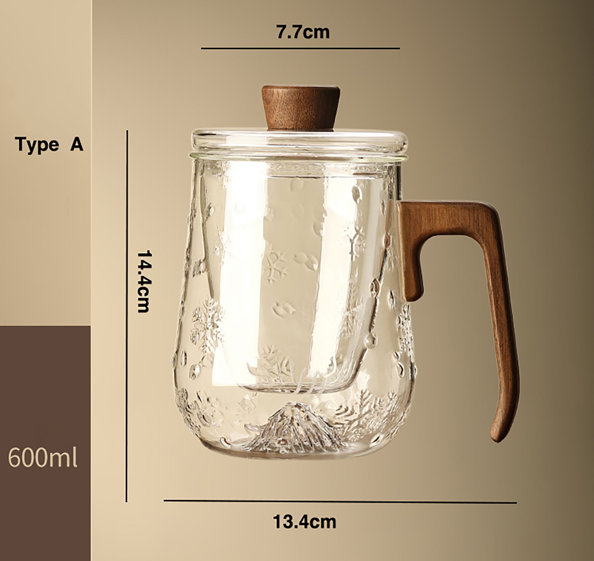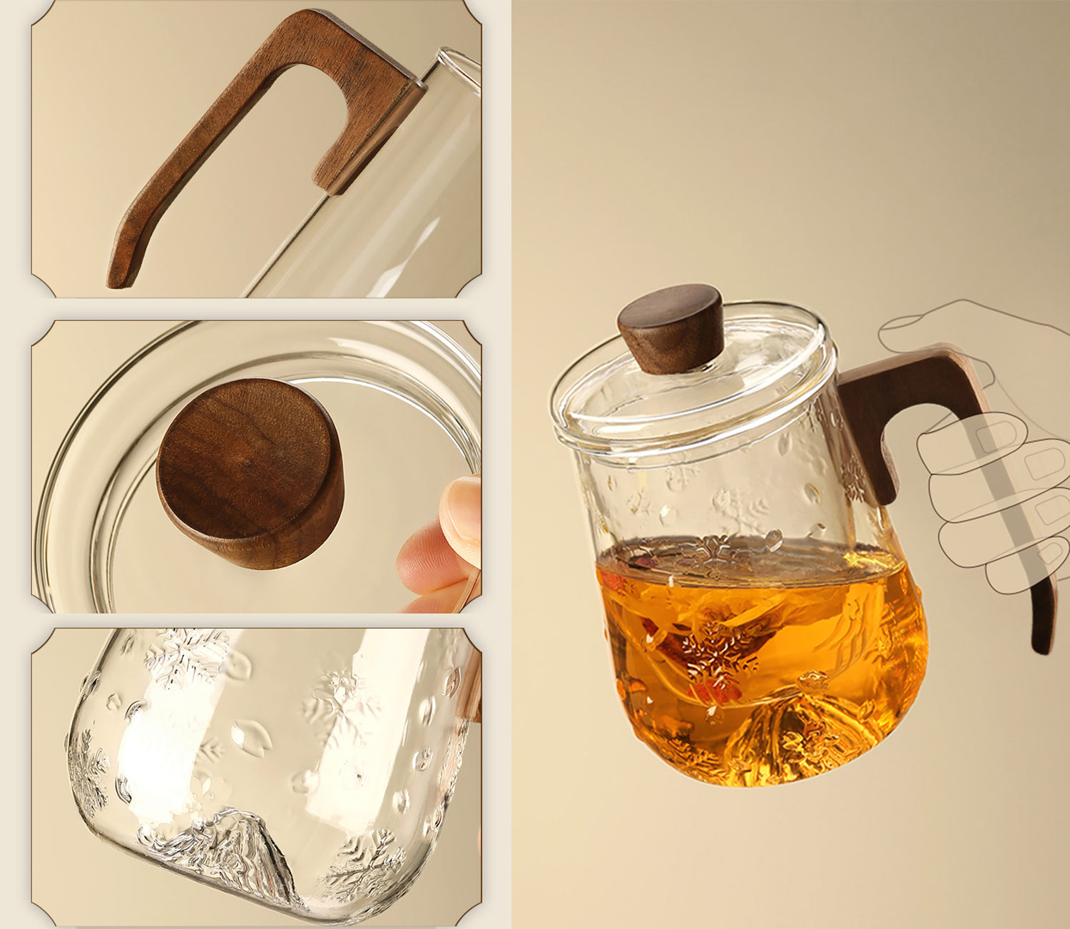 Ce mug à infusion en verre soufflé à la main allie esthétisme et fonctionnalité. Conçue avec un compartiment à thé indépendant, elle permet de séparer facilement les feuilles de thé une fois infusées. Fabriquée en verre borosilicate de haute qualité, elle résiste aux températures extrêmes, chaudes ou froides. Le design unique de la chambre à thé, disponible en versions "Montagne de glace" et "Flocon de neige", crée un effet visuel saisissant lors de l'infusion. La poignée et le bouton en bois de noyer ajoutent une touche naturelle et élégante.