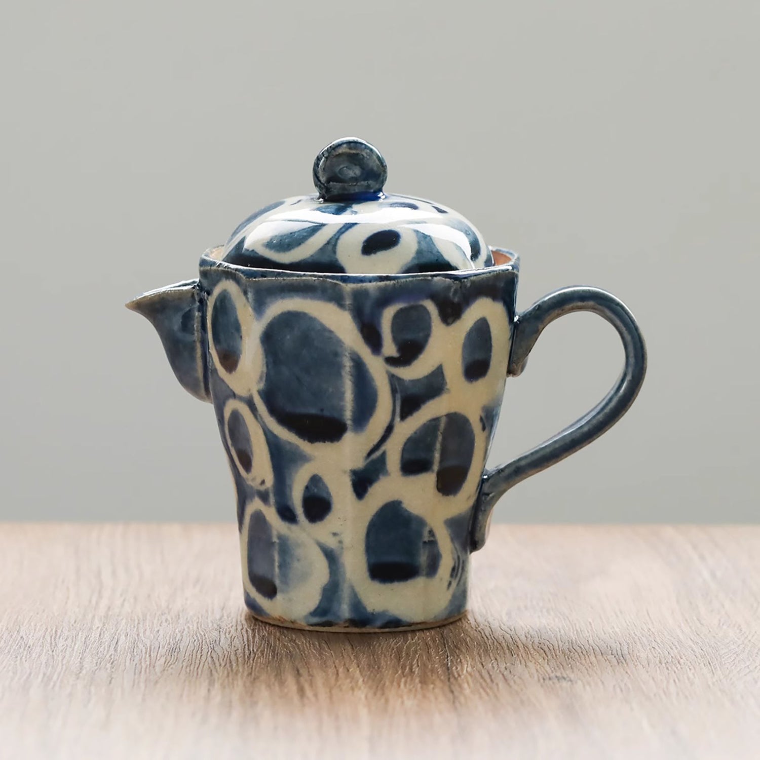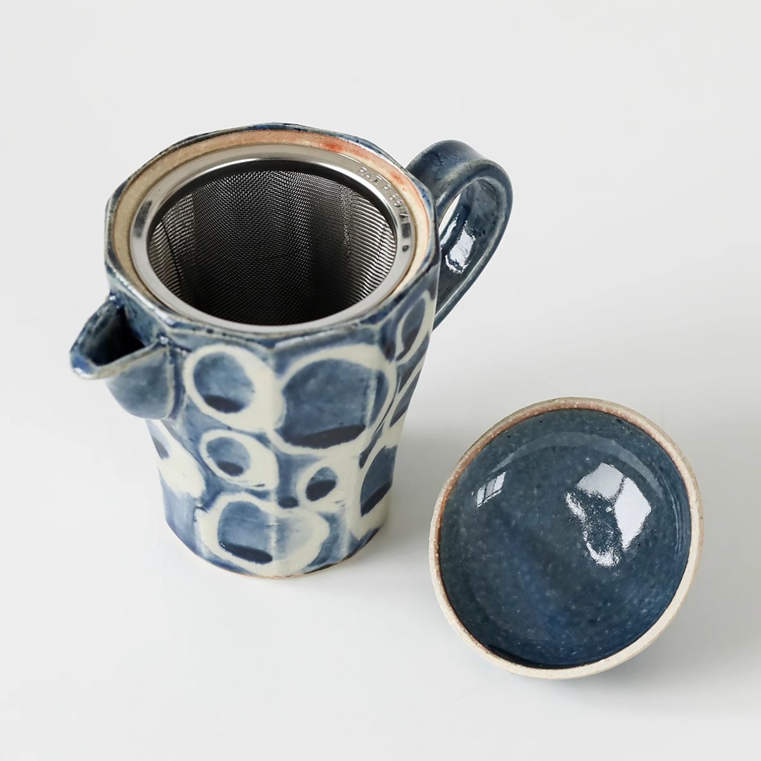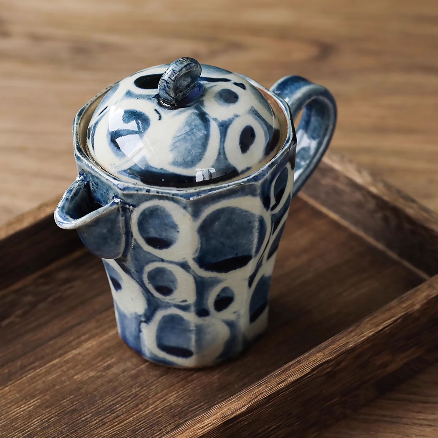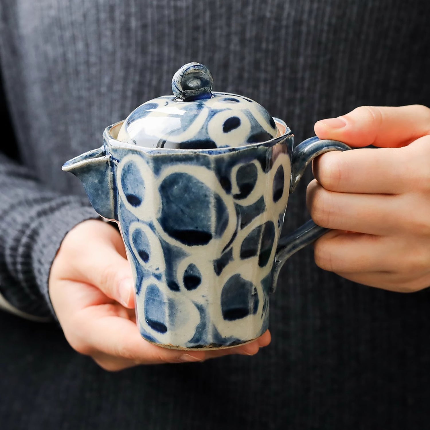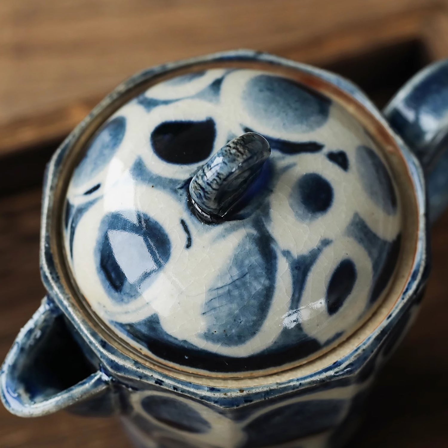 Cette théière artisanale en céramique de Seto est un chef-d'œuvre de l'art japonais. Les motifs indigo de fleurs et l'effet craquelé sont peints à la main selon la technique traditionnelle de Seto-yaki.
