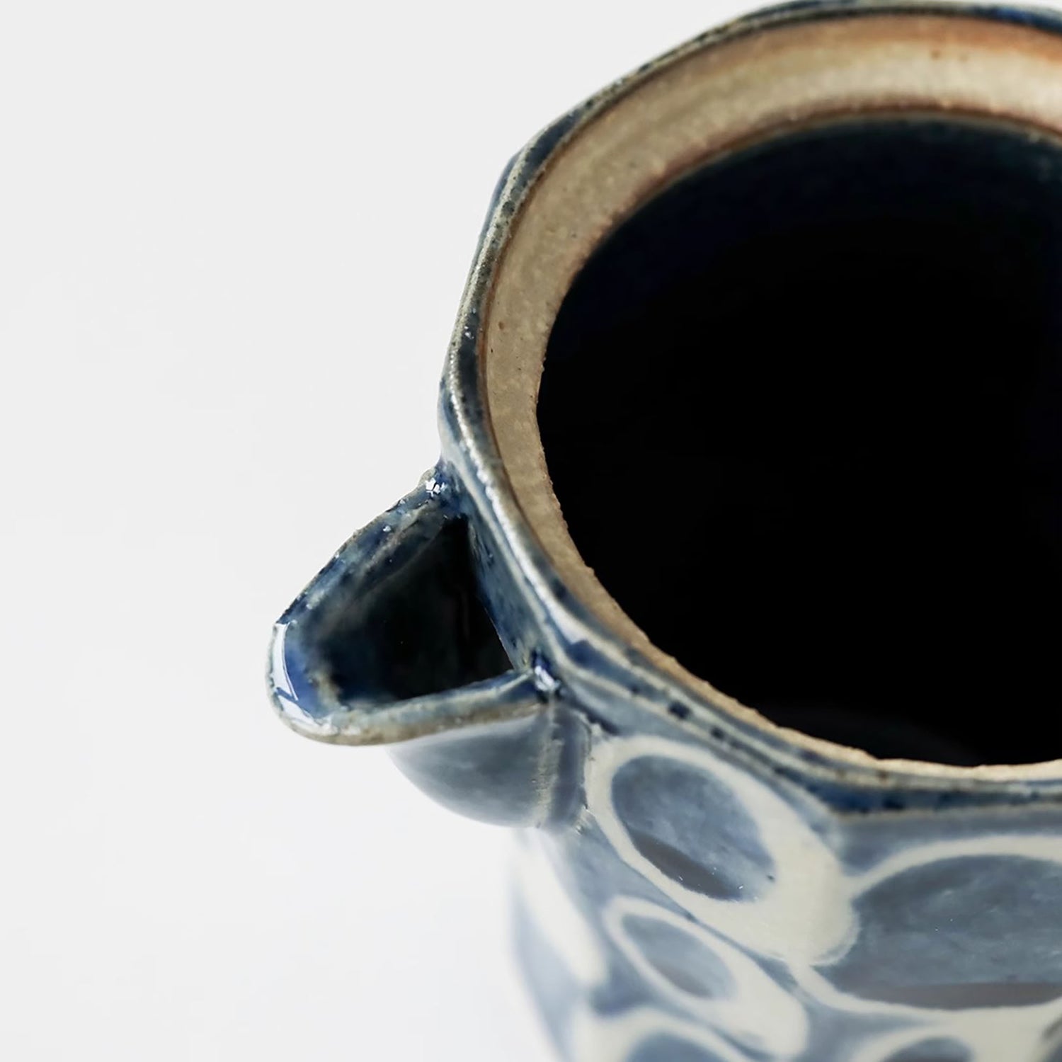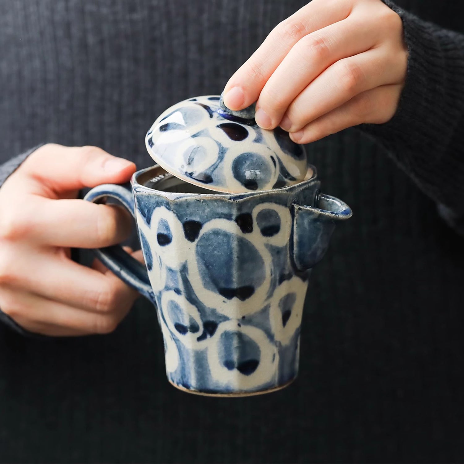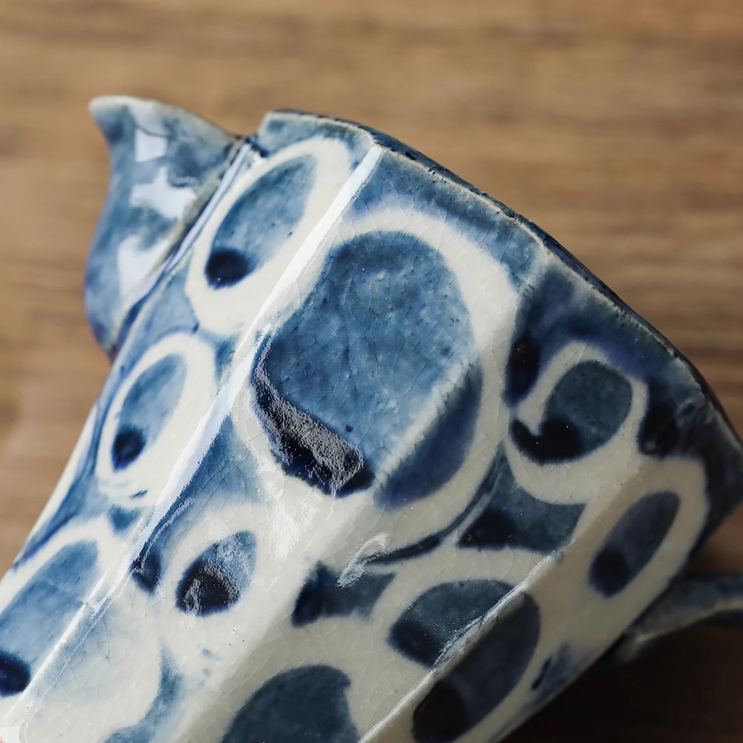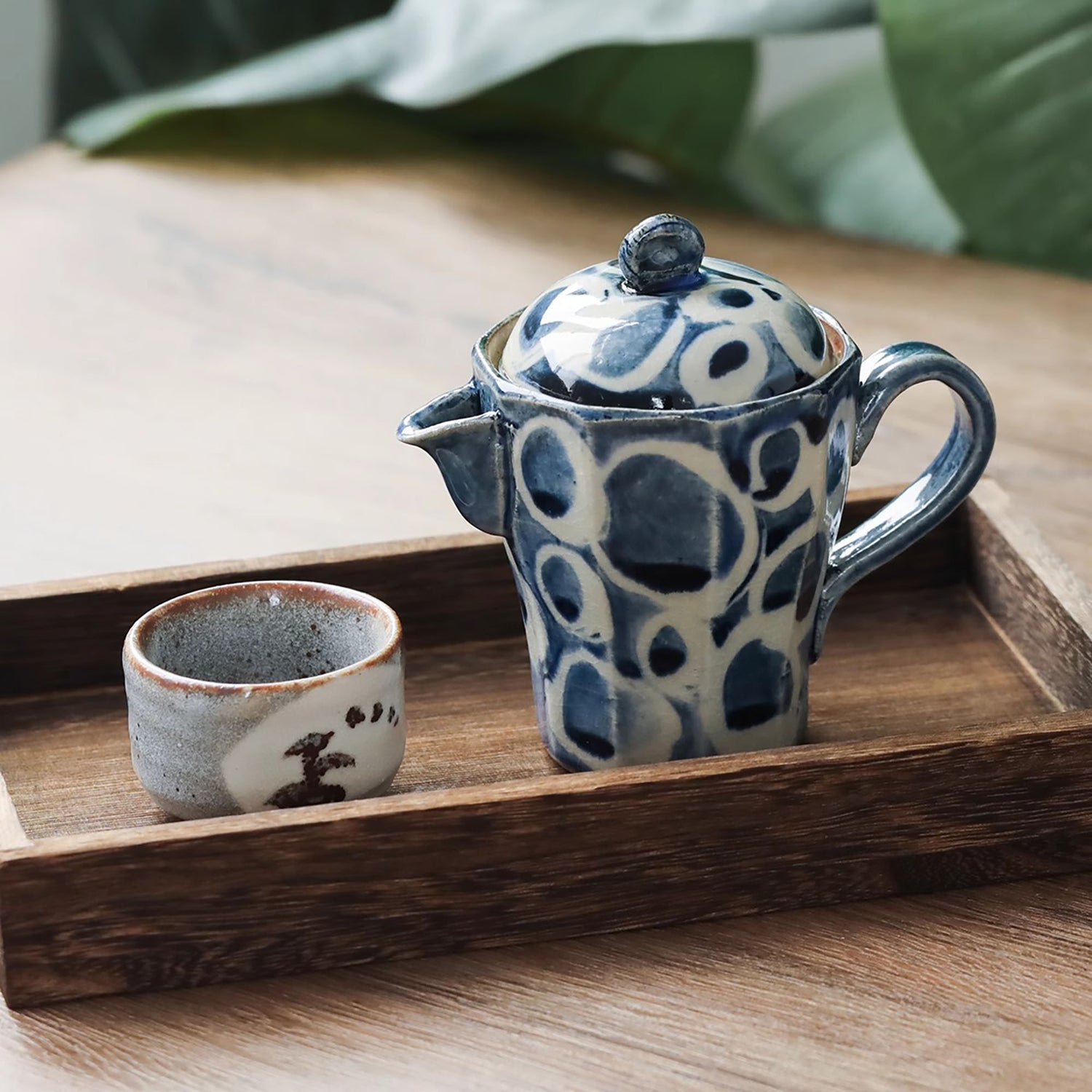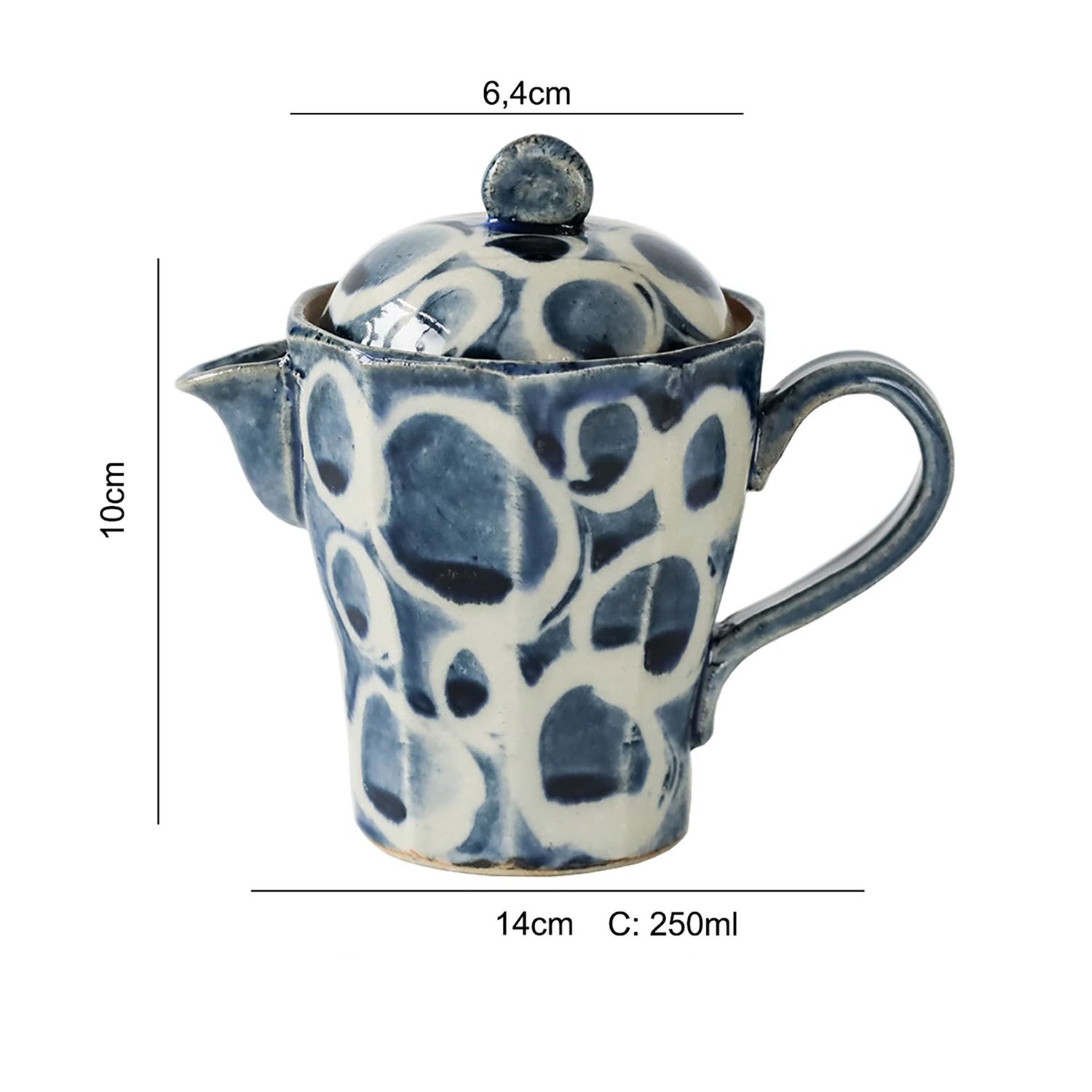 Cette théière artisanale en céramique de Seto est un chef-d'œuvre de l'art japonais. Les motifs indigo de fleurs et l'effet craquelé sont peints à la main selon la technique traditionnelle de Seto-yaki.