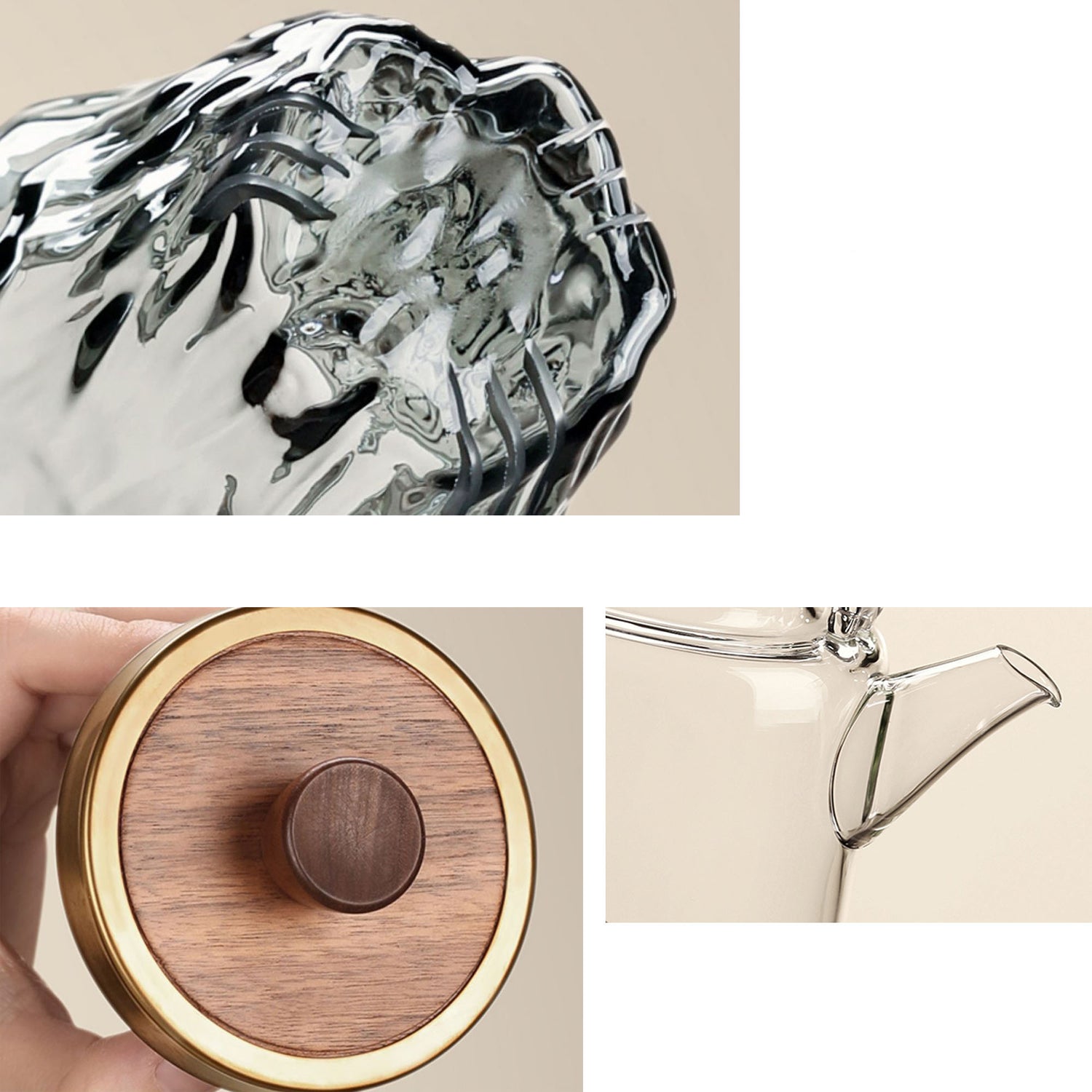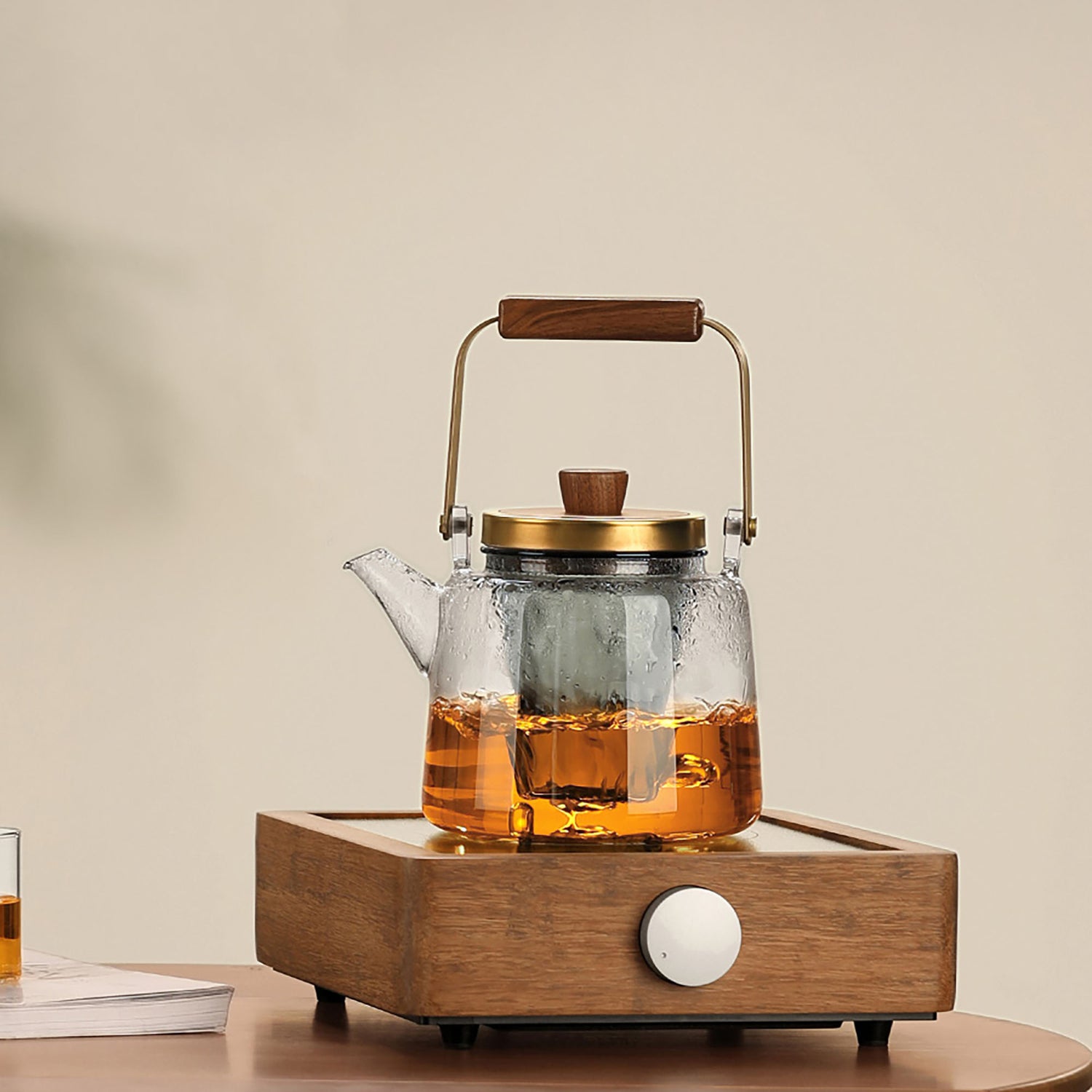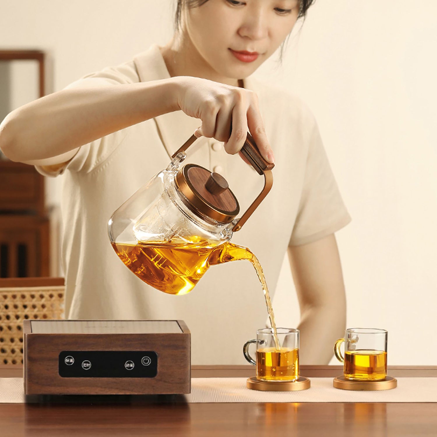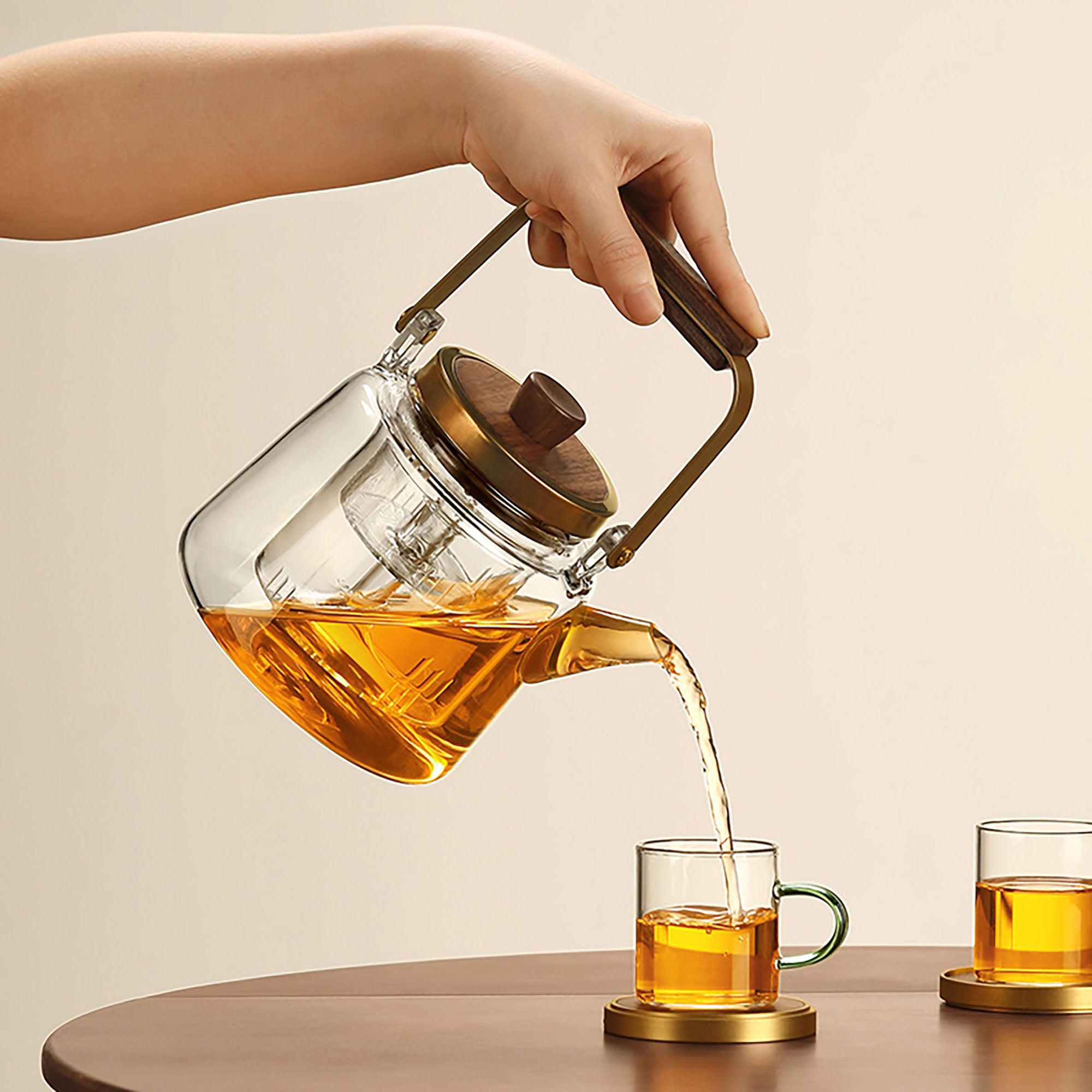 Cette théière en verre soufflé à la main est fabriquée en borosilicate de haute qualité, résistante aux chocs thermiques, garantissant une utilisation sûre et durable. Son infuseur intégré permet de séparer facilement les feuilles de thé et l'eau, facilitant le nettoyage et le contrôle du temps d'infusion. Le design unique de l'infuseur, en plus d'être esthétique, prend en charge à la fois les méthodes d'infusion à la vapeur et à l'ébullition, offrant une expérience visuelle unique. L'anse en métal associée au bouton en noyer confère une simplicité rustique et un confort de prise en main. Compatible avec les plaques chauffantes en céramique, elle est pratique et idéale pour un usage quotidien.
