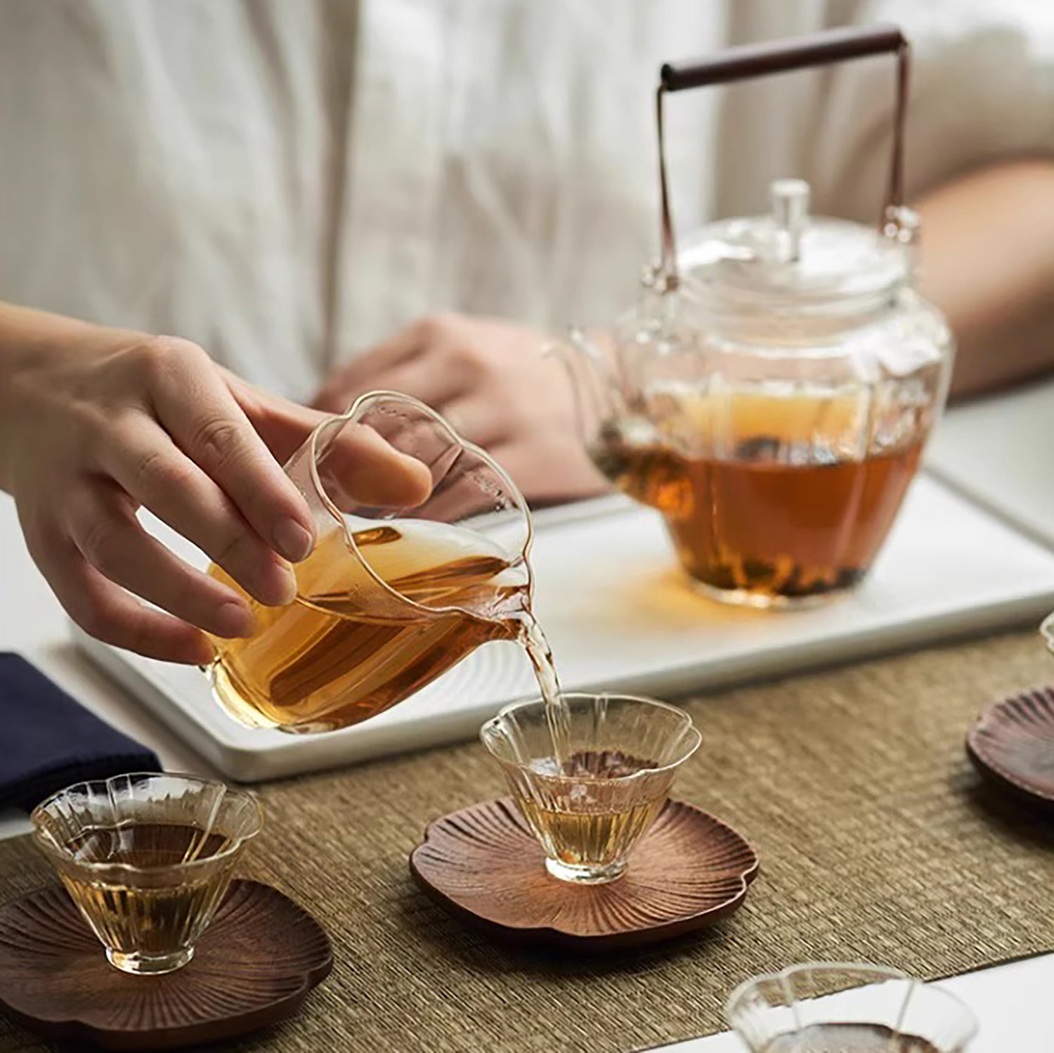 Conçue en verre borosilicate de haute qualité, cette théière en forme de fleur de prunier allie esthétique traditionnelle et fonctionnalité moderne – elle peut être chauffée directement à la flamme. La anse en bois de noyer apporte une touche chaleureuse et authentique.