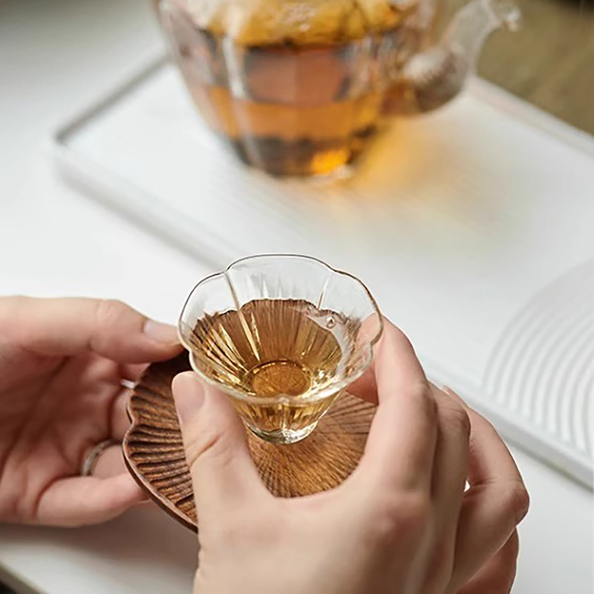 Accompagnée de tasses en verre en forme de fleur d’hibiscus et de sous-verres aux motifs de bois de noyer, cet ensemble sublime vos moments de thé avec une ambiance douce, délicate et empreinte de raffinement oriental.